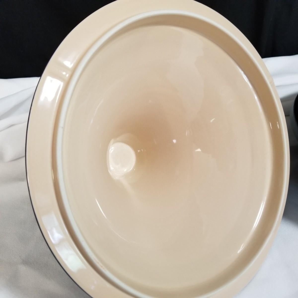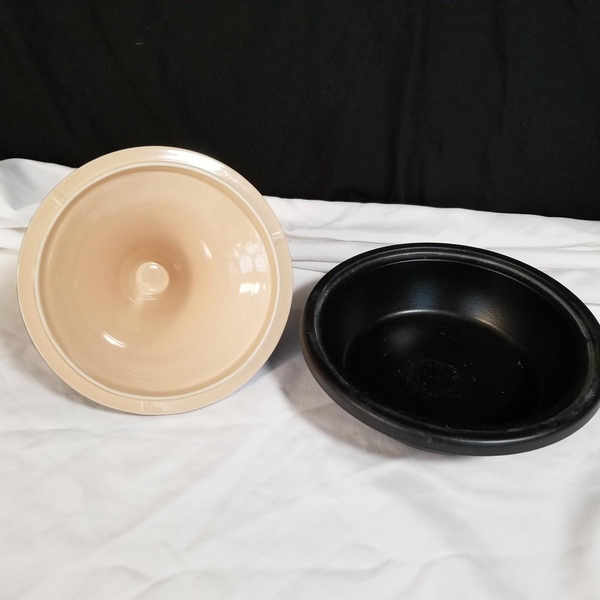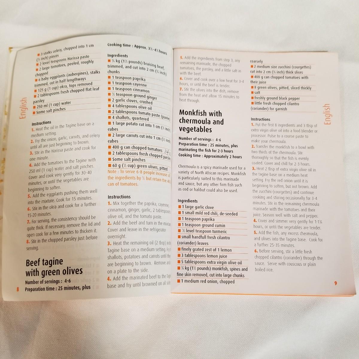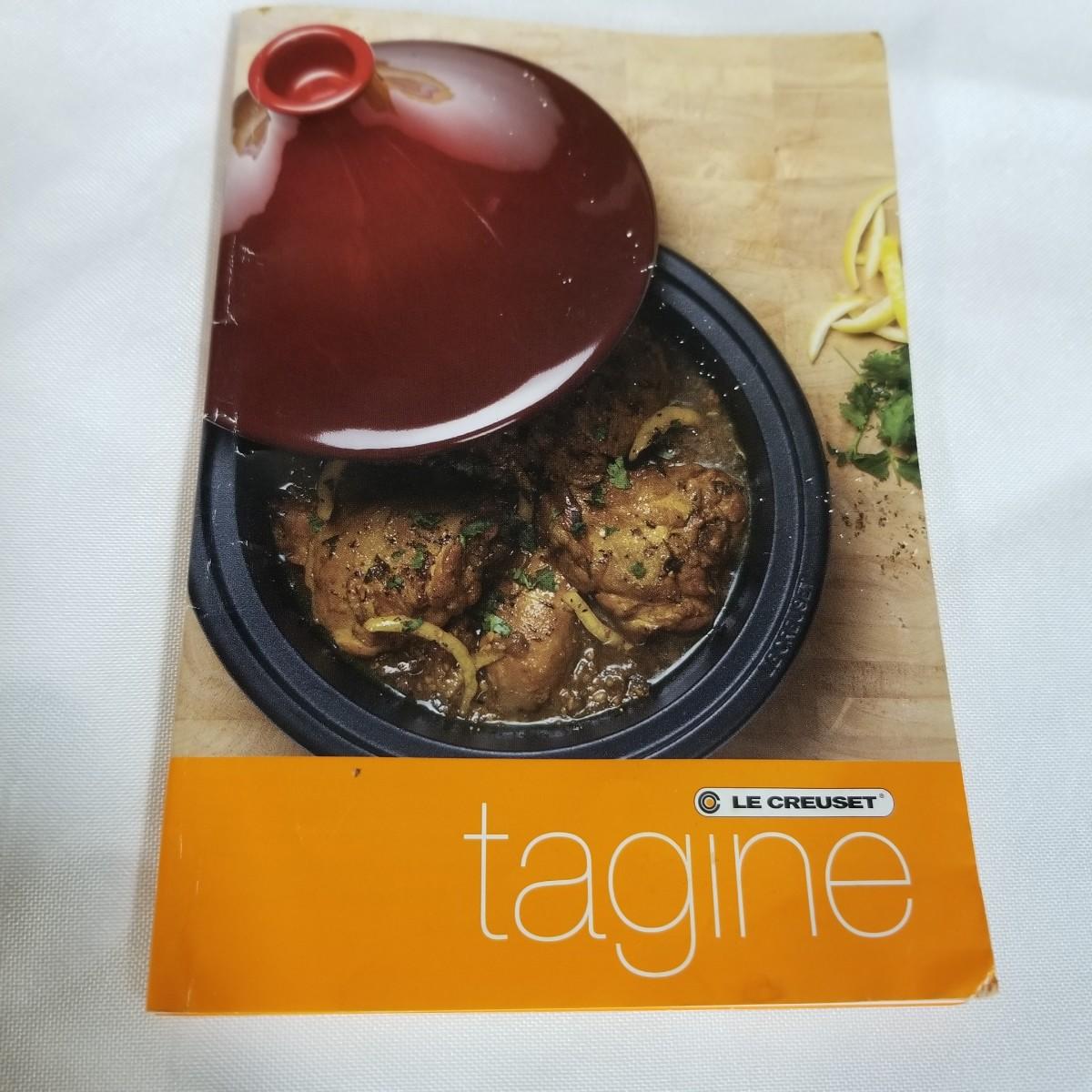 Blue/black LeCreuset cooking vessel for tagine style recipes. Heavy ceramic components, item is 11"x9" and comes with instructions and recipes. See photos for details. Shipping available.