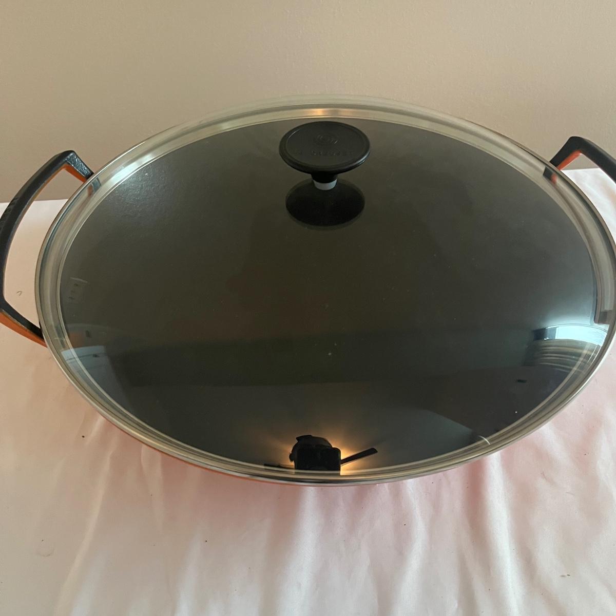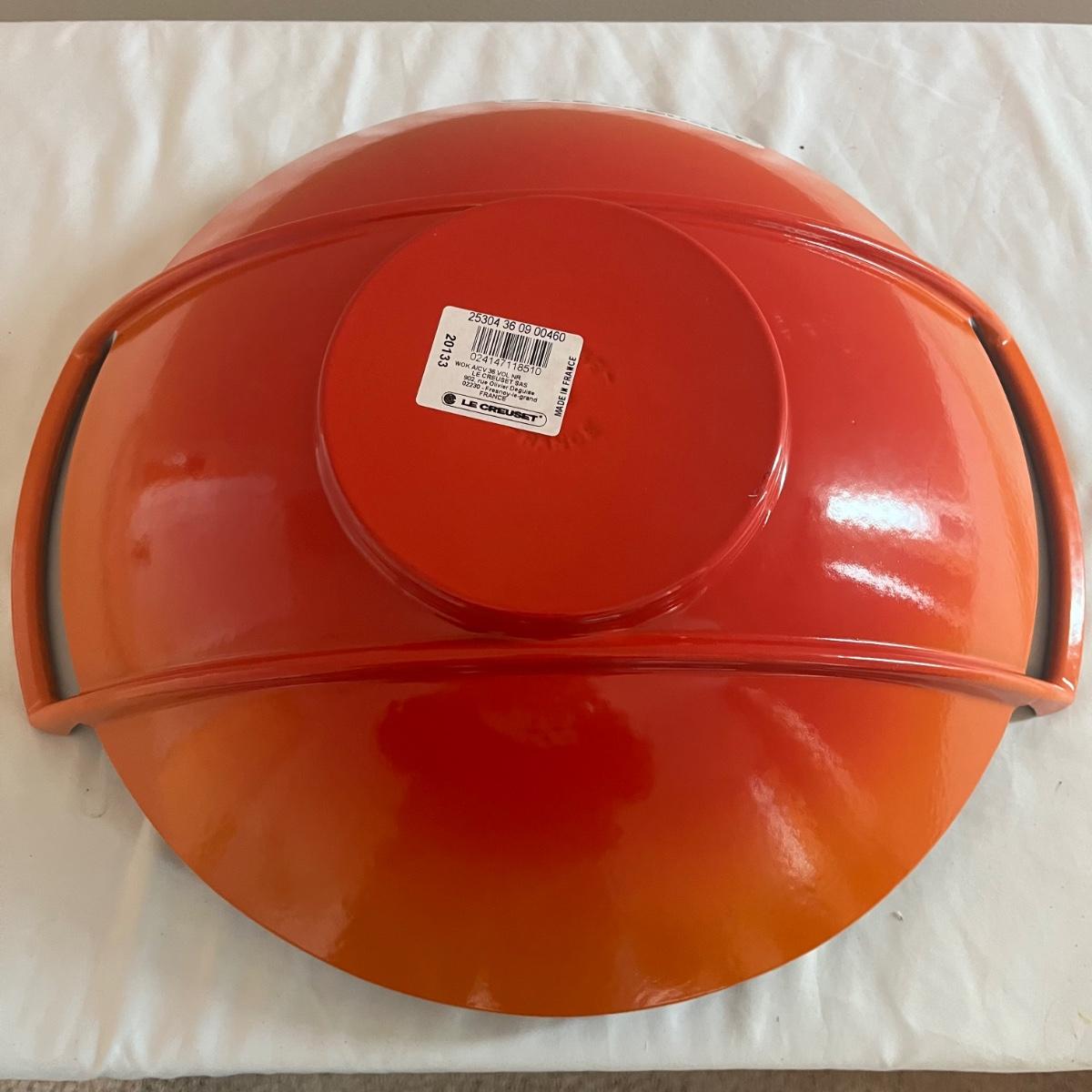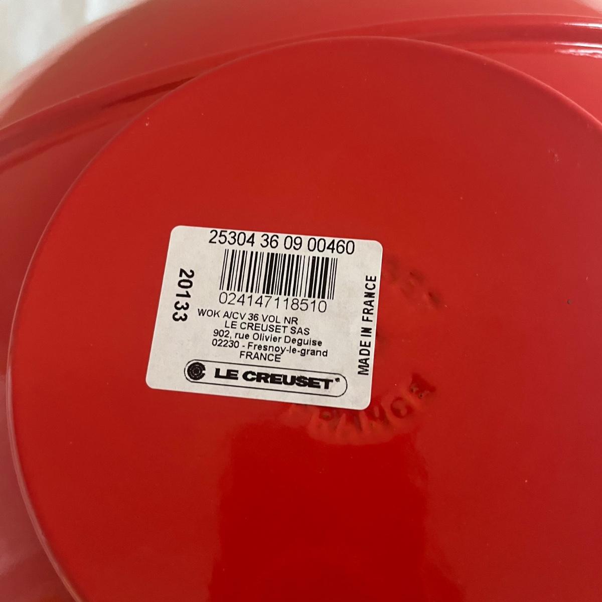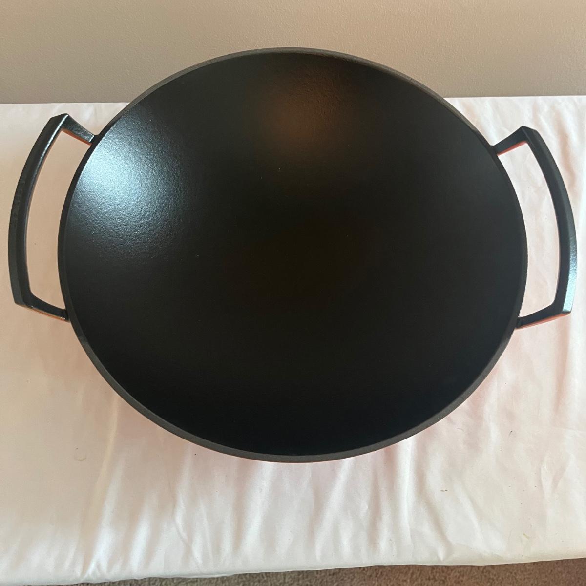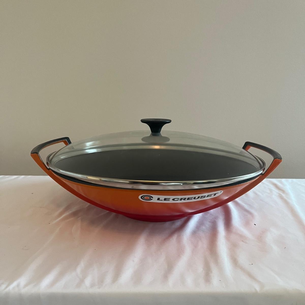 Lot includes a Le Creuset cast iron enameled wok with glass lid. Wok measures 14.5”D. Wok appears to be unused and in excellent condition.