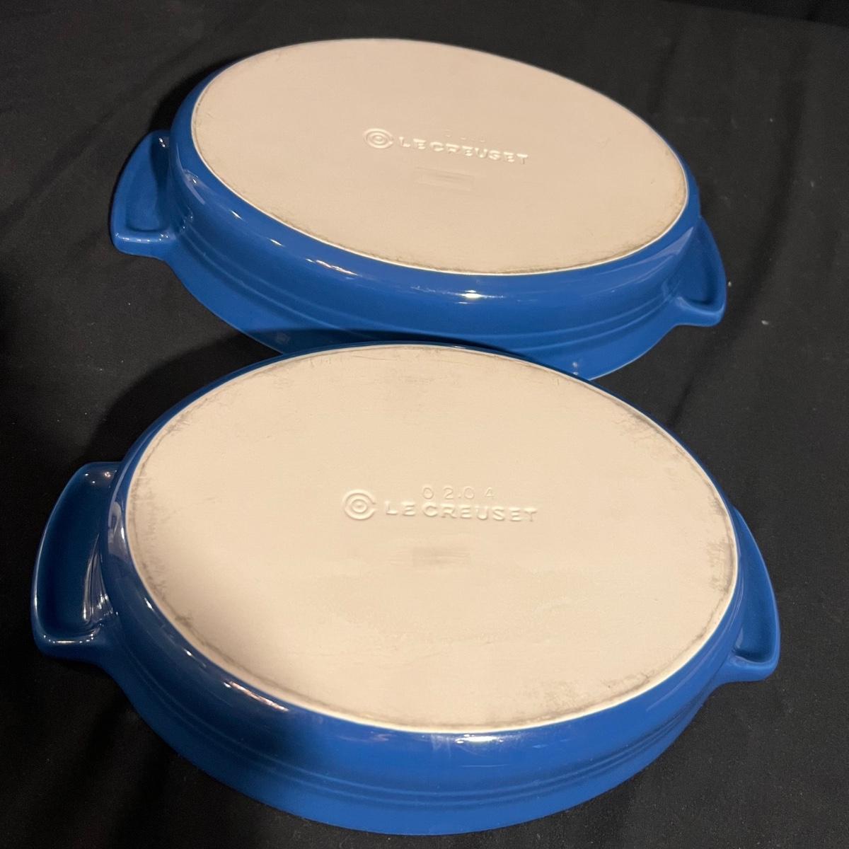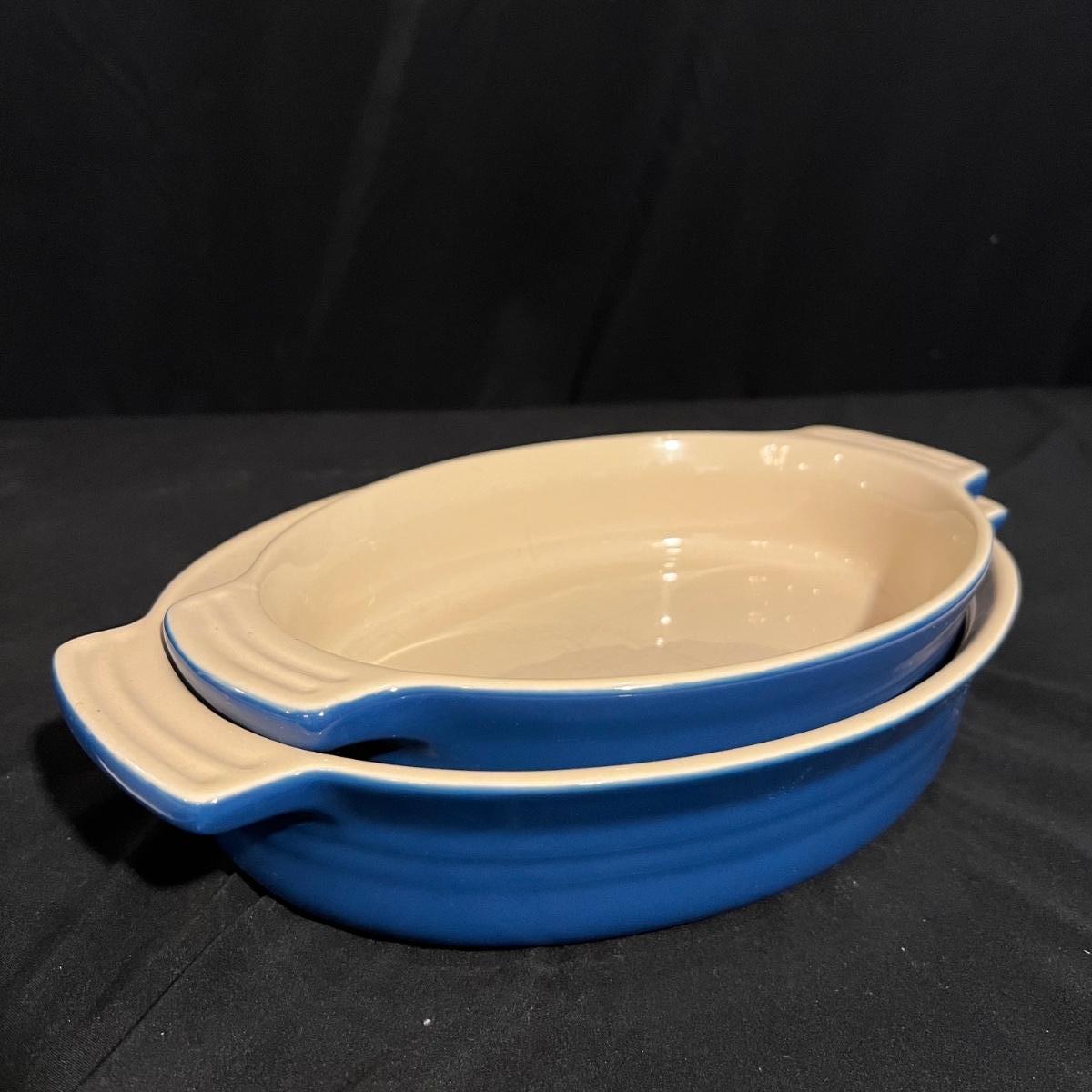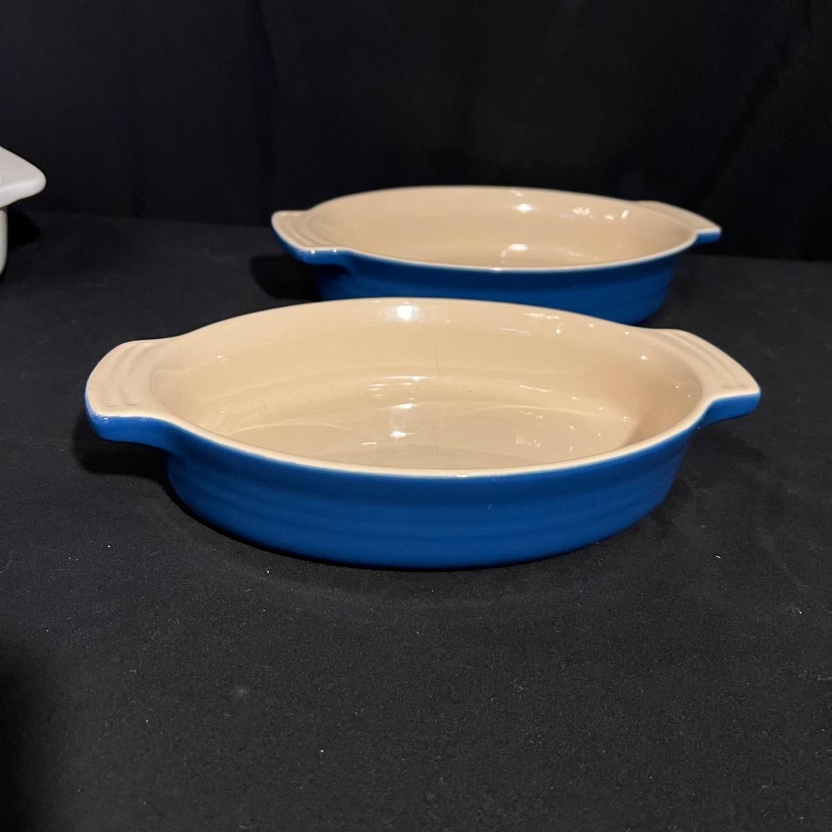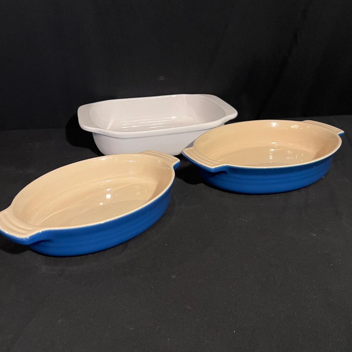 Two Le Crueset cobalt blue Au Gratin stoneware dishes with the largest measuring 9” x 12” x 2.5”H. The white Chantal handcrafted dish is 4QT.