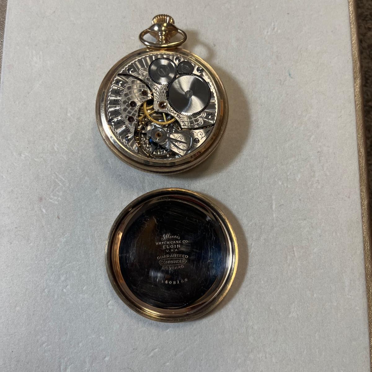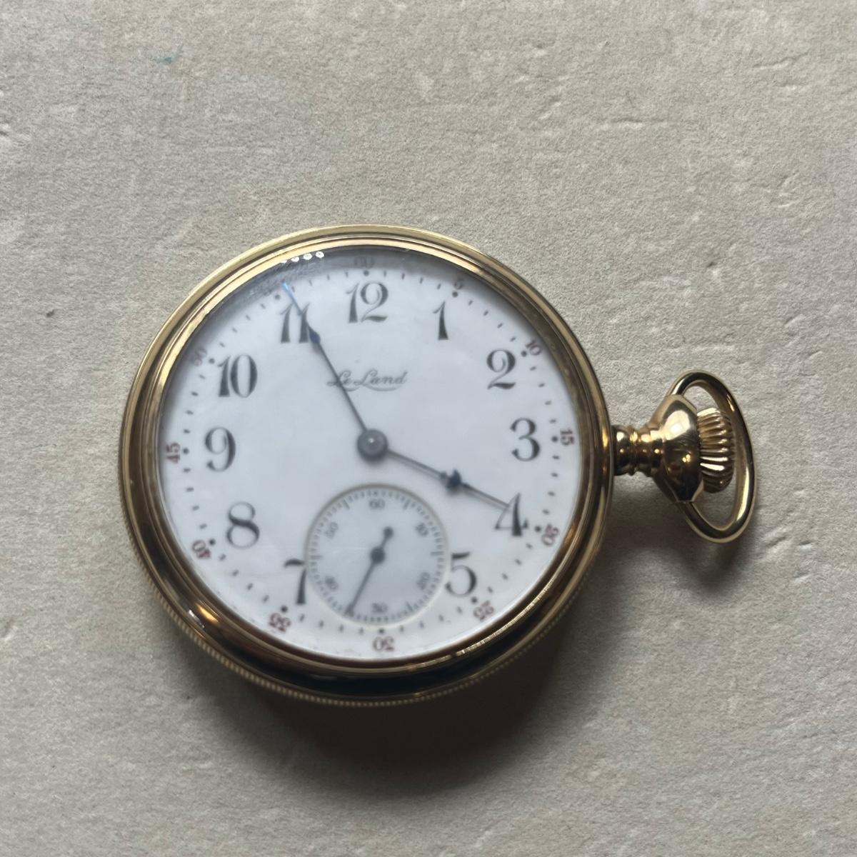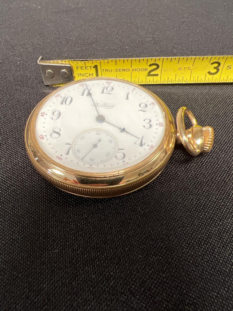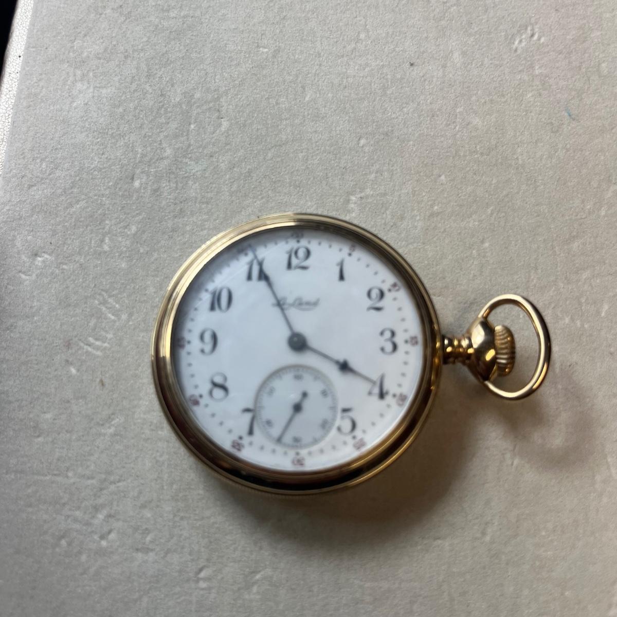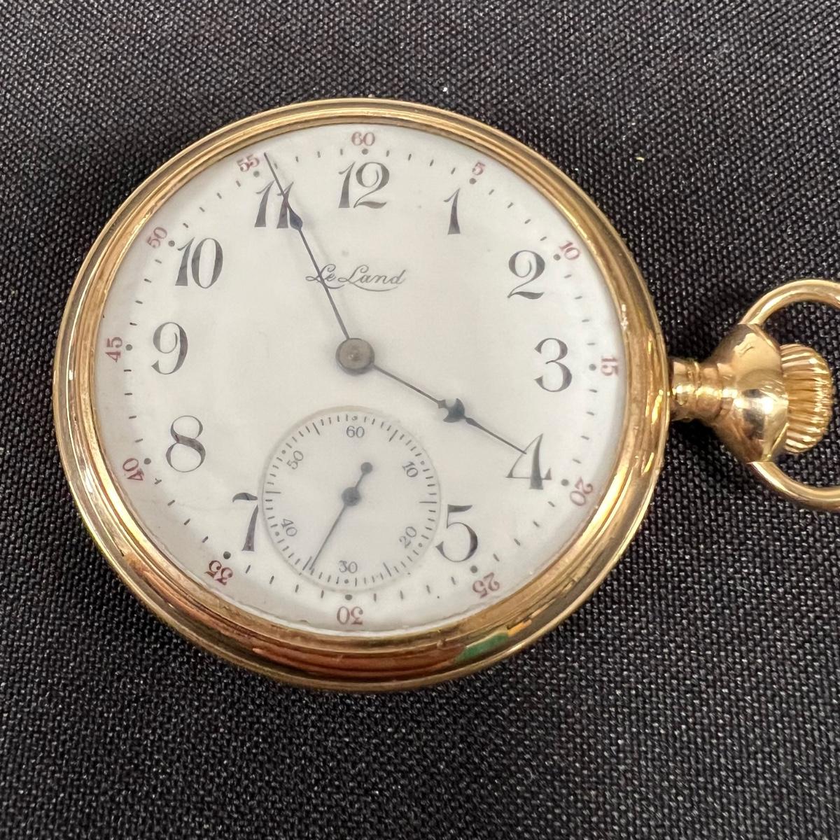 Lot includes a Le Land 17 jewel gold colored pocket watch with a Elgin case. Watch did not work when wound and clock face has a haziness to the glass. All sales are final. No returns or refunds. Please bid accordingly.
