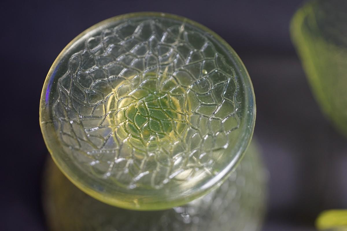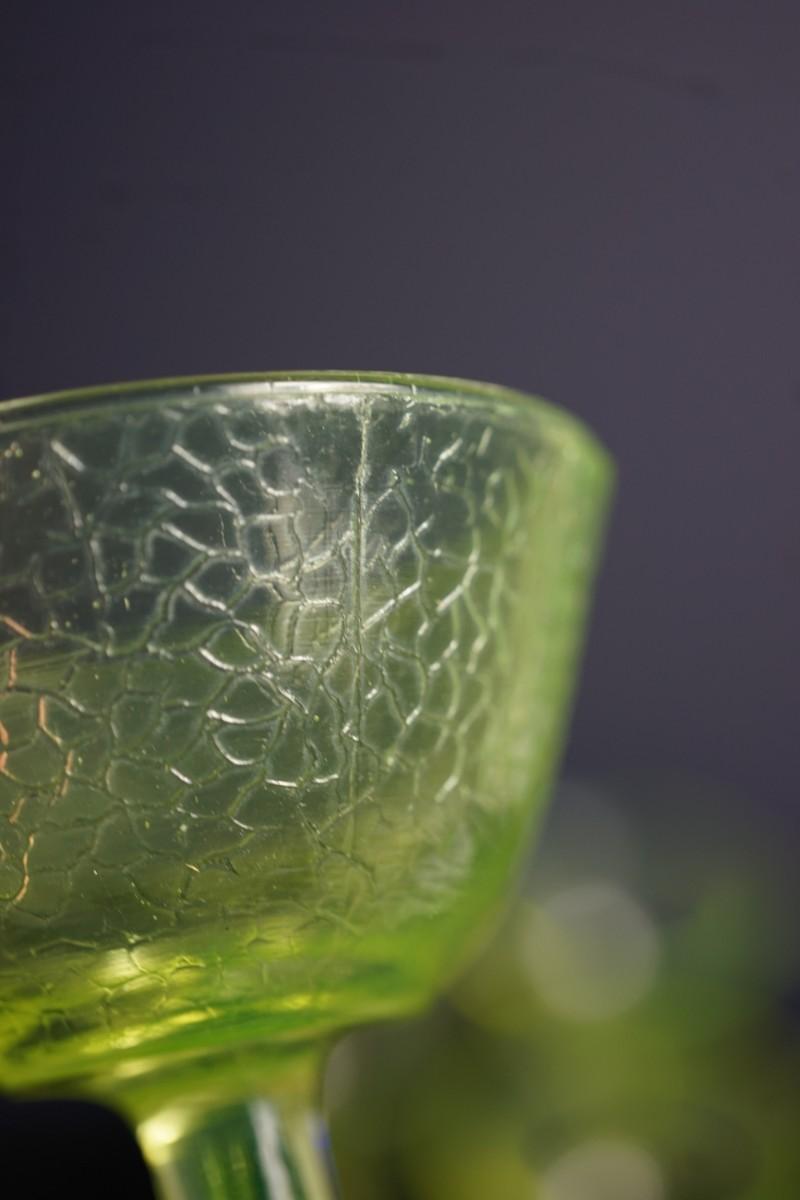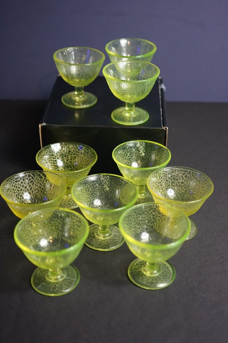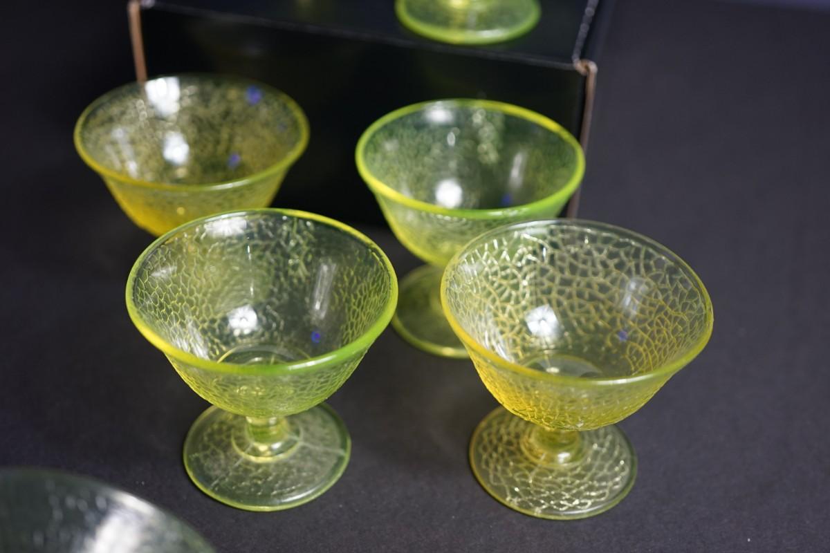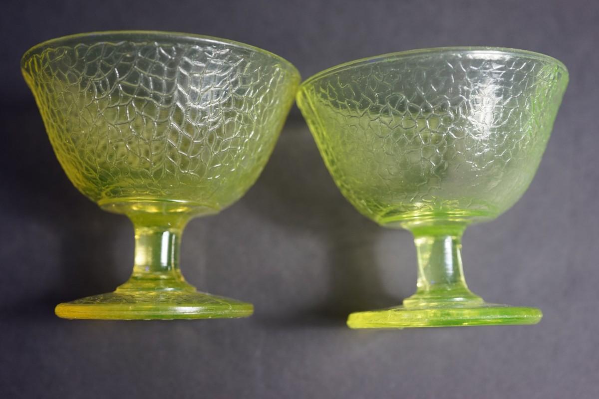 L.E Smith Glass EArly 20th century.Vaseline crackle glass sherbet dessert set