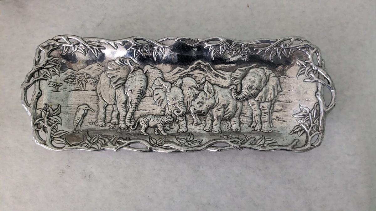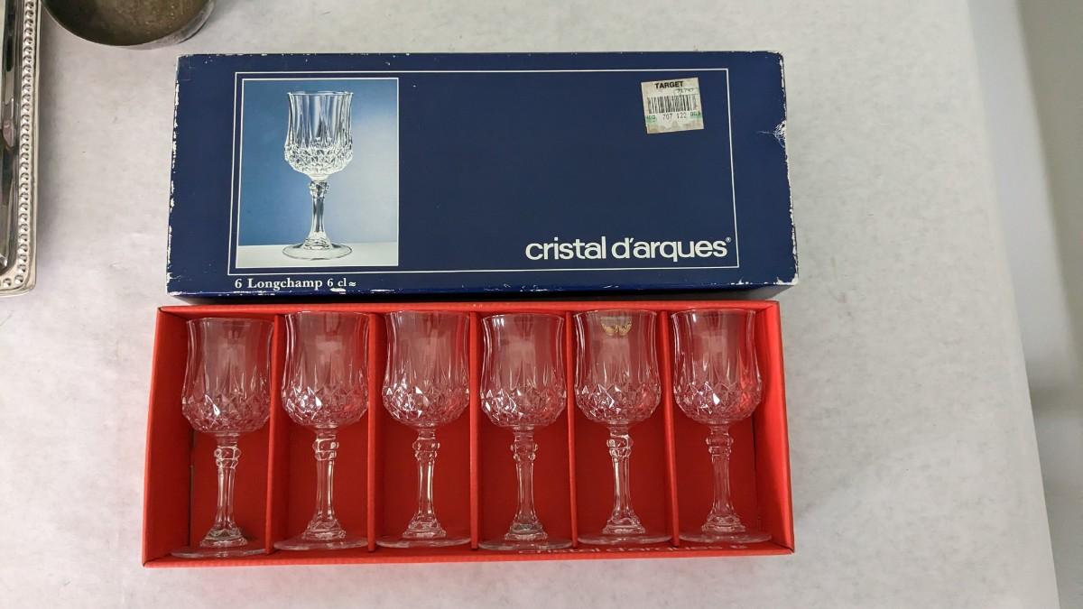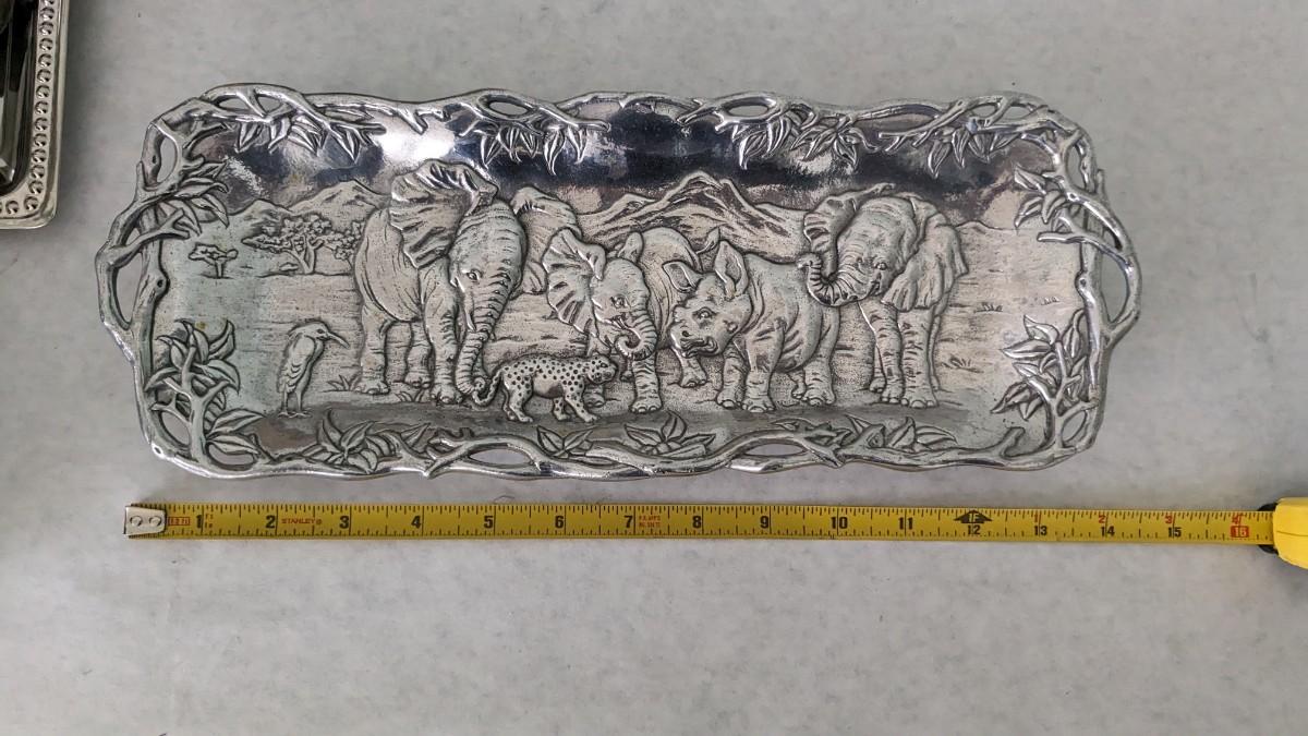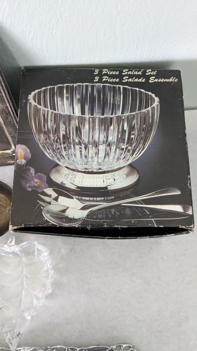 a great little assortment of in box and stickers lead crystal. All in excellent condition as well as some silverplate platters and Revere Ware dish. Varied utensils and a beautiful 1995 Arthur Court Elephant tray. Specialty handling fees will apply, inquire for more details. livingroom