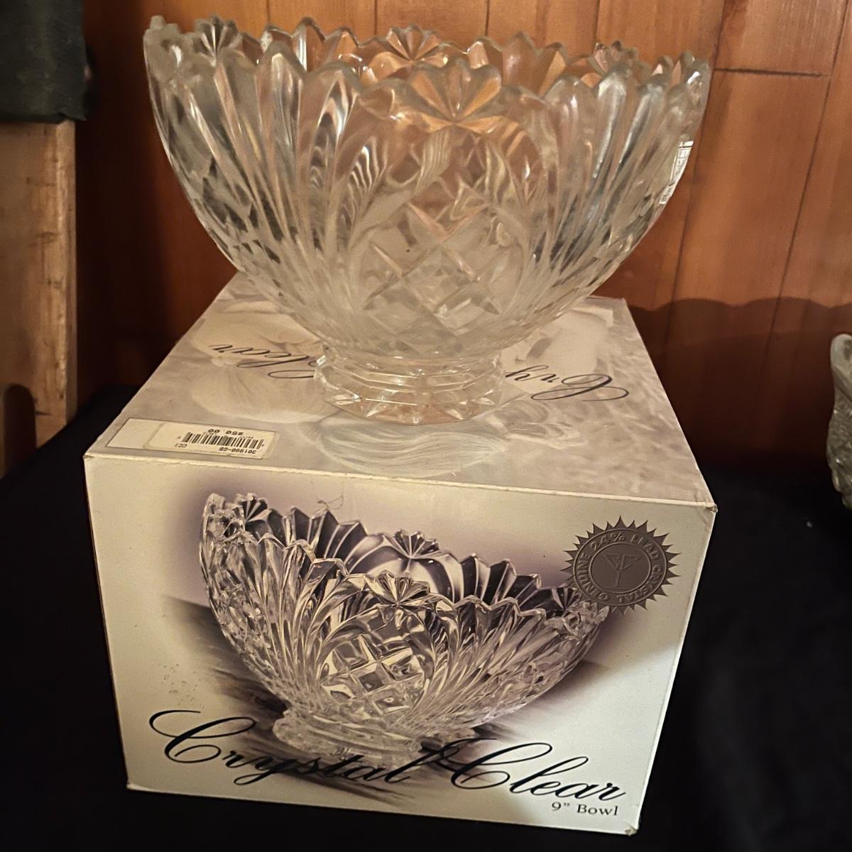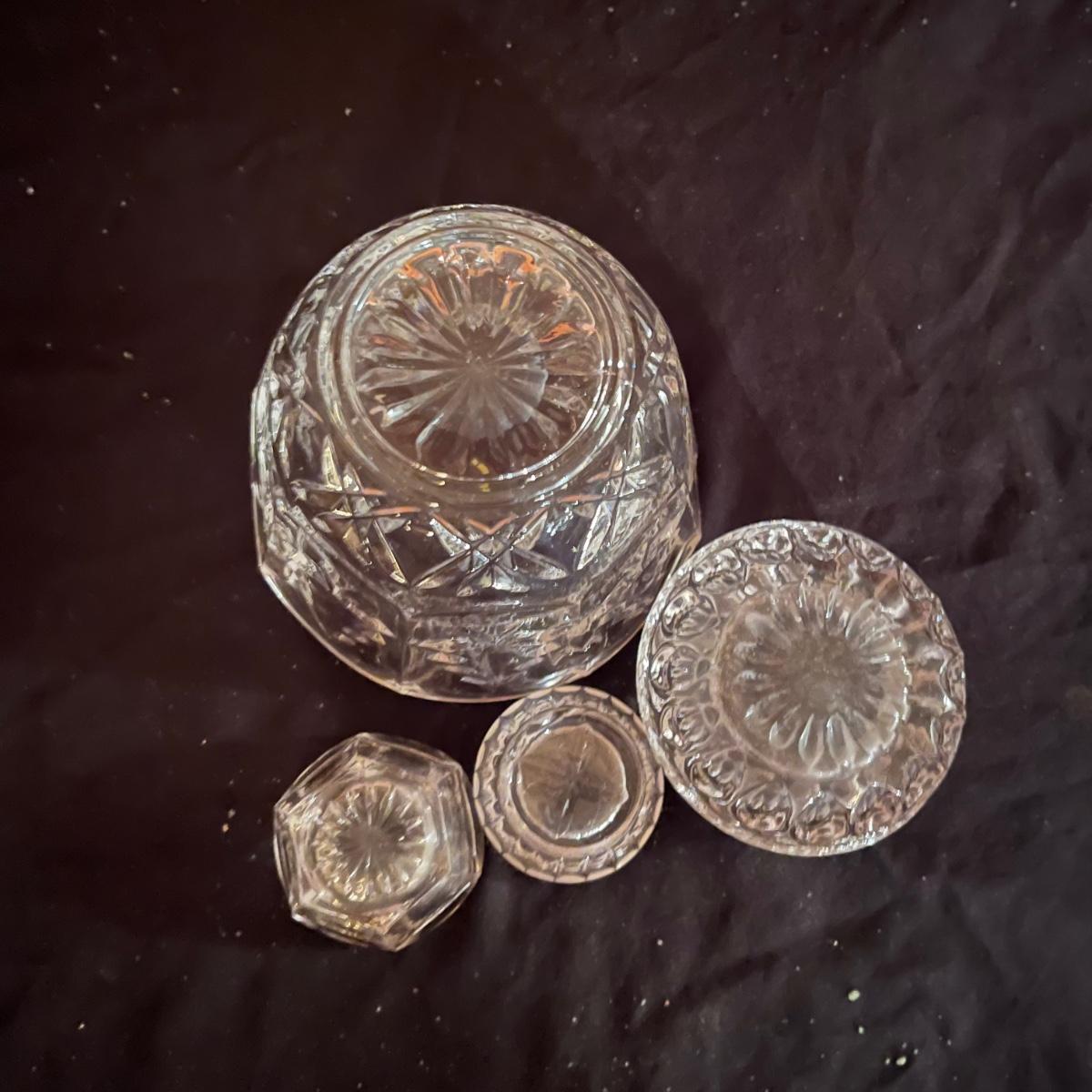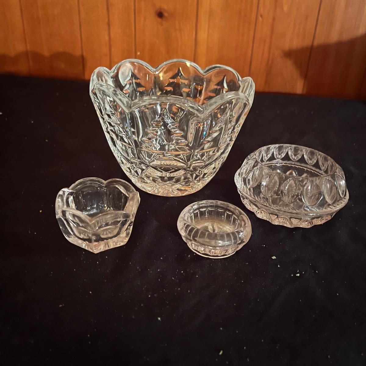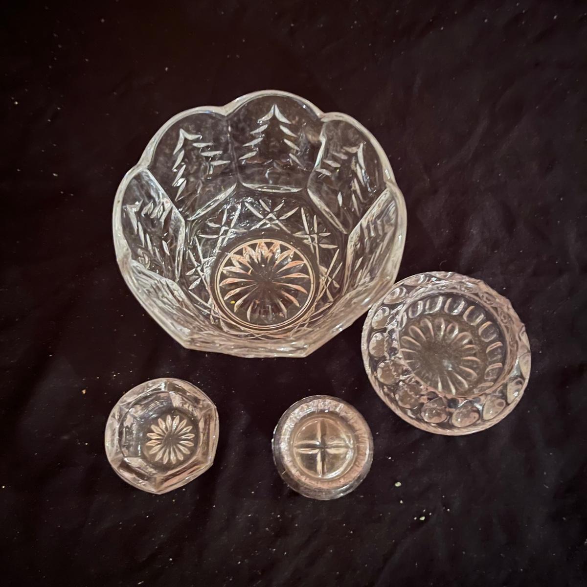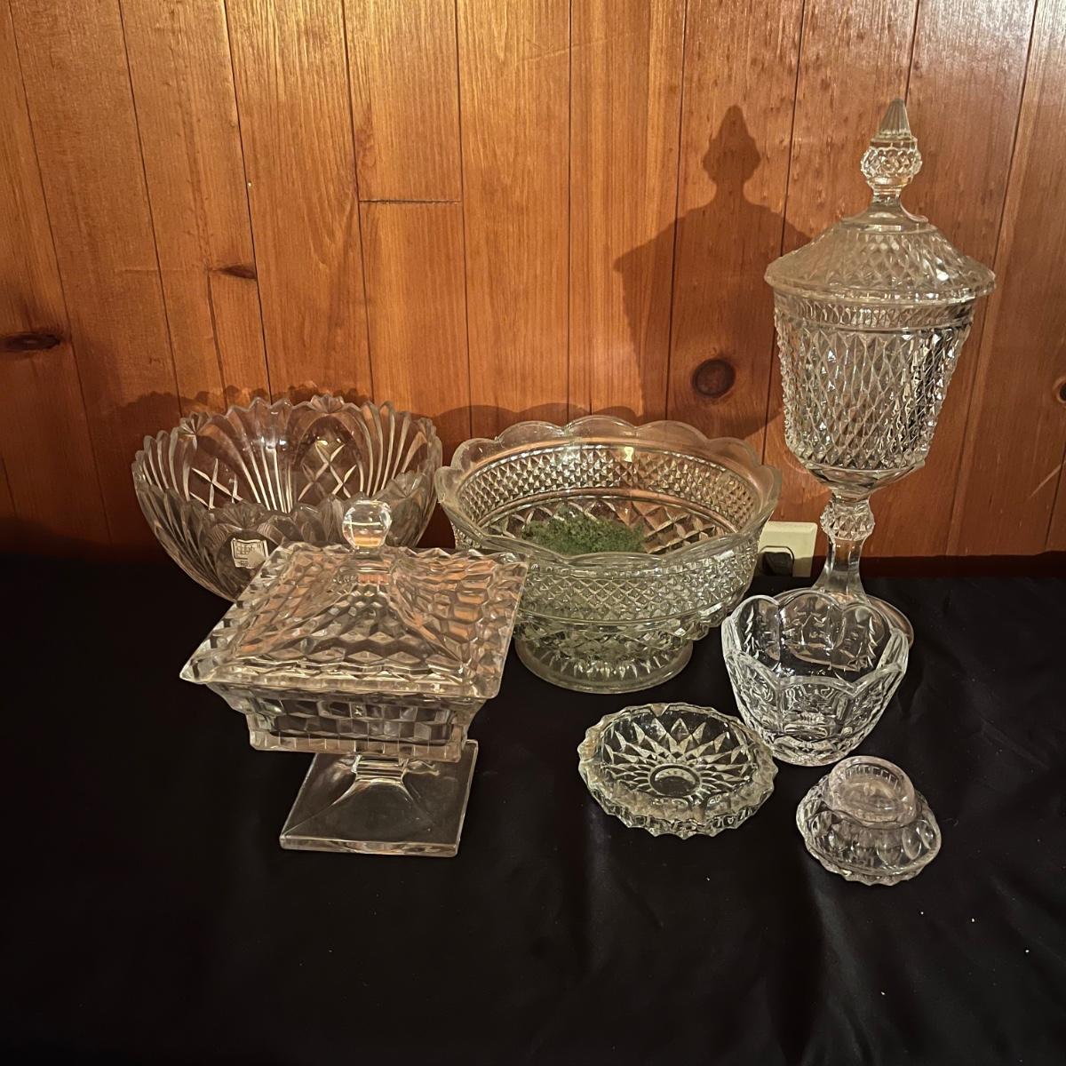Lot includes a Meridian lead crystal bowl, formed glass bowl, two foot bowls with lids, ashtray, small bowl and more.