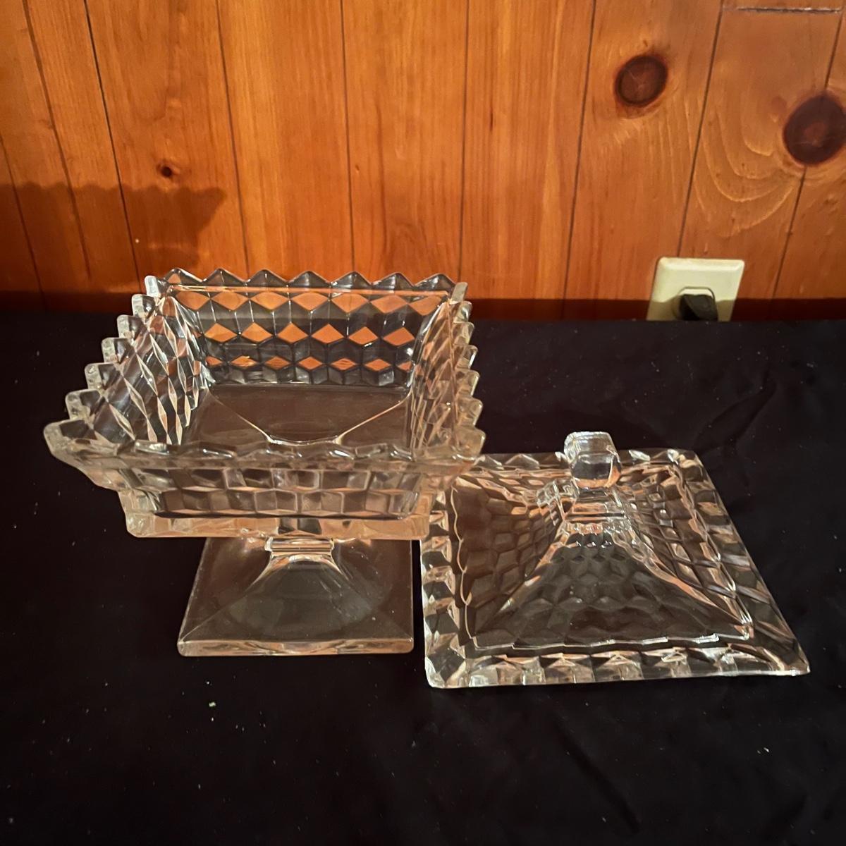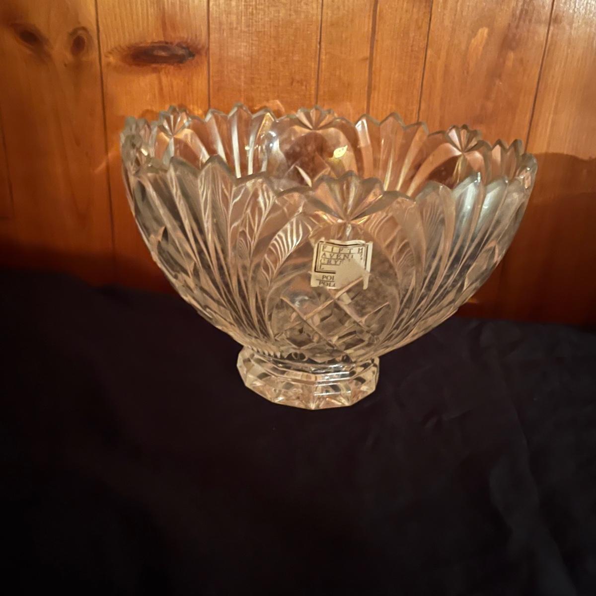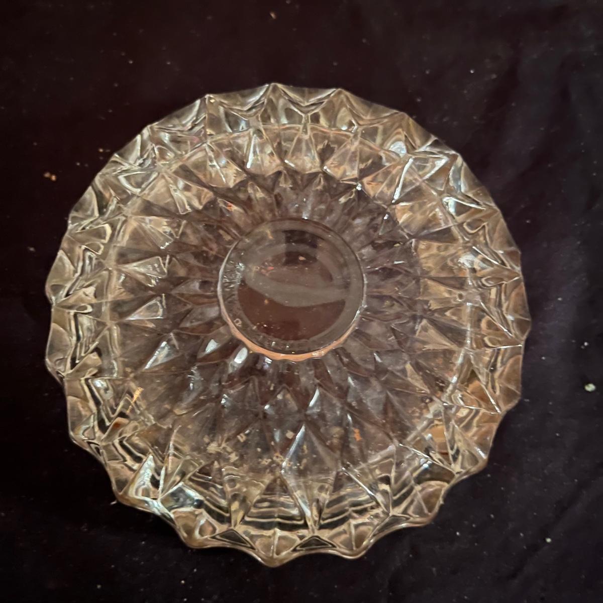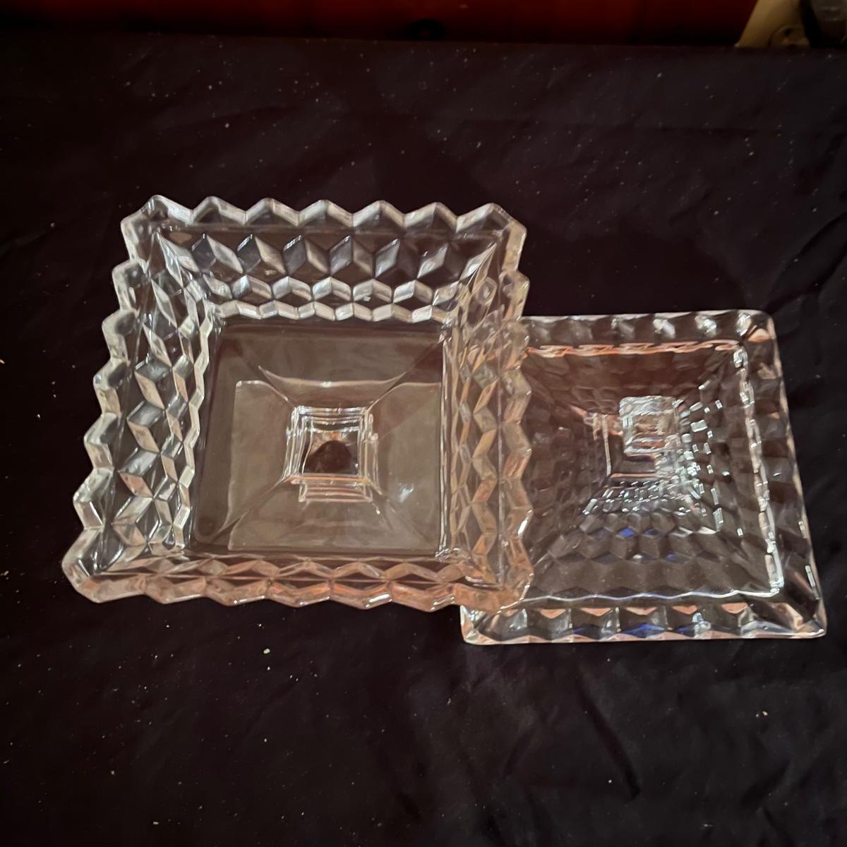 Lot includes a Meridian lead crystal bowl, formed glass bowl, two foot bowls with lids, ashtray, small bowl and more.