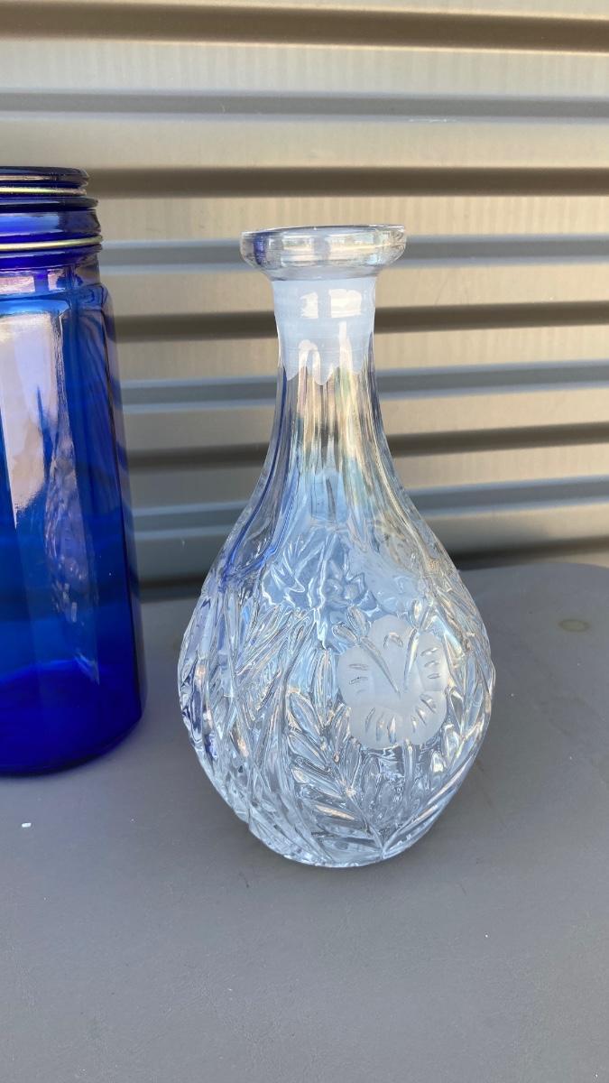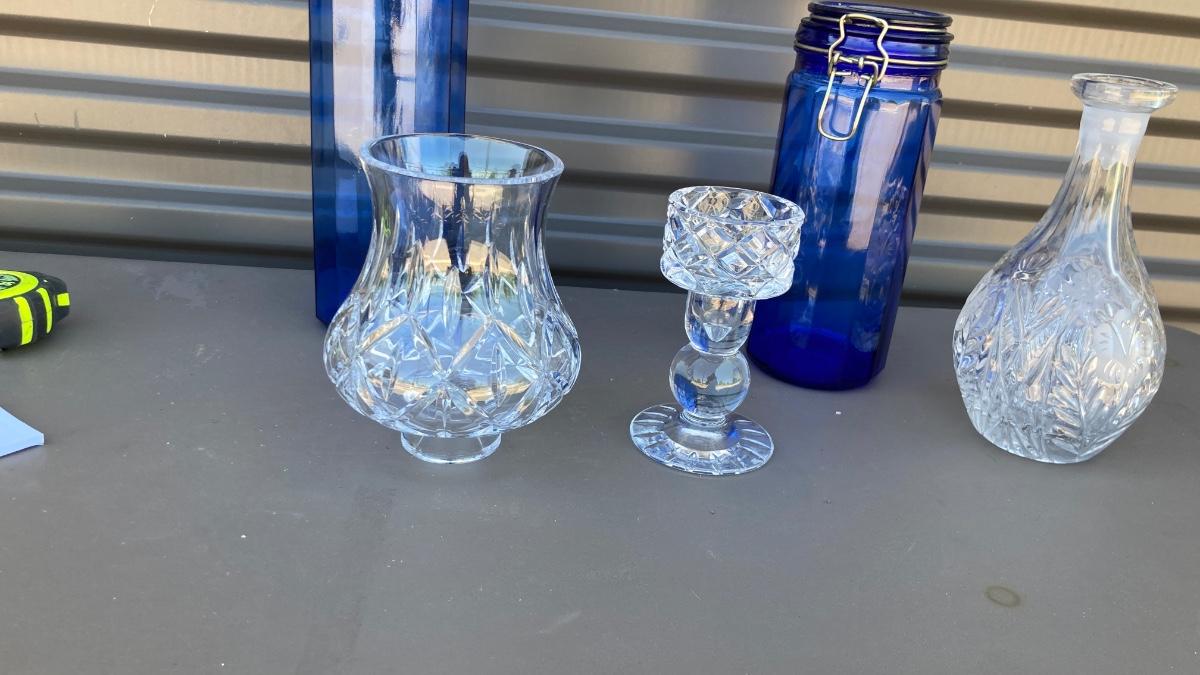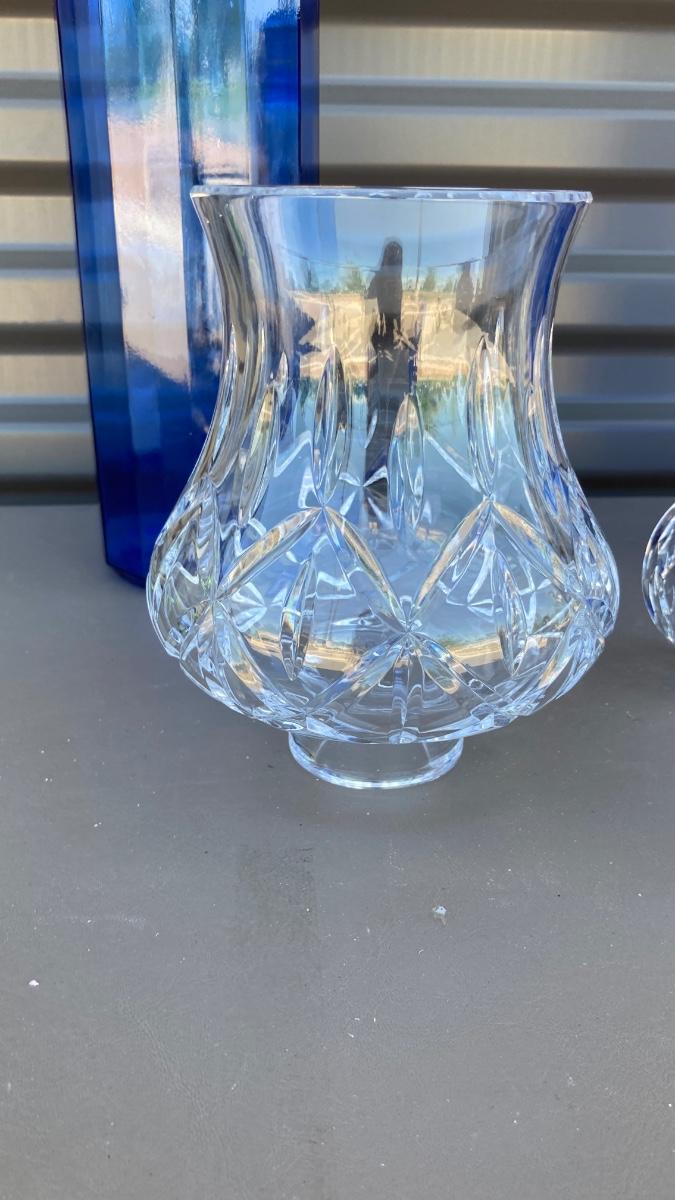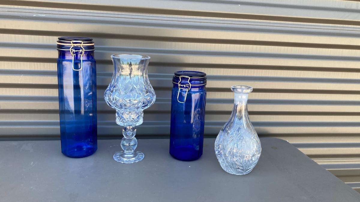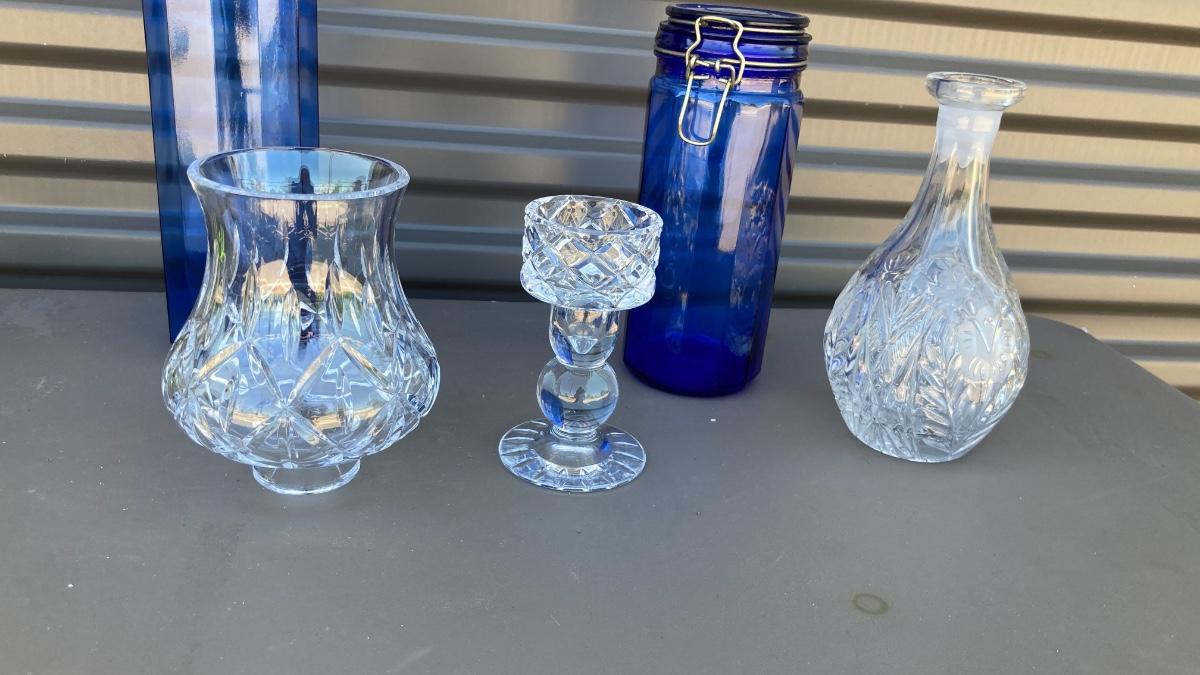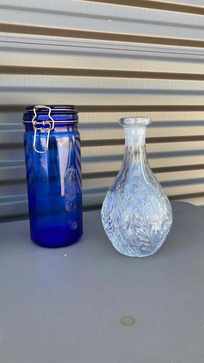 LEAD CRYSTAL CANDLE •¯ï¸ HOLDER AND COBALT BLUE CANISTERS, GLASS Decanter with no stopper