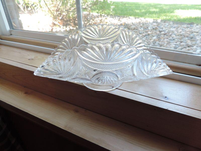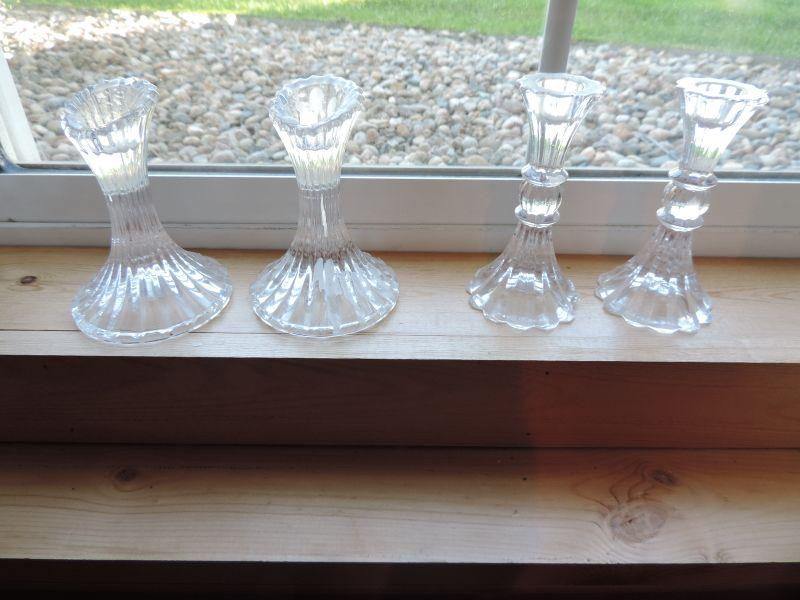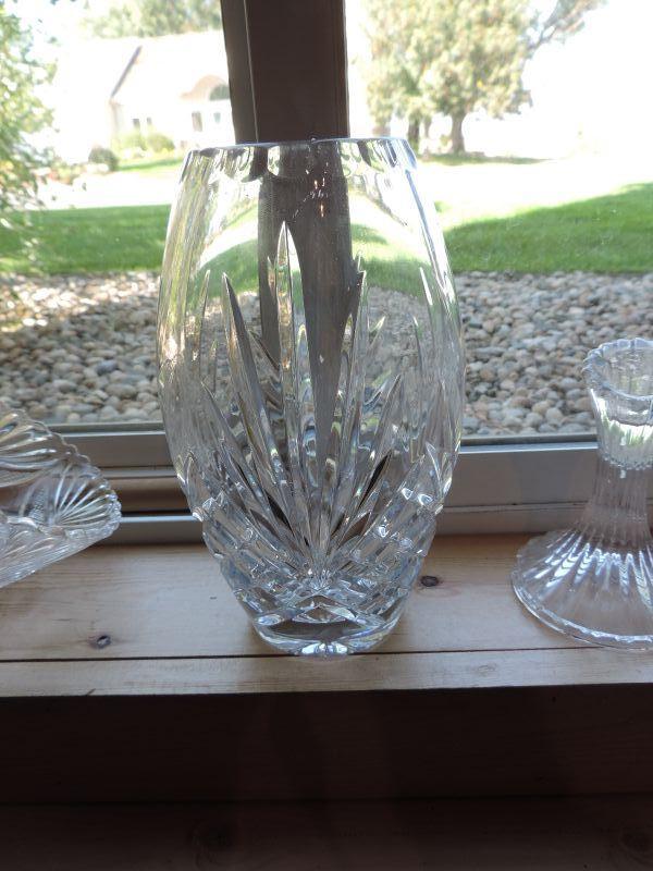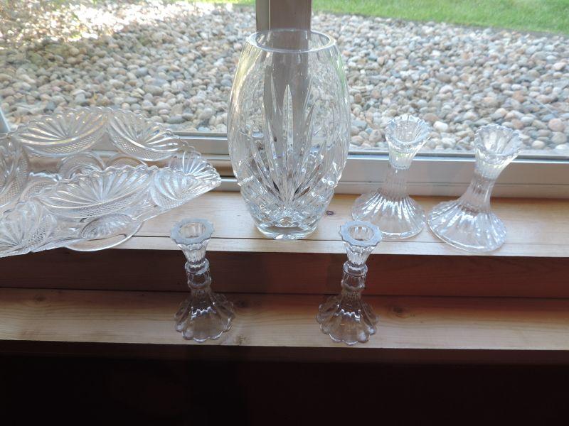 24 LEAD CRYSTAL VASE, 2 PAIRS OF GLASS CANDLE HOLDERS AND BASKET WITH HANDLE