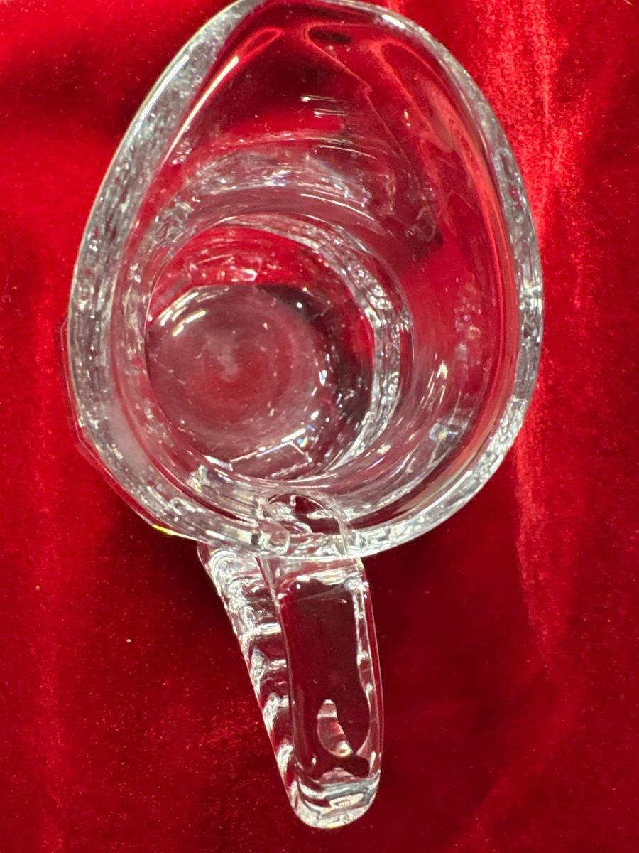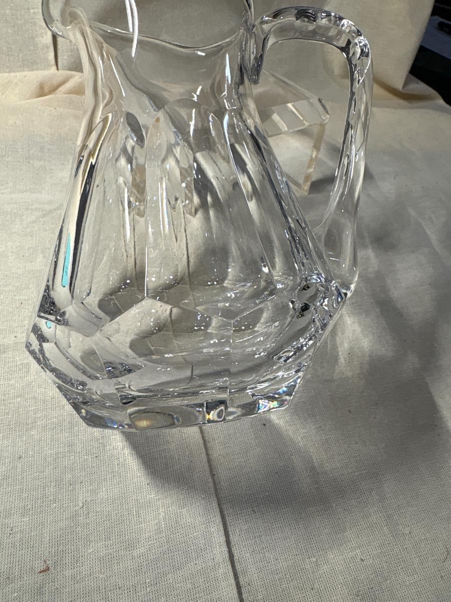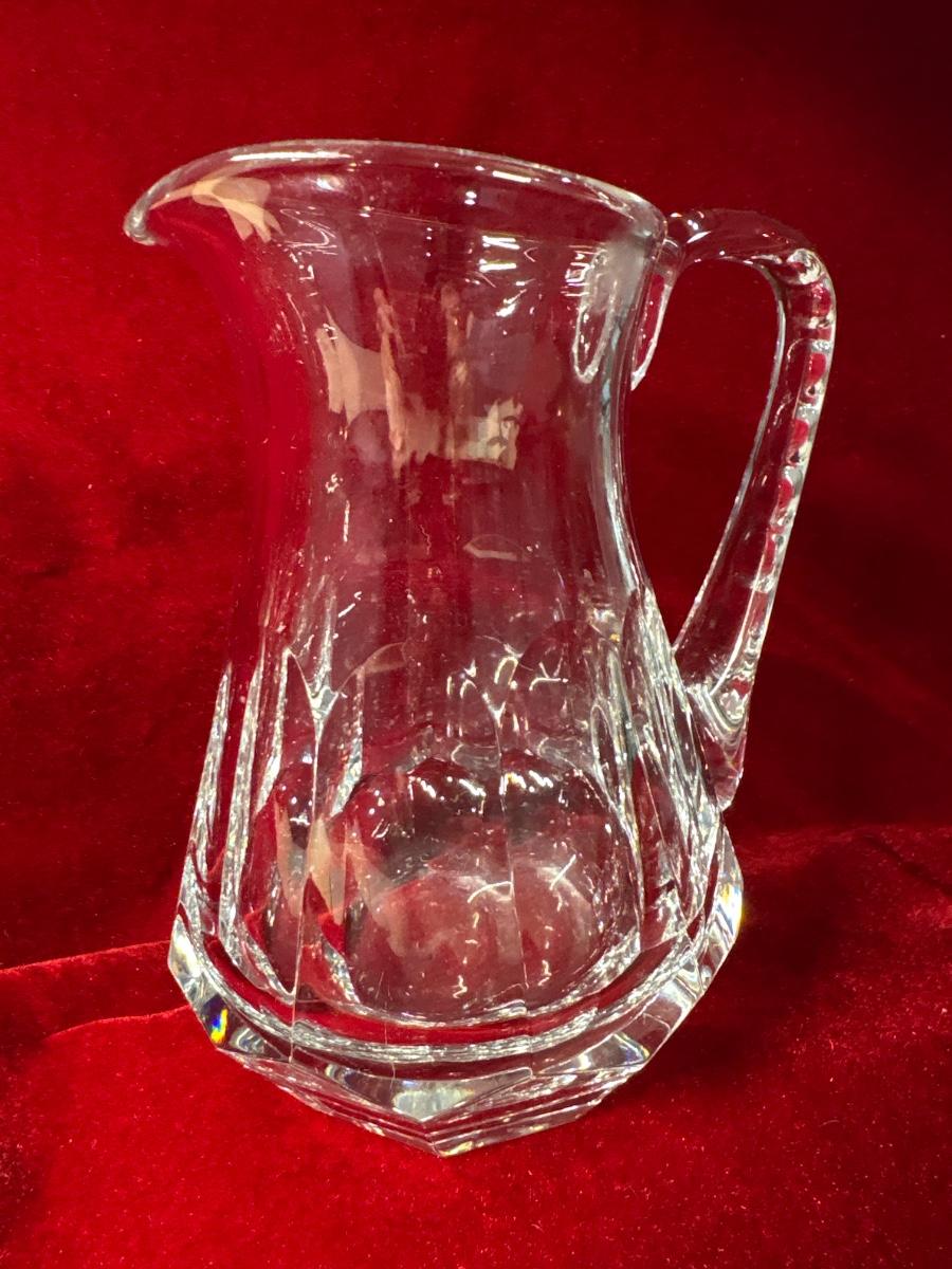 Unmarked heavy lead crystal 6.5” pitcher, beautiful lines at base of pitcher.