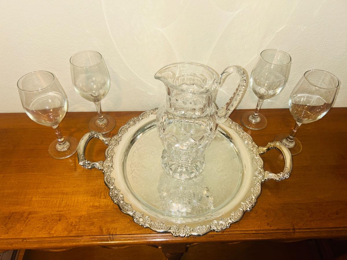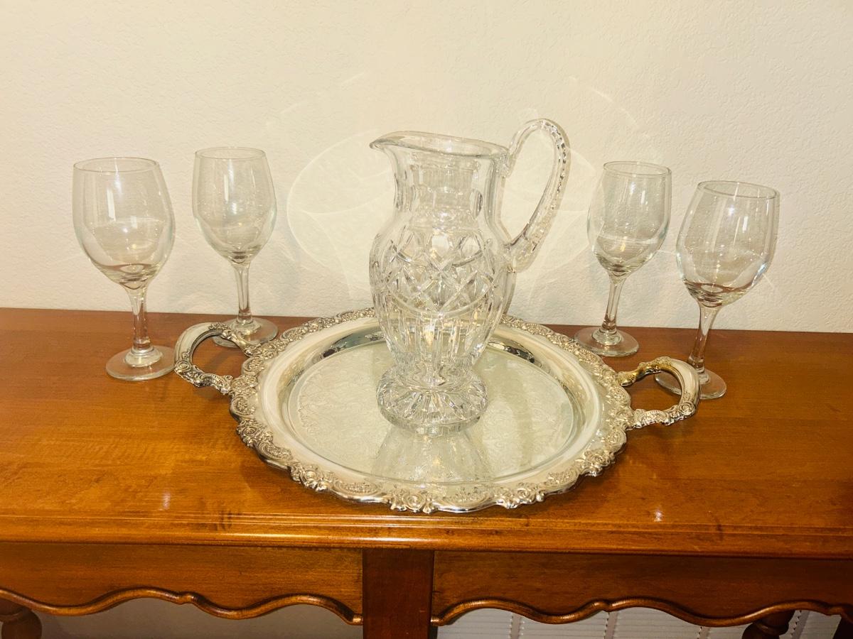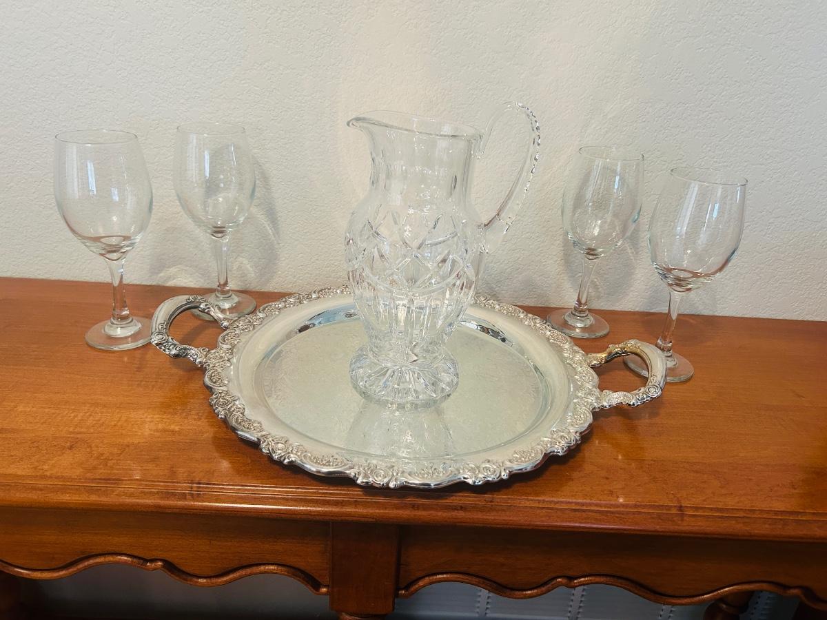 LEAD CRYSTAL PITCHER, STEMMED GLASSES AND ONIEDA SILVER-PLATE PLATTER
