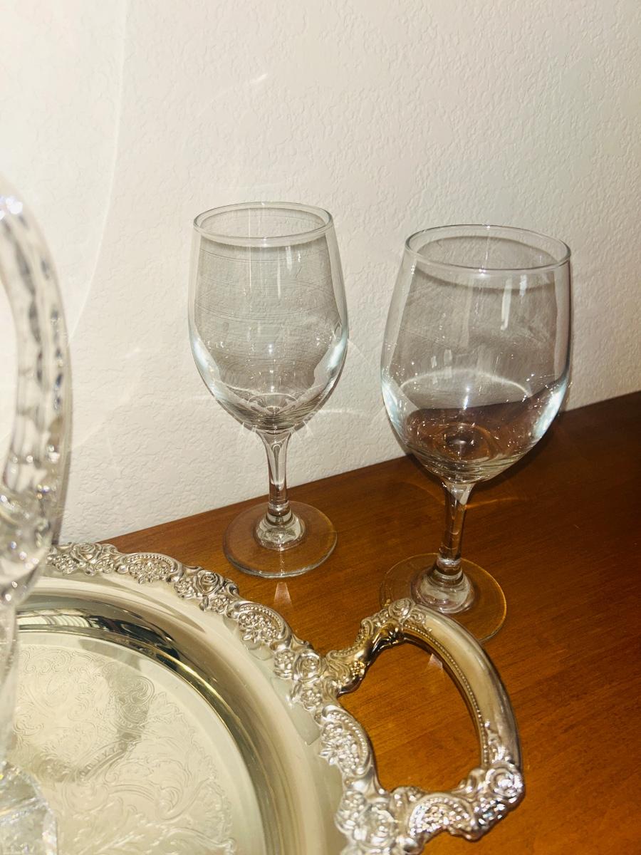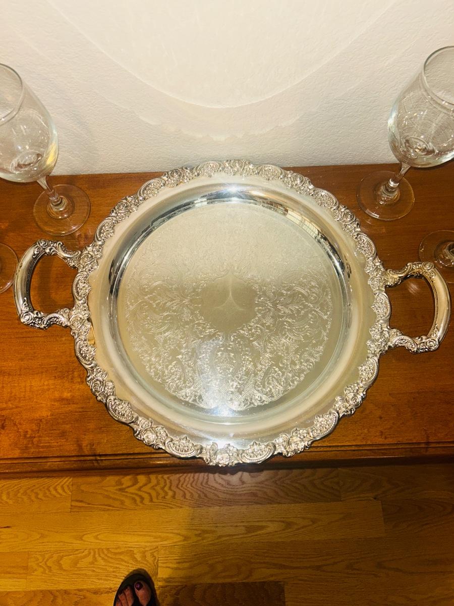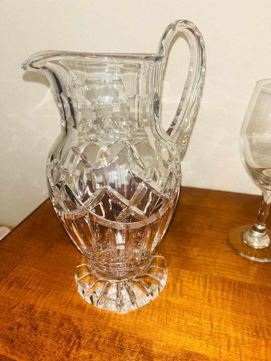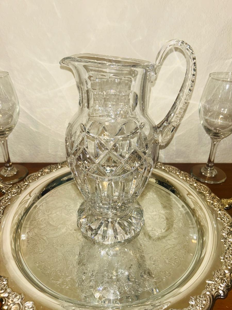 LEAD CRYSTAL PITCHER, STEMMED GLASSES AND ONIEDA SILVER-PLATE PLATTER