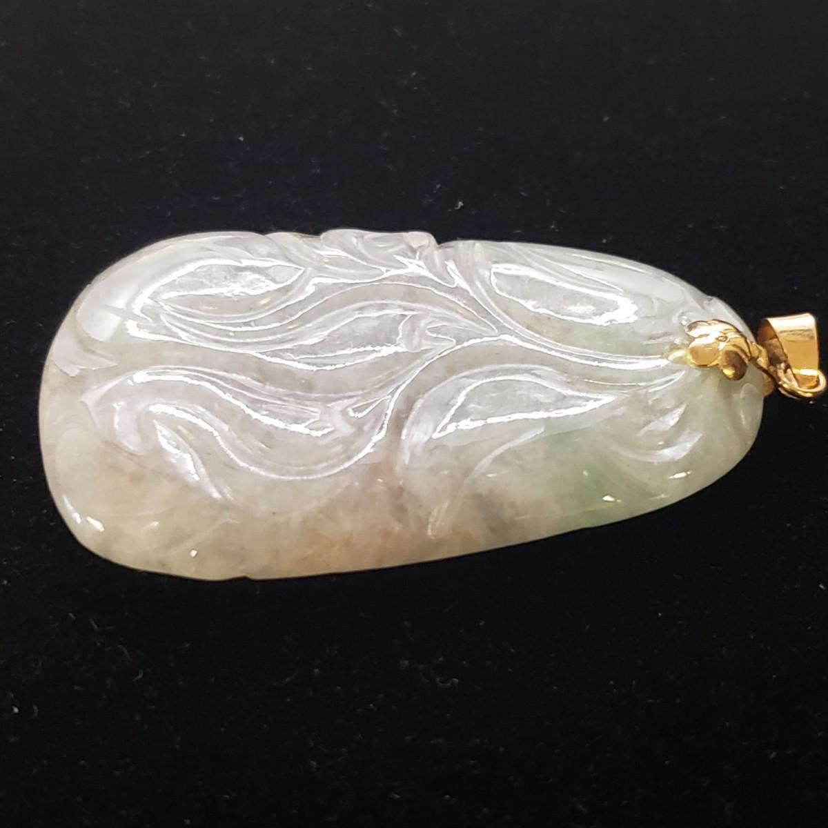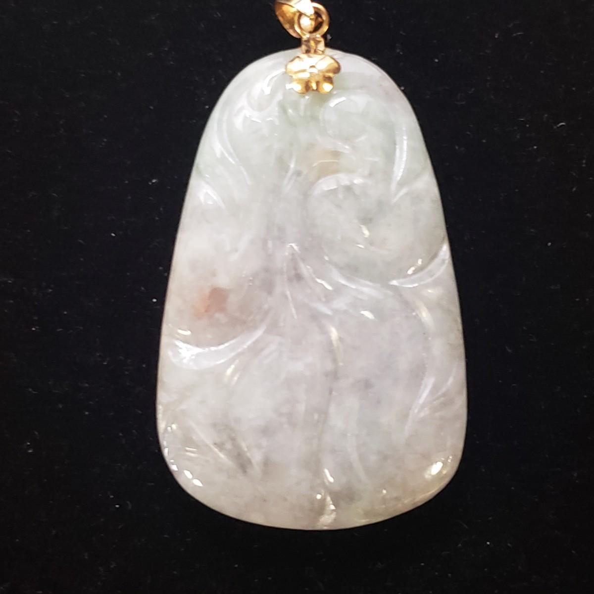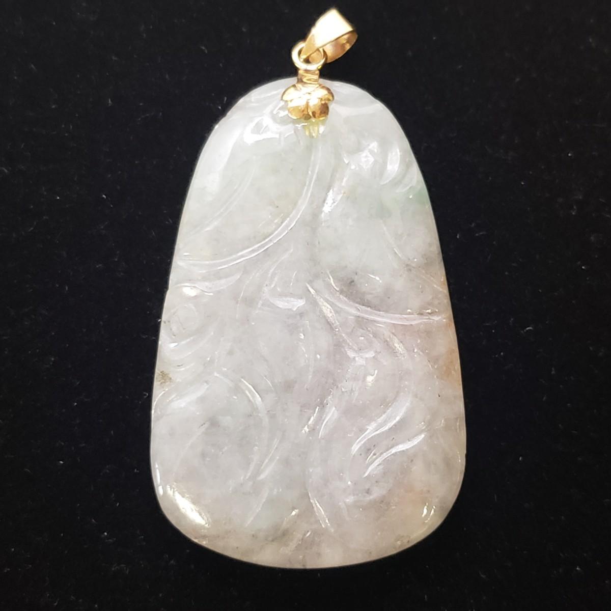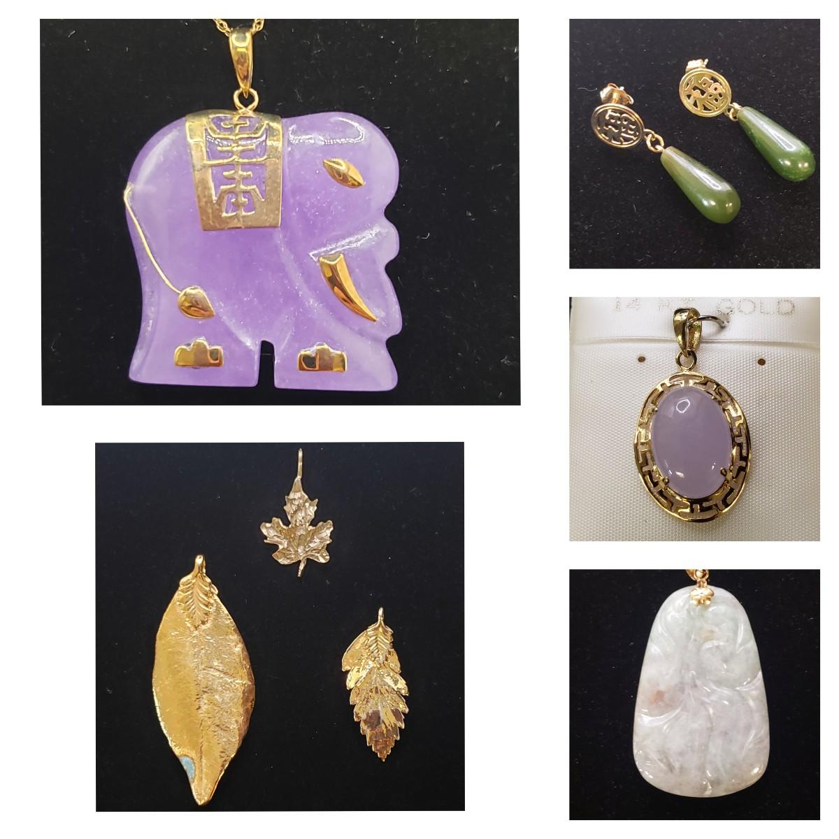 In this lot there are five loose pendants, one pendant on a chain, and three pairs of earrings for pierced ears. Three of the pendants are gold leaves. The largest leaf has a green blemish near the tip, see picture. The carved light green stone pendant measures 2" and its bail is marked 14K. The purple oval pendant has a delicate wavy gold like trim. There is also an elephant pendant on a delicate 18”gold necklace chain; both pendant and chain have a 10K hallmark. And finally two pairs of leaf earrings, one with a round stone. The other does not have backings. A third pair of earrings features a lovey jade green drop pendant. The earring posts and backs are marked with a 585 (14K) hallmark.