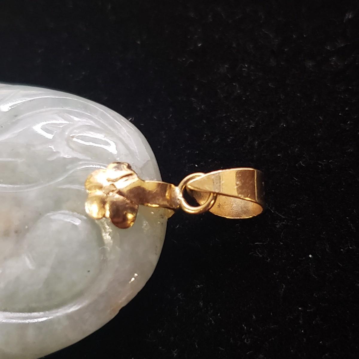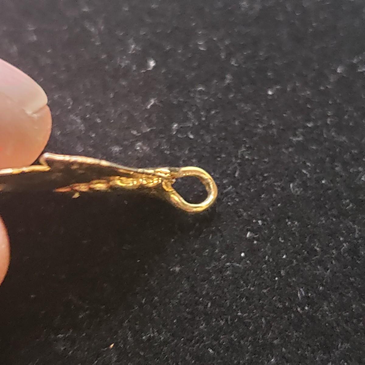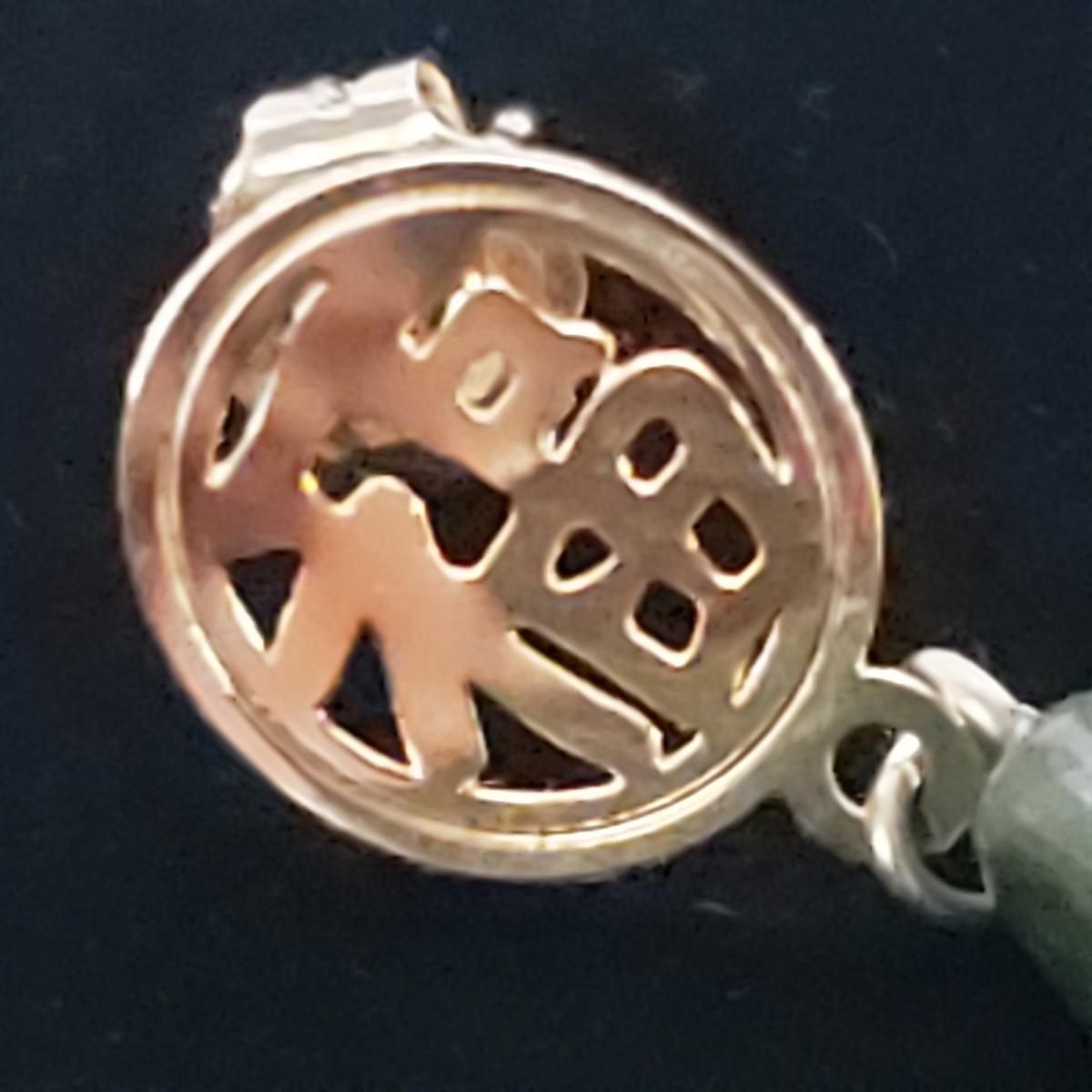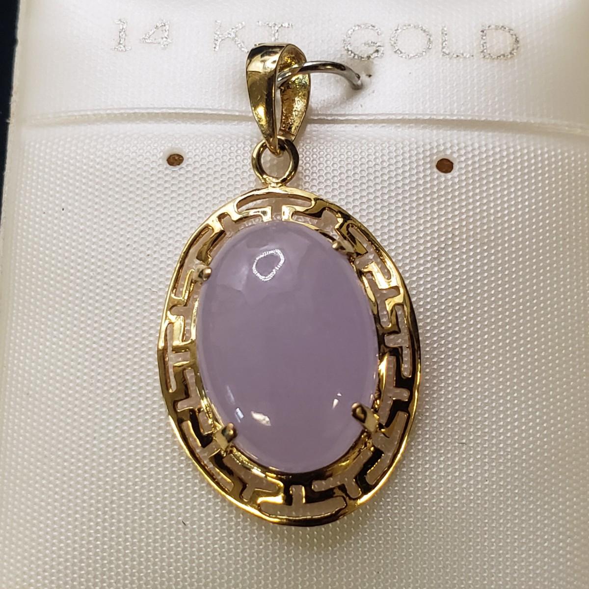 In this lot there are five loose pendants, one pendant on a chain, and three pairs of earrings for pierced ears. Three of the pendants are gold leaves. The largest leaf has a green blemish near the tip, see picture. The carved light green stone pendant measures 2" and its bail is marked 14K. The purple oval pendant has a delicate wavy gold like trim. There is also an elephant pendant on a delicate 18”gold necklace chain; both pendant and chain have a 10K hallmark. And finally two pairs of leaf earrings, one with a round stone. The other does not have backings. A third pair of earrings features a lovey jade green drop pendant. The earring posts and backs are marked with a 585 (14K) hallmark.
