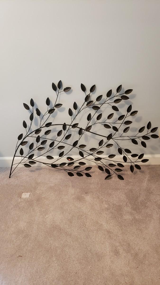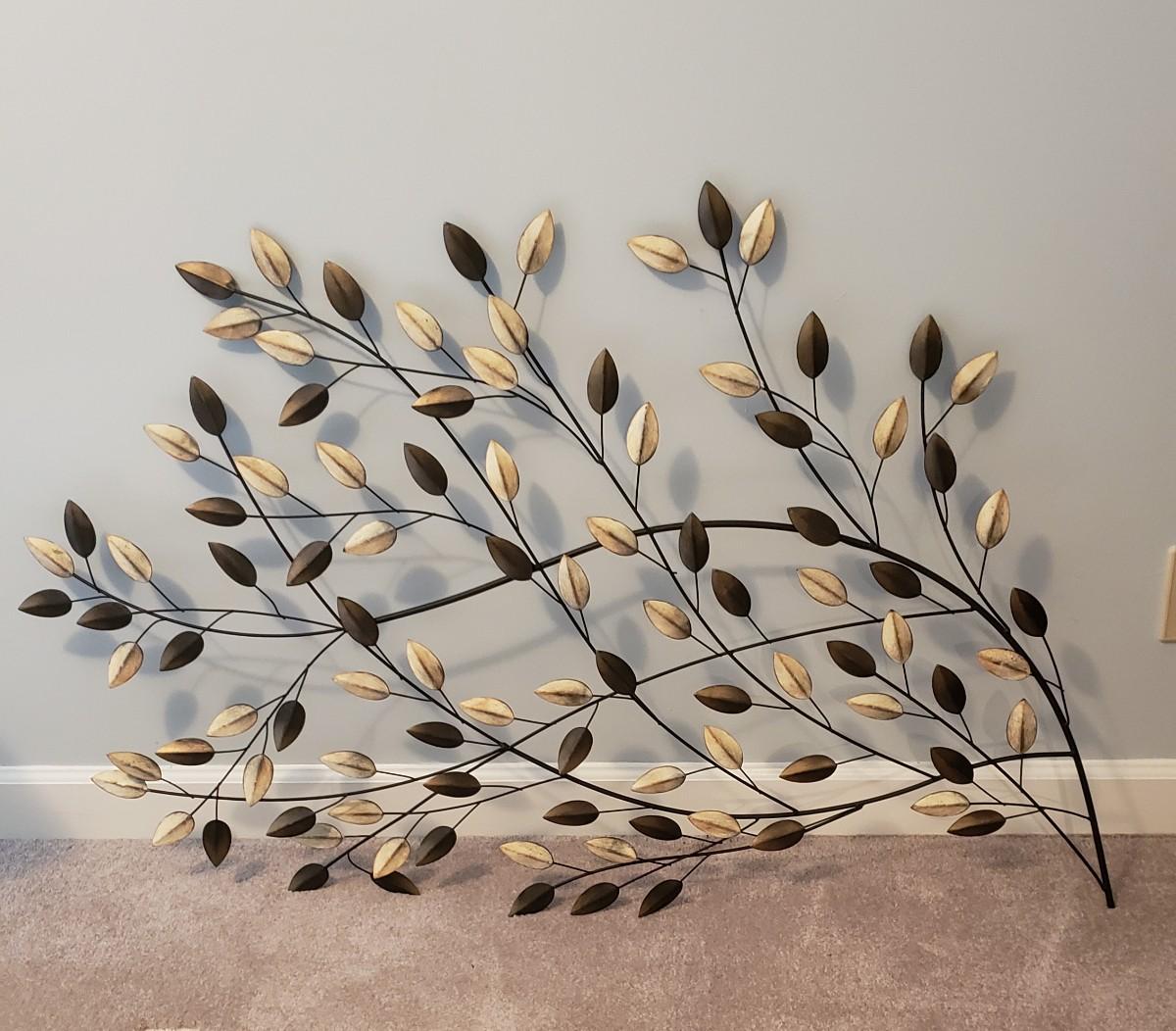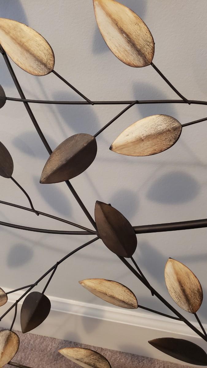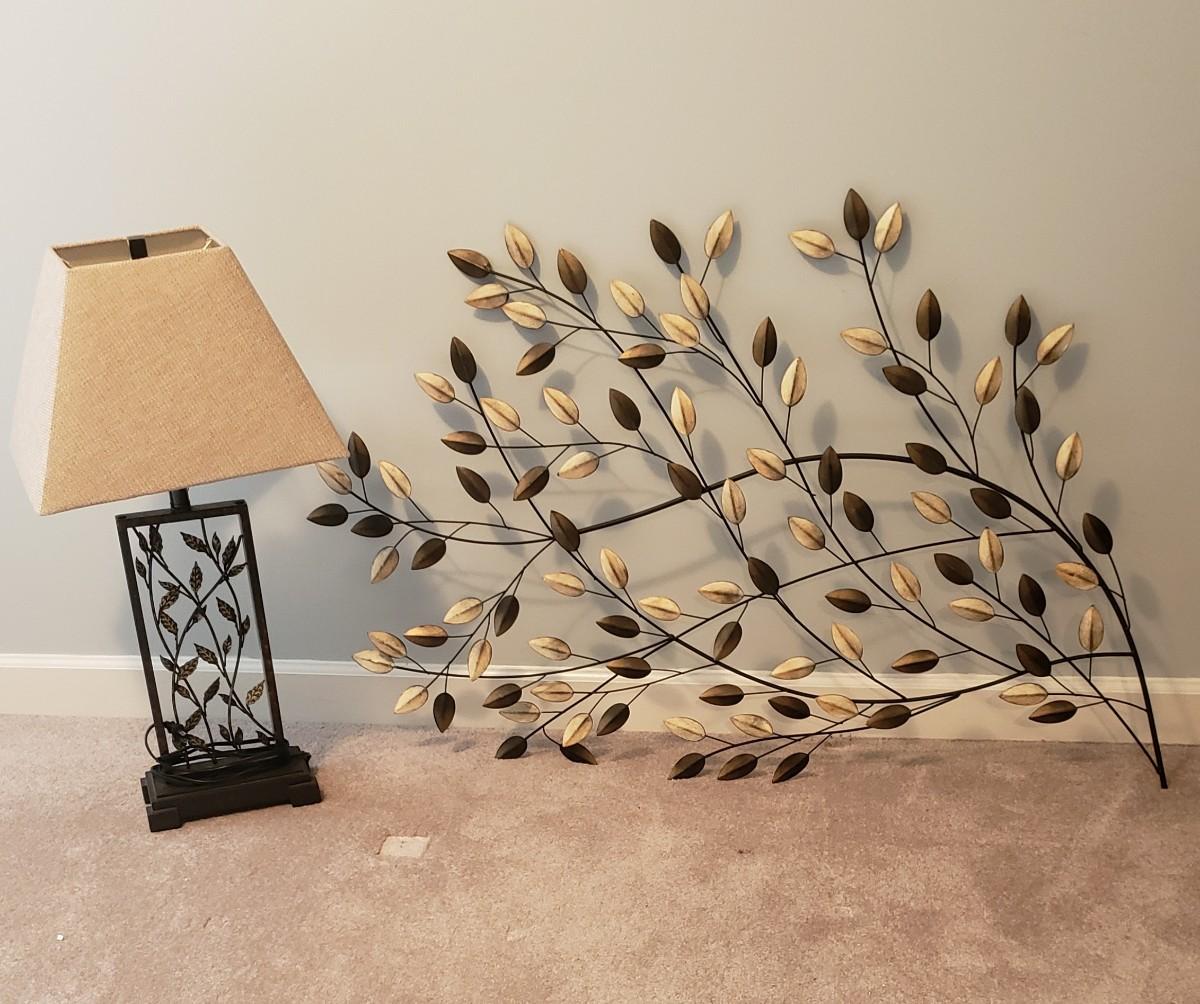 This lot features two pieces of leaf inspired items. The two toned metal leaf wall art measures 47"x33"H. It can easily hang on the wall with two nails/screws. This piece is light weight.