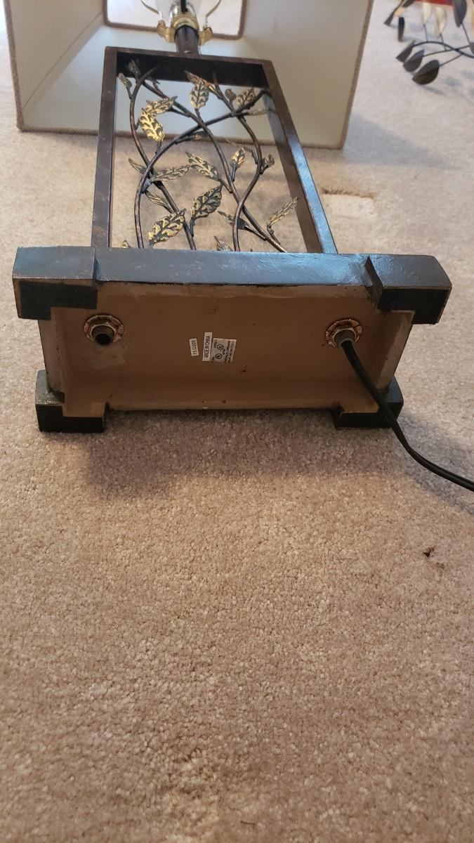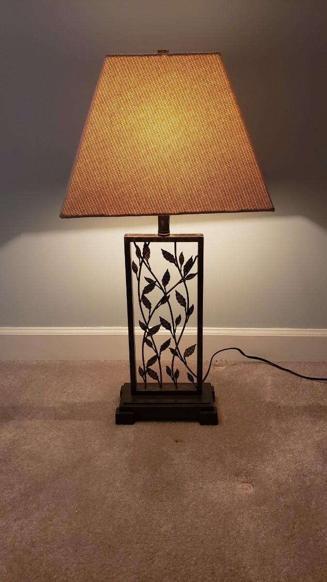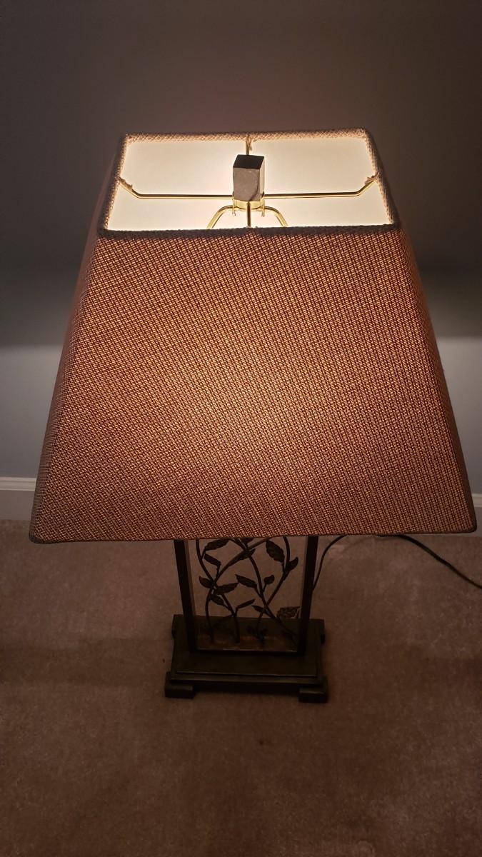 The metal/ceramic leaf lamp powered on when plugged in. The lamp measures approximately 6"x33"H. The lamp shade is a tan tweed material and appears to be in good condition.