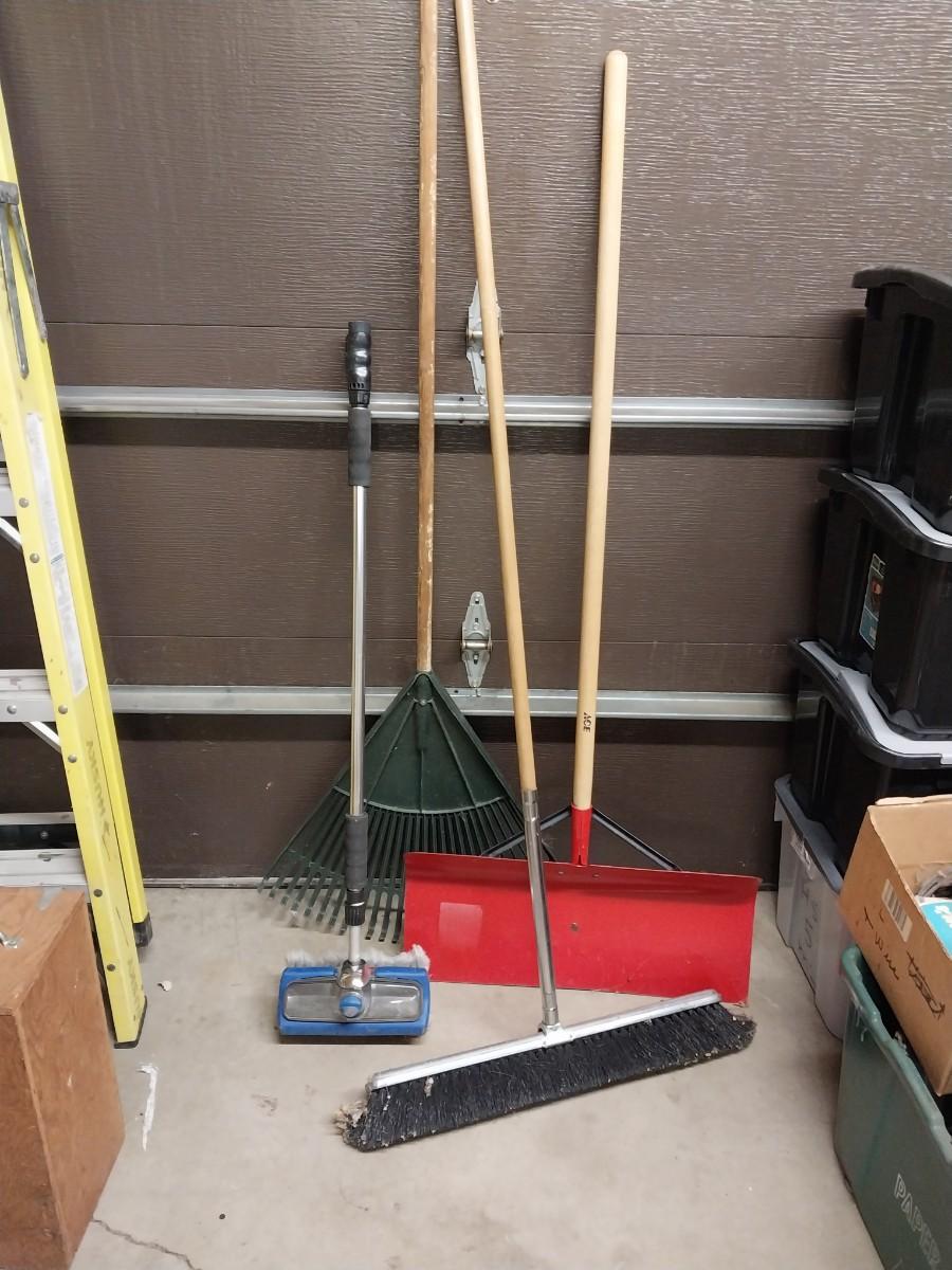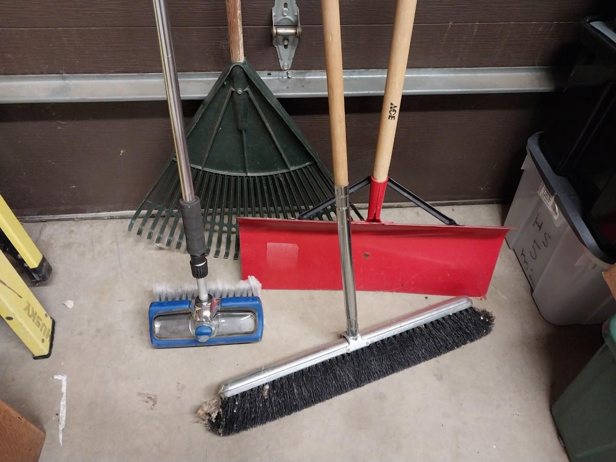 LEAF RAKE, PUSH BROOM, TELESCOPING SCRUB BRUSH AND SNOW SHOVEL