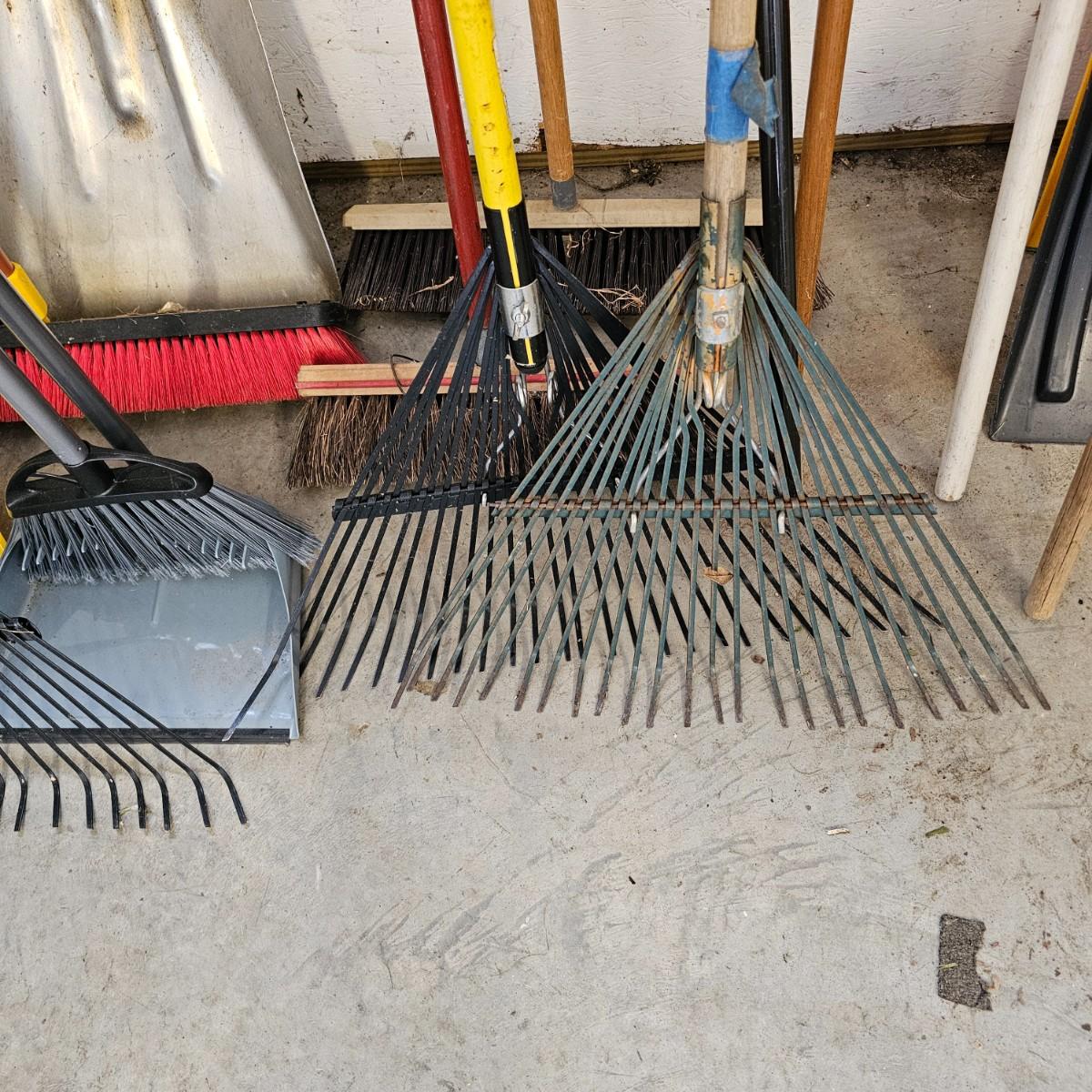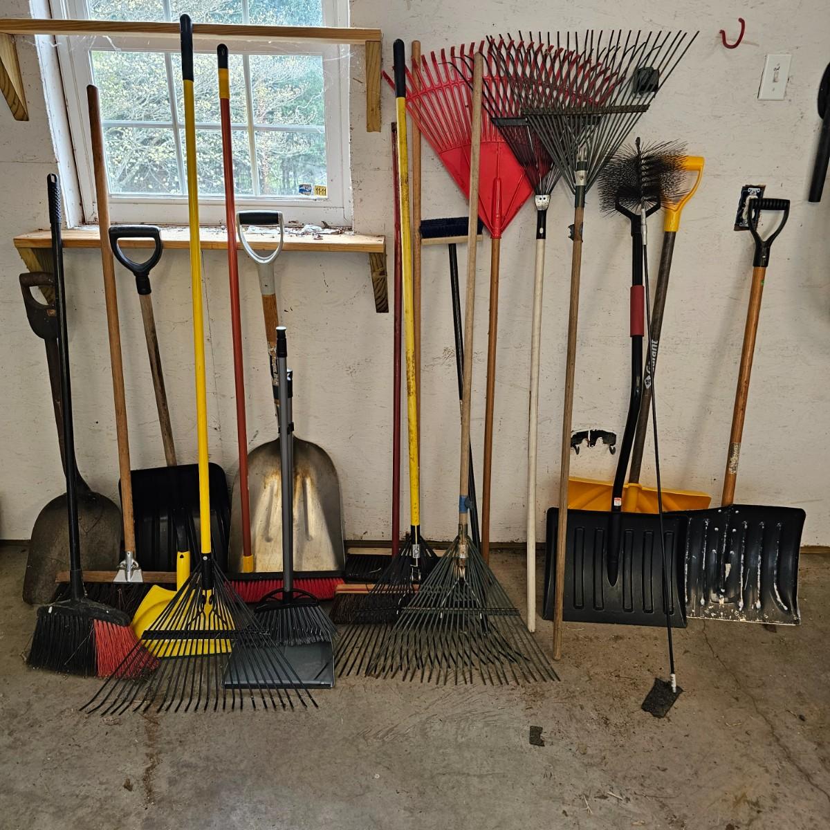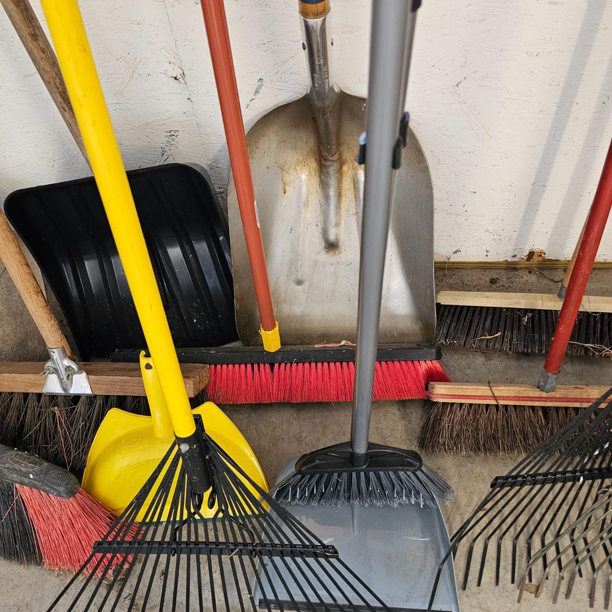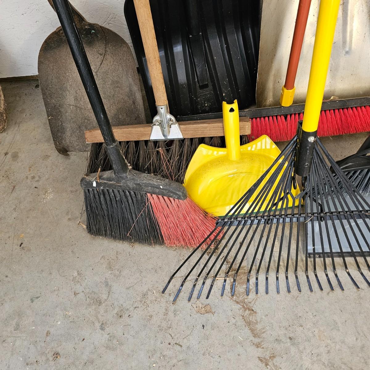 Six long handle leaf rakes, push brooms, grain scoops and snow shovels. Also includes regular broom and dustpan and a single piece chimney brush. Leaf rakes are approximately 68" long and 20" to 24" wide. See photos for details. Local pickup only.