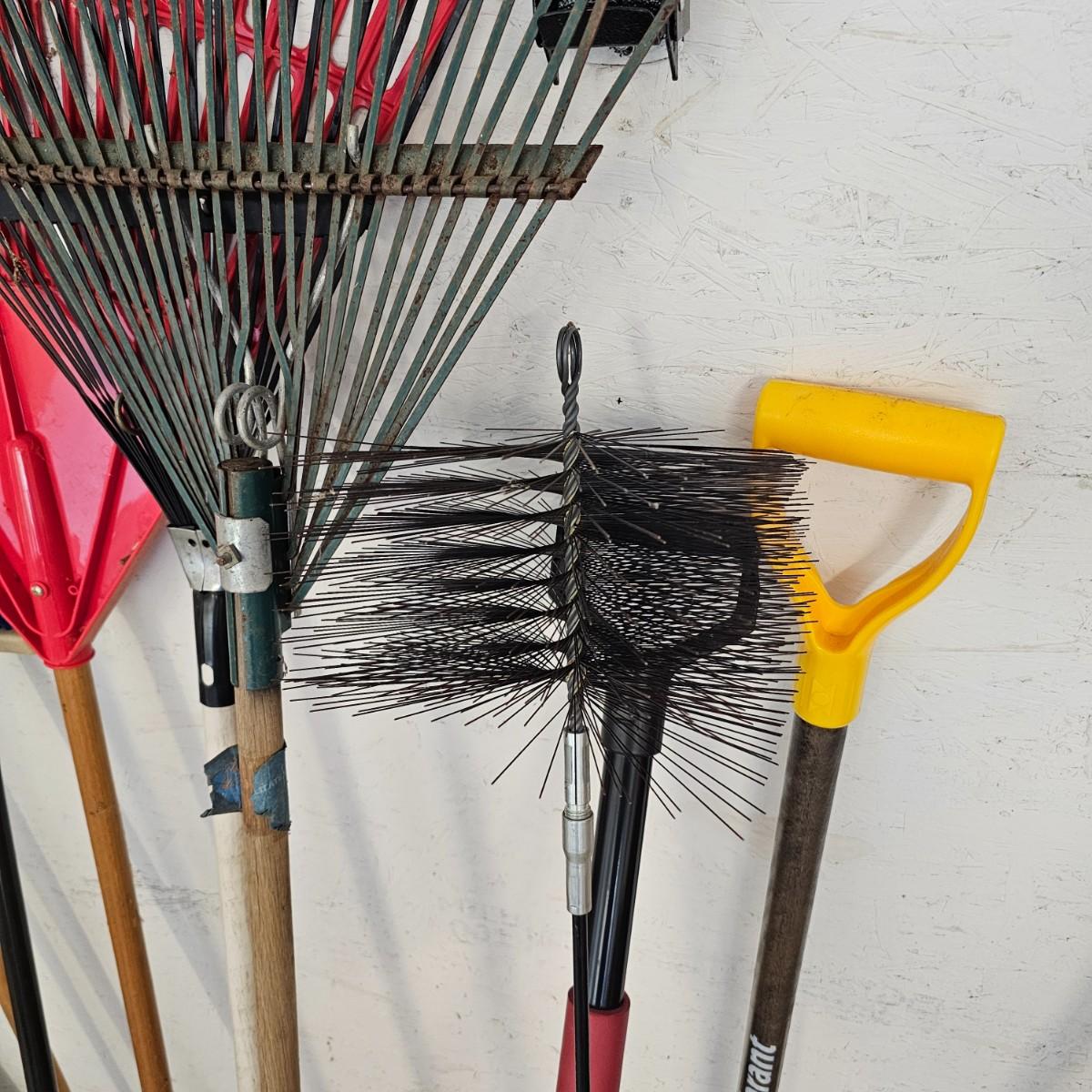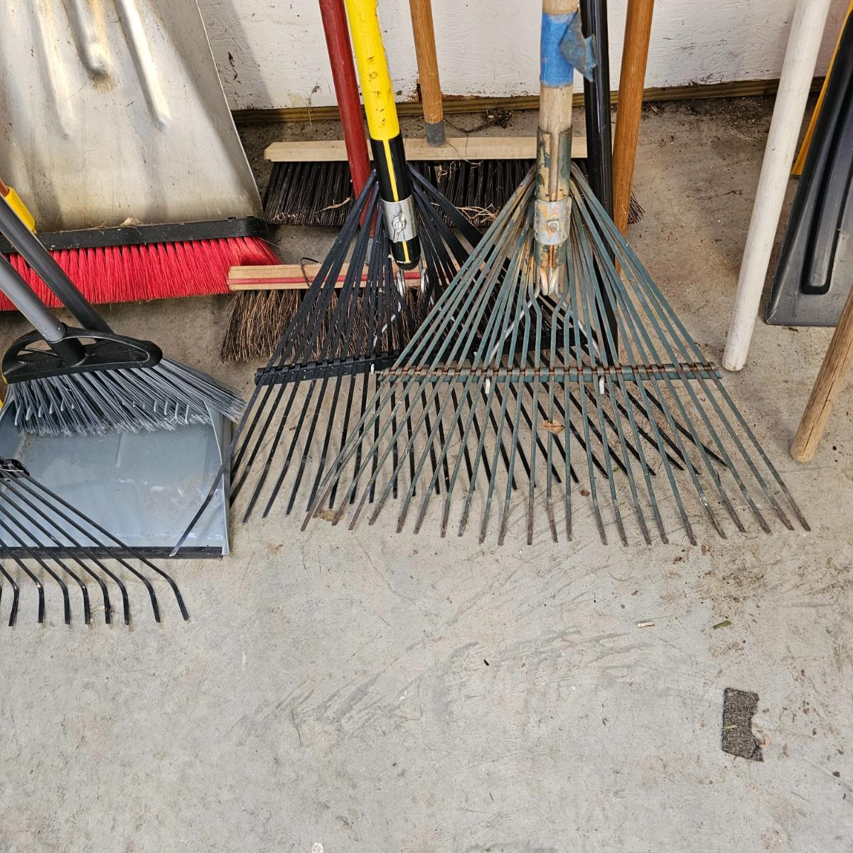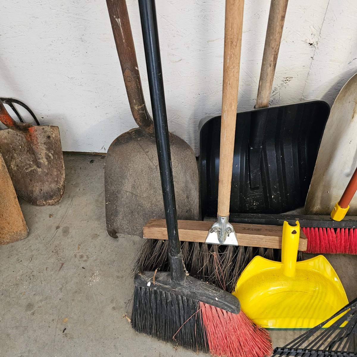 Six long handle leaf rakes, push brooms, grain scoops and snow shovels. Also includes regular broom and dustpan and a single piece chimney brush. Leaf rakes are approximately 68" long and 20" to 24" wide. See photos for details. Local pickup only.