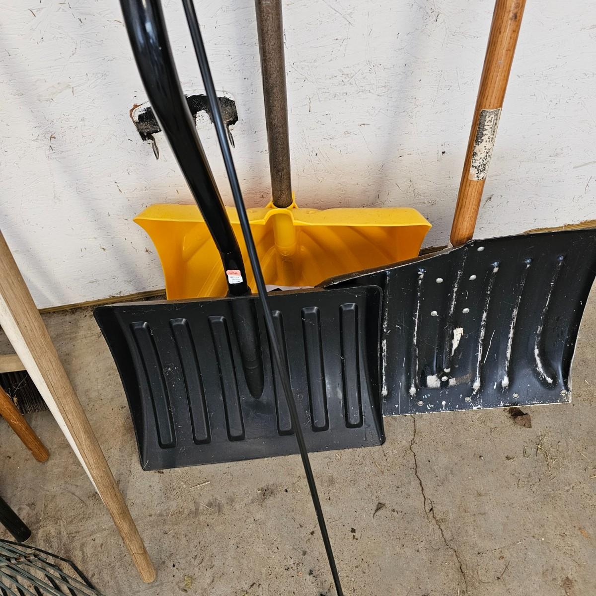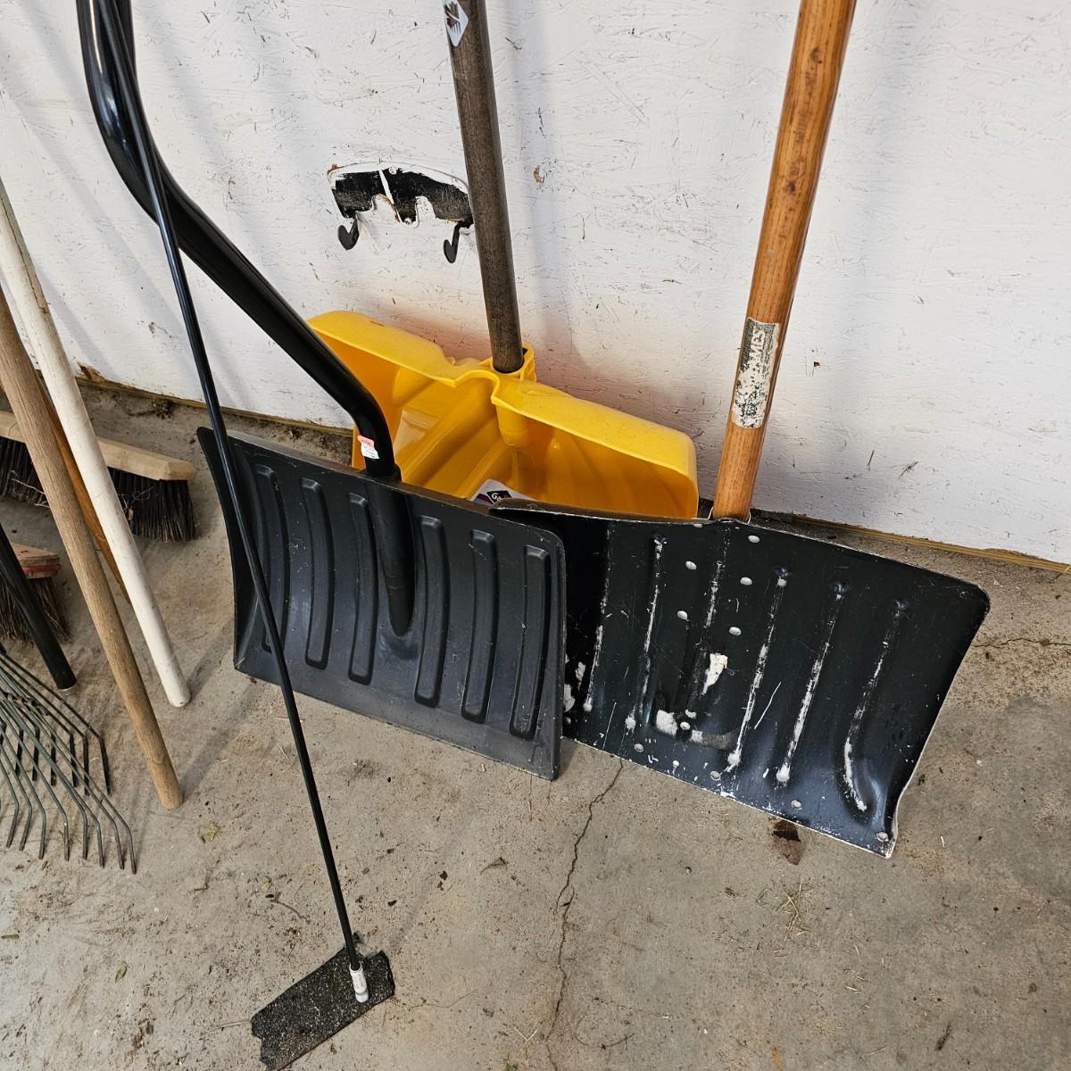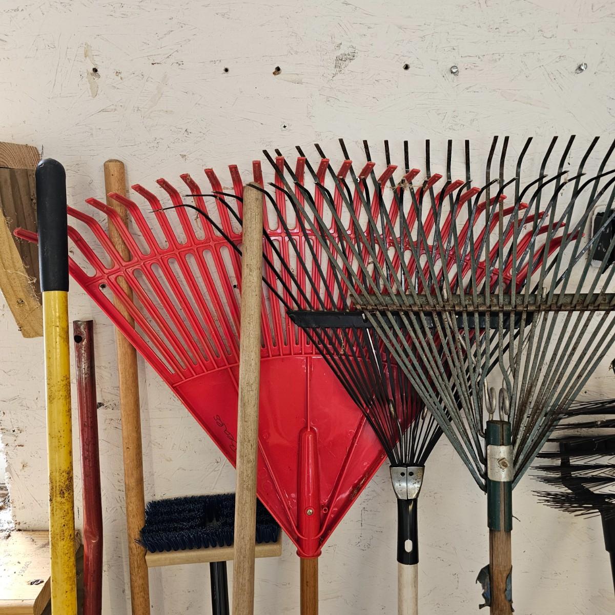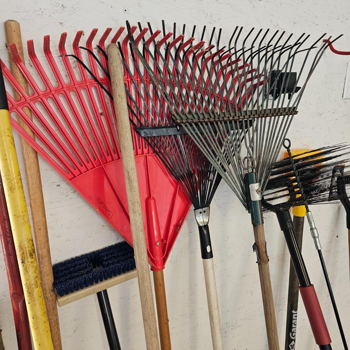 Six long handle leaf rakes, push brooms, grain scoops and snow shovels. Also includes regular broom and dustpan and a single piece chimney brush. Leaf rakes are approximately 68" long and 20" to 24" wide. See photos for details. Local pickup only.
