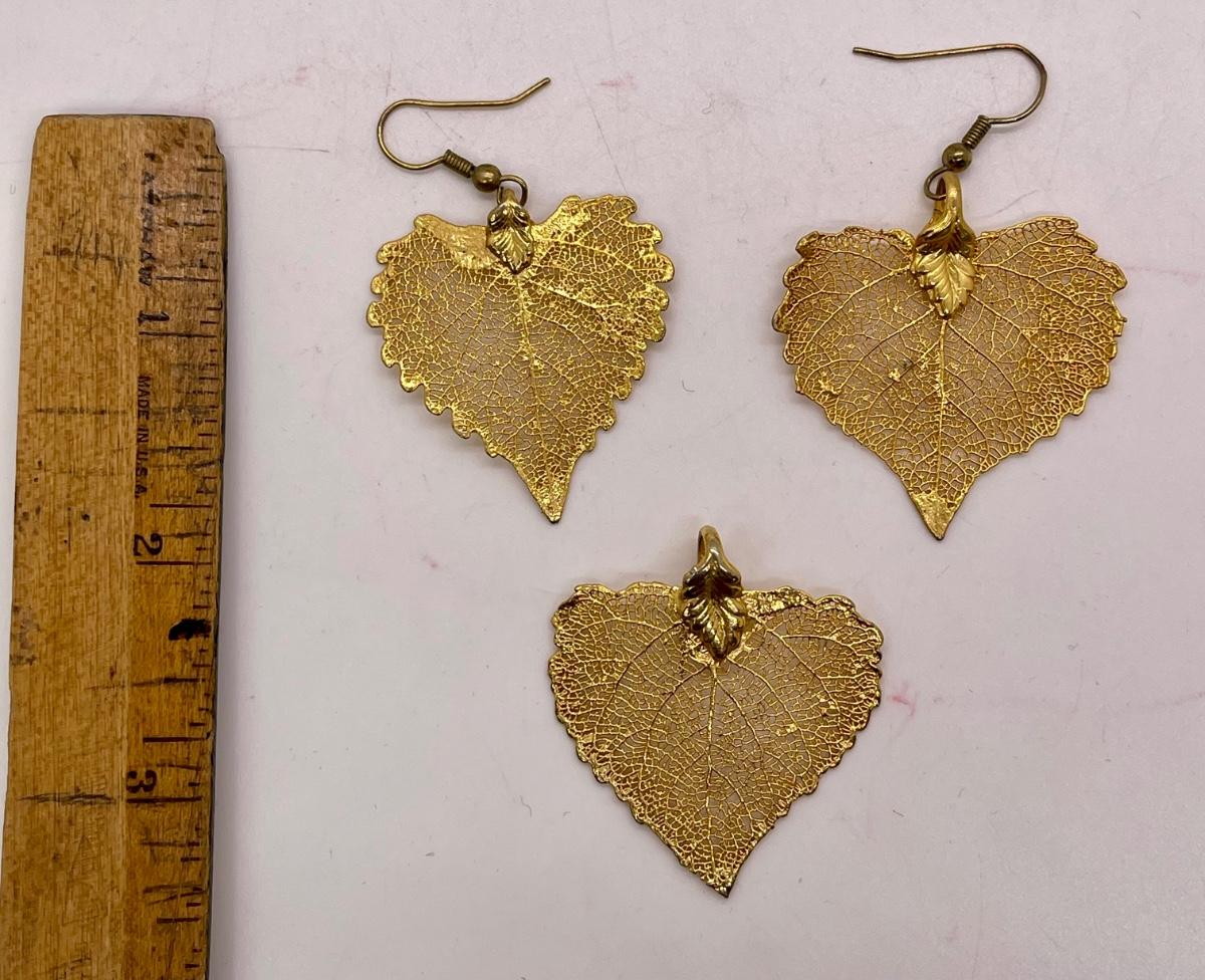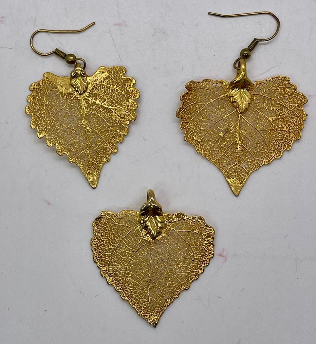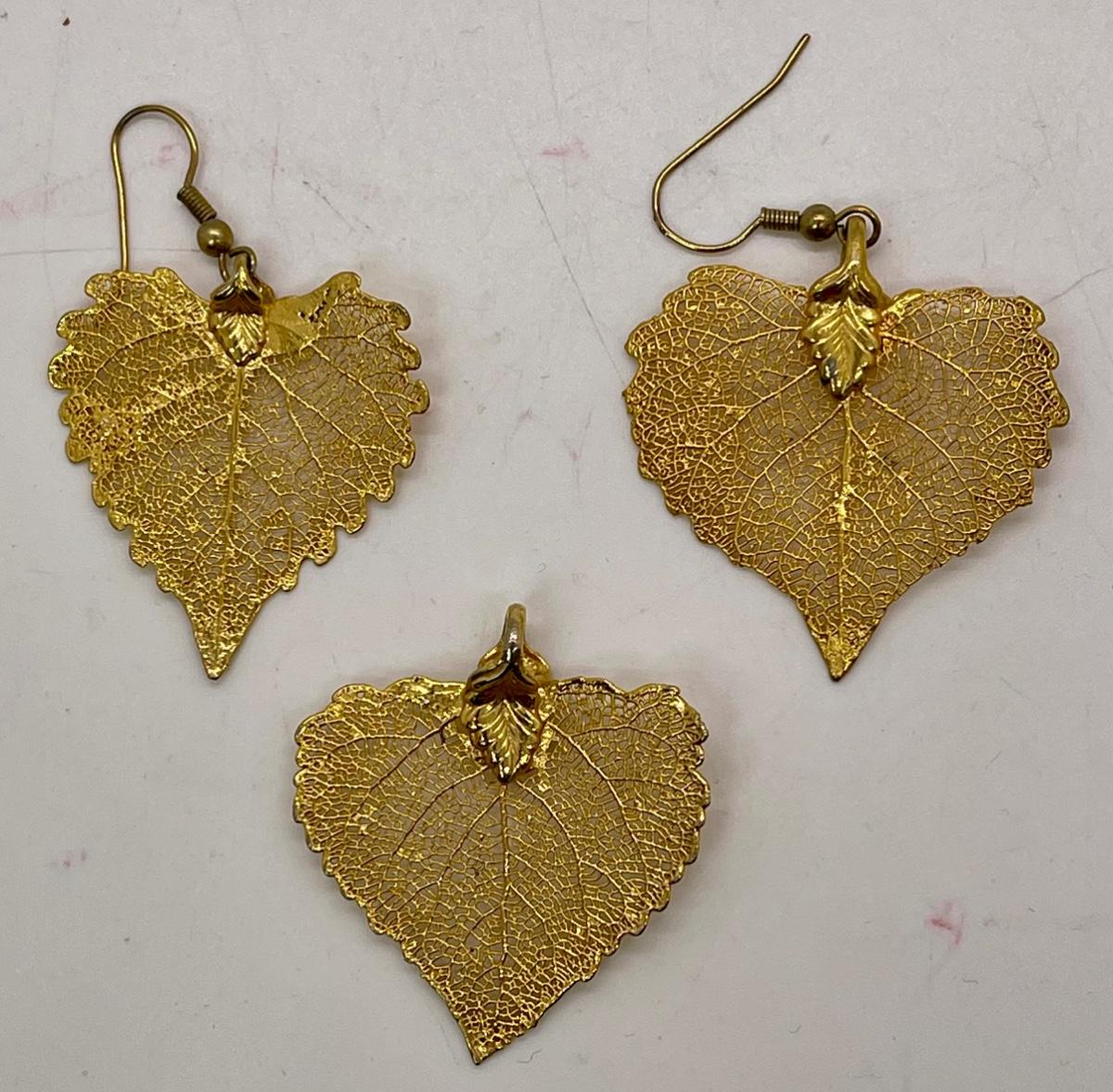 Leaf Shaped Gold Tone Pendant and Earrings Set