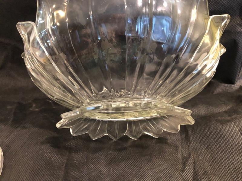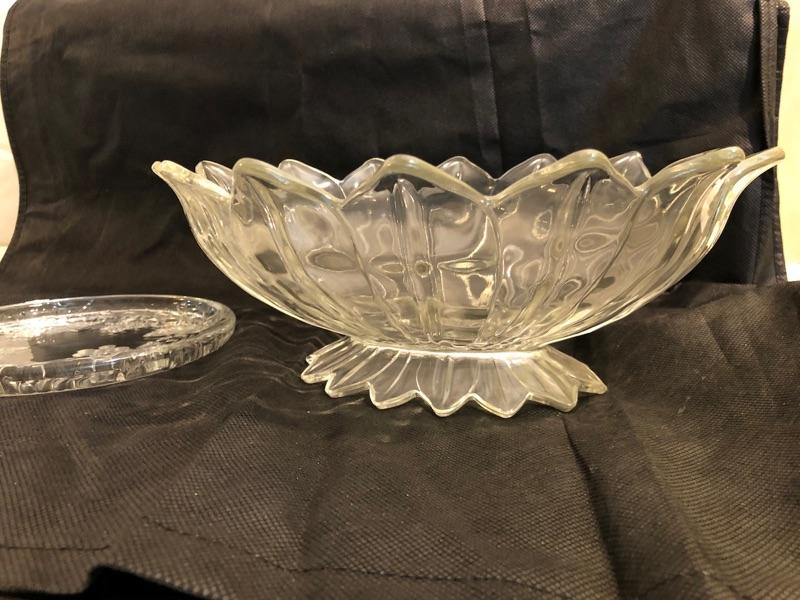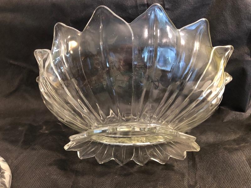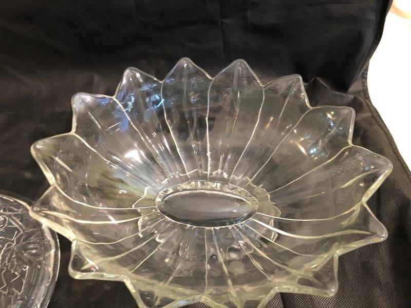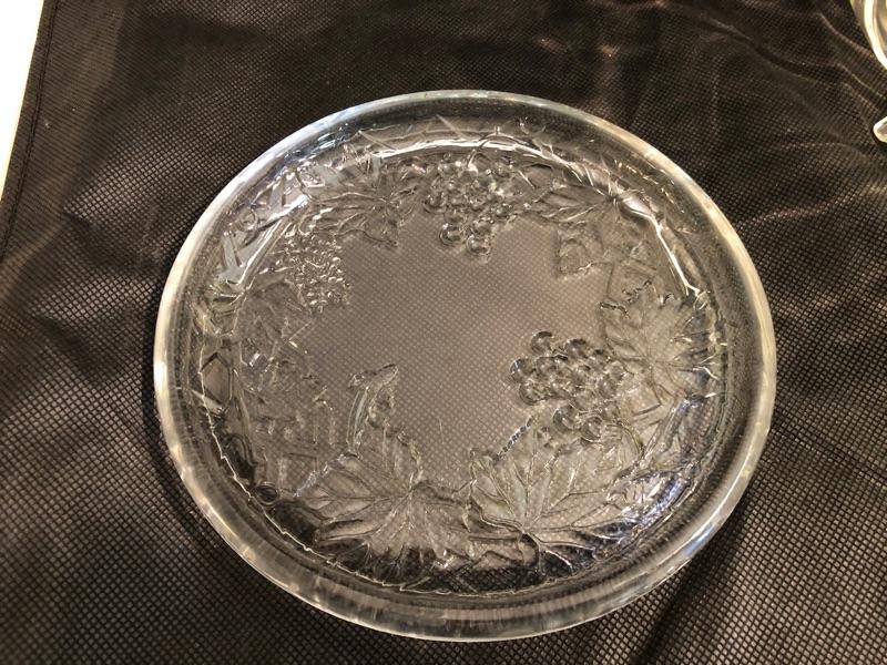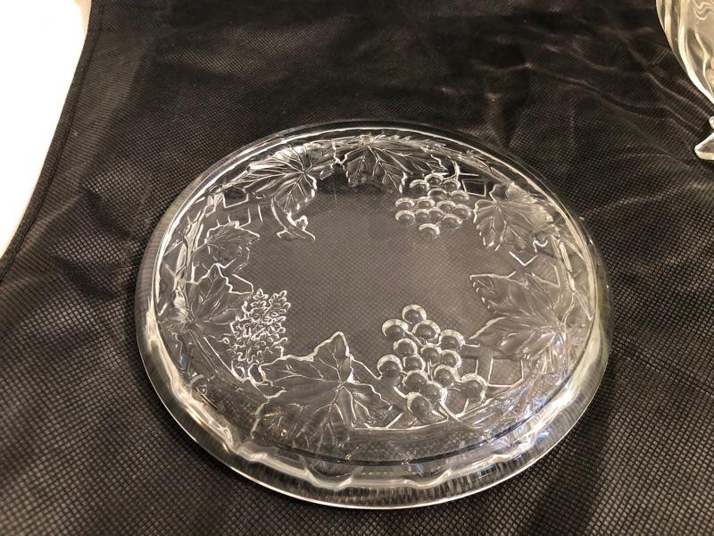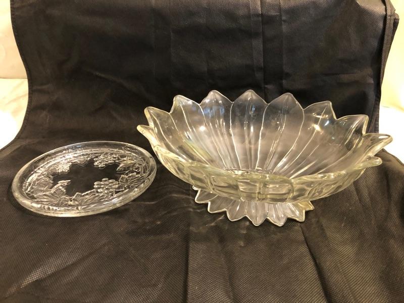 Vintage leaf shaped design glass serving bowl with glass grapevine designed cheese plate Bowl is 12in x 10in by 4.5 in tall at the rim, cheese plate is 8in diameter x .75in deep