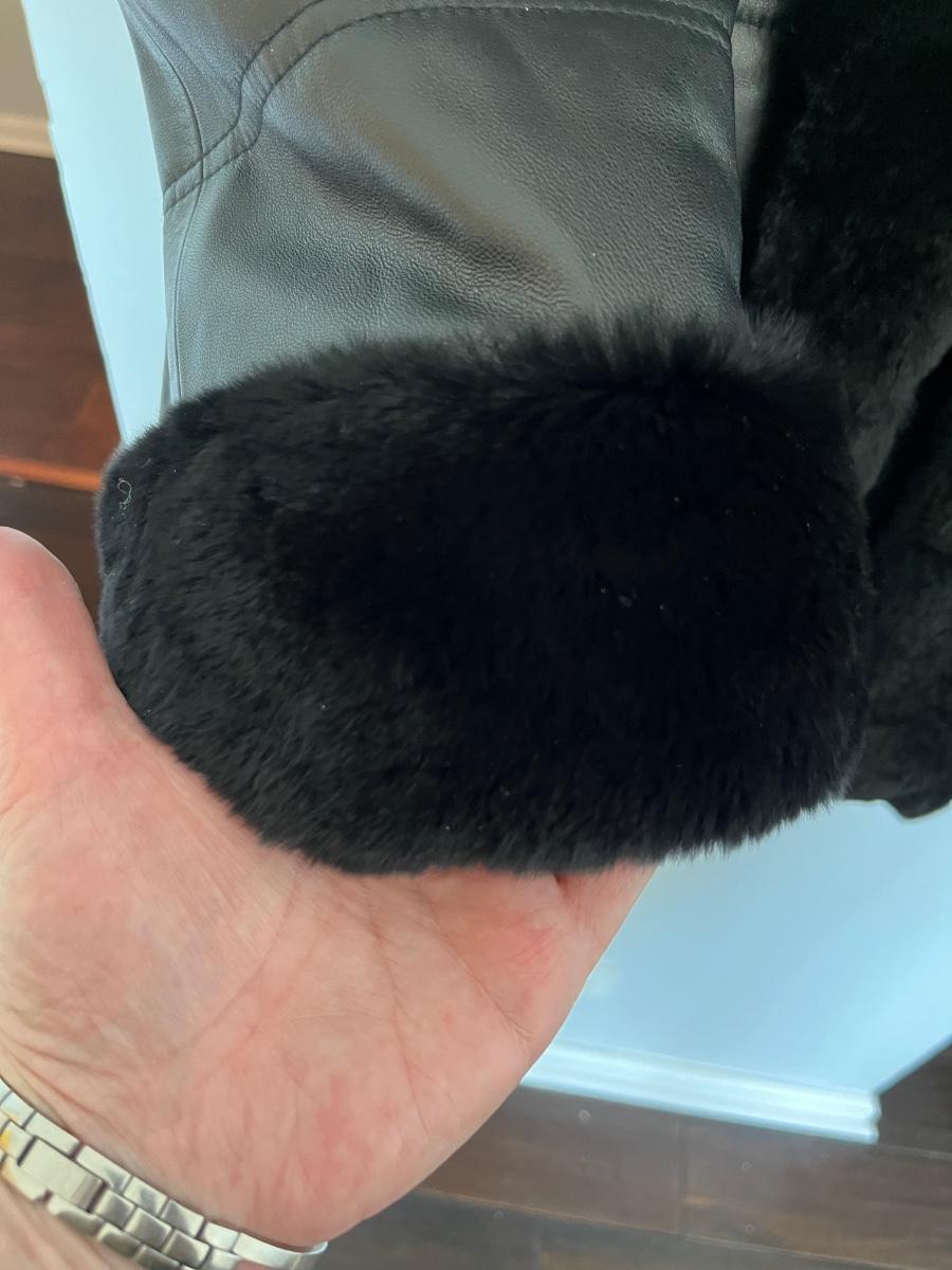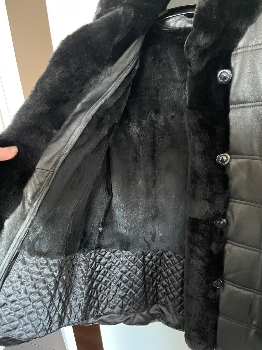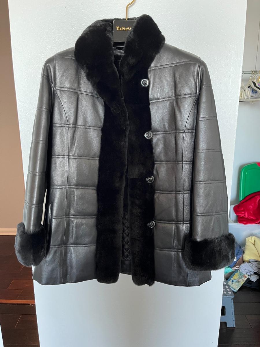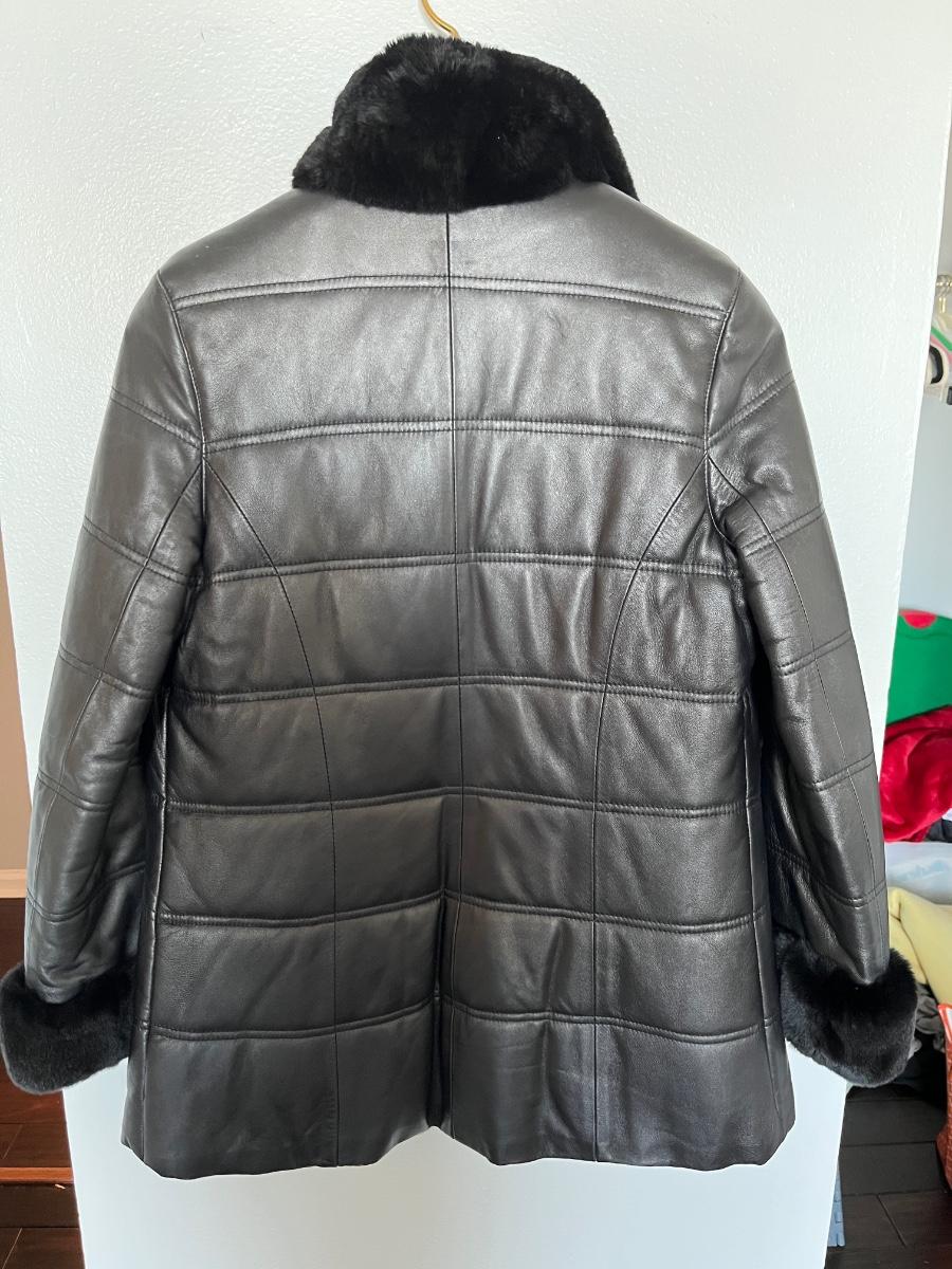 This is an elegant quilted black leather jacket with black sheared mink trim and lining. It is in excellent condition with soft supple leather and fur. There is no designer listed in the jacket.
