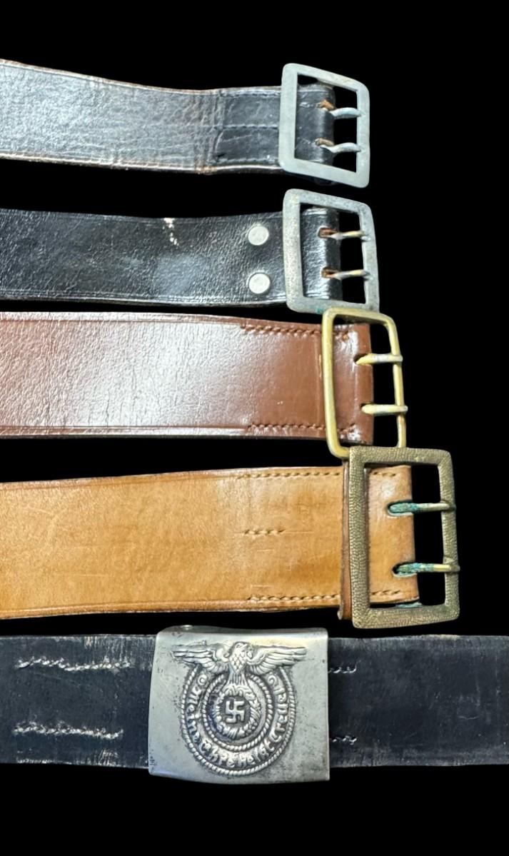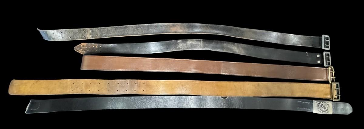 Total of five leather belts with buckles. One belt has a Nazi buckle, which may or may not be original. Age related wear. [JS]