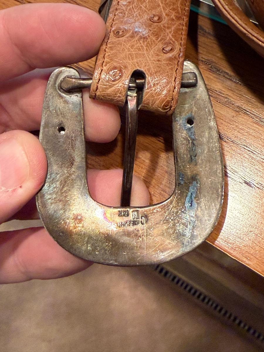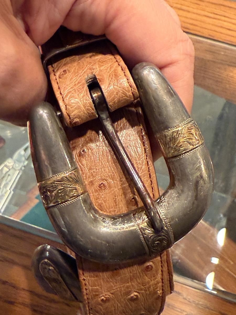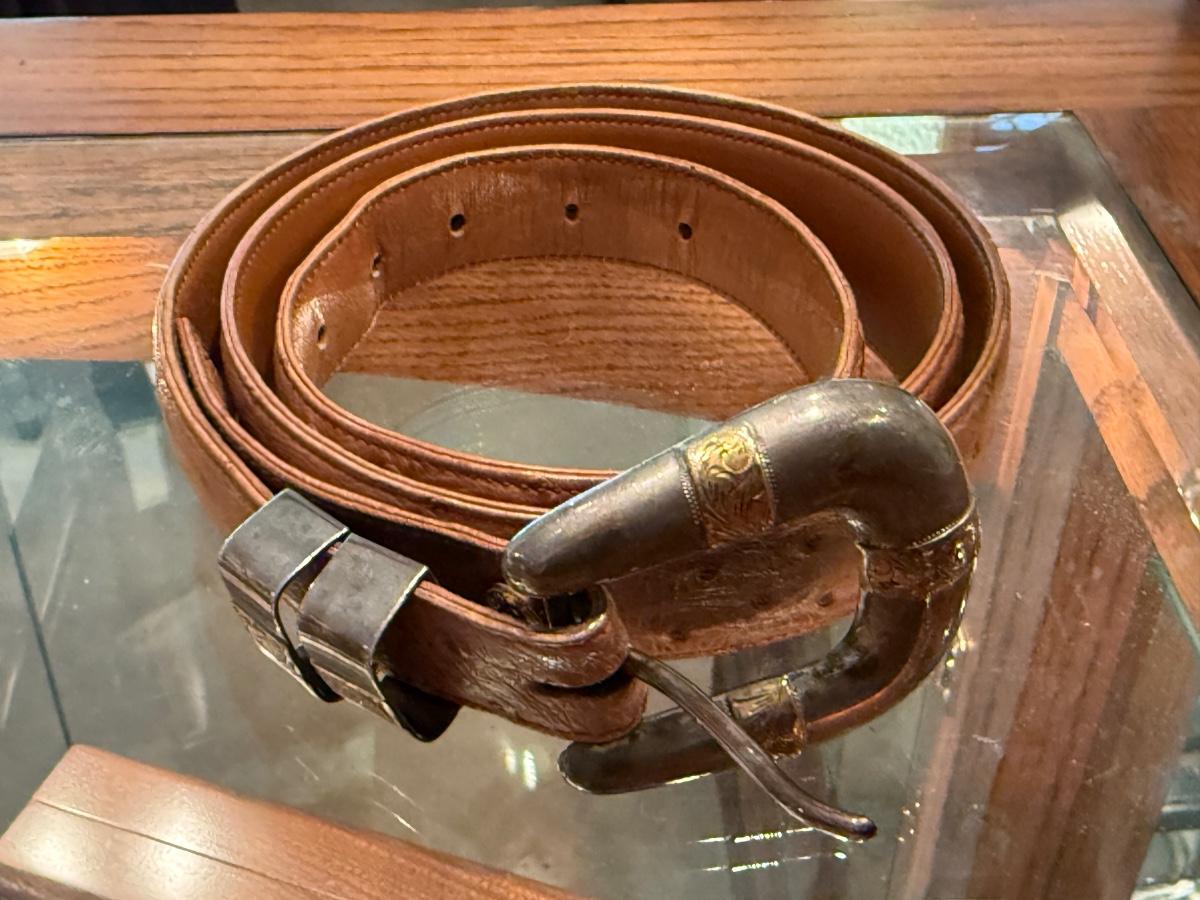 Leather belt with Sterling Buckle & end piece. Not sure of size