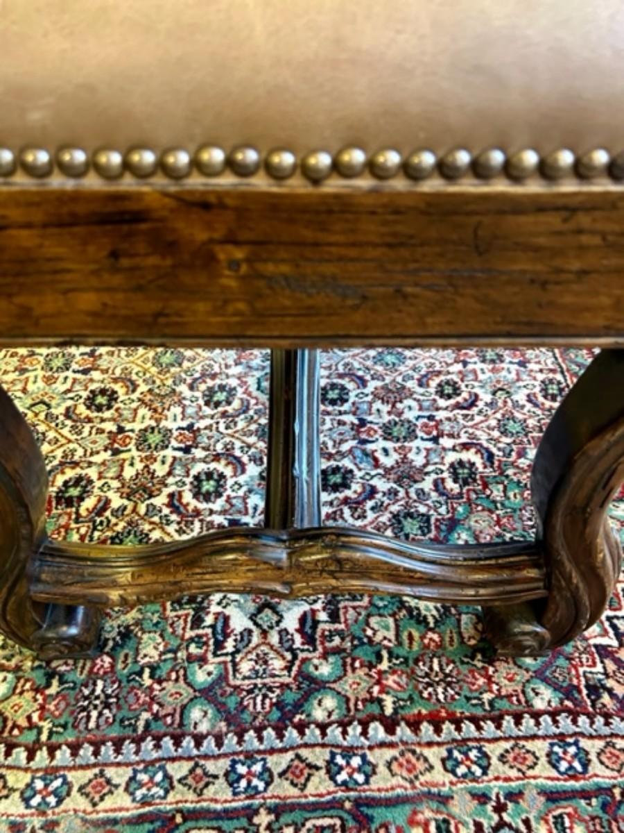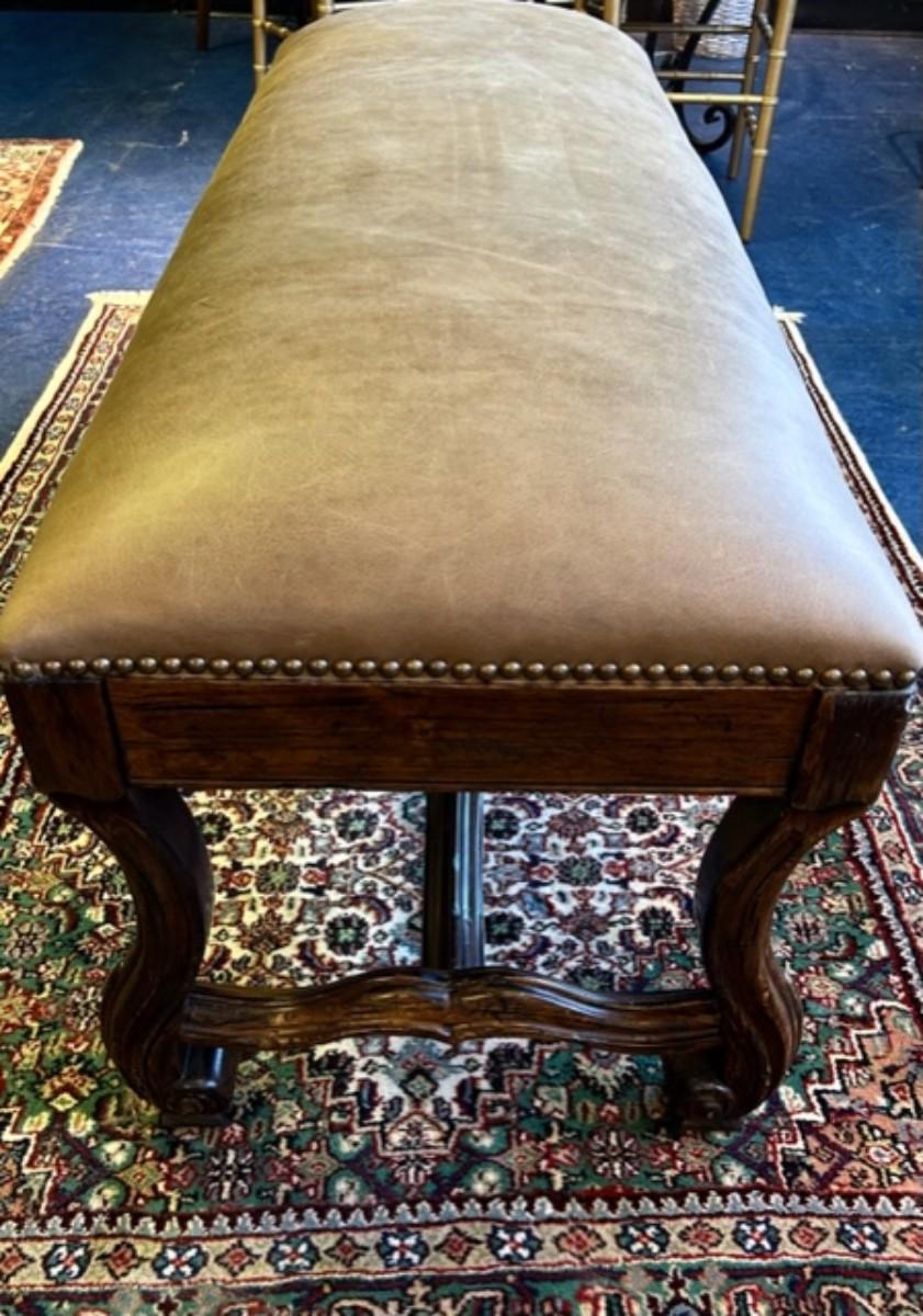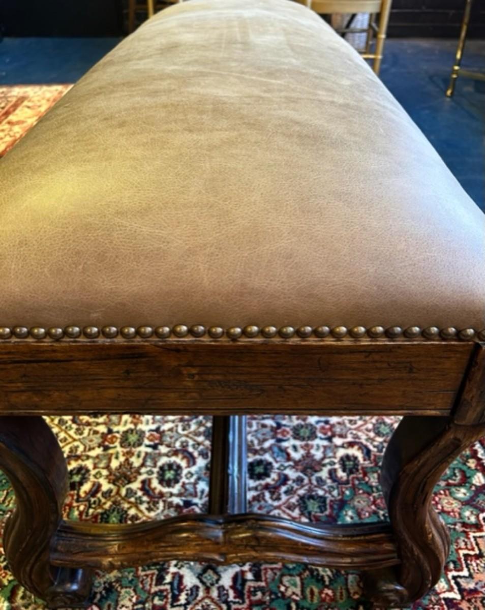 Leather bench with nail head trim and solid wood base. Good condition, a few minor scuffs in leather, no tears. Nice aged patina.