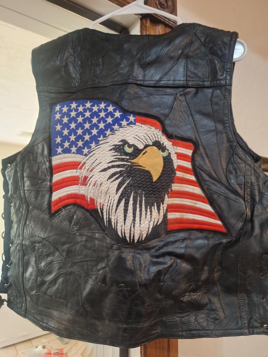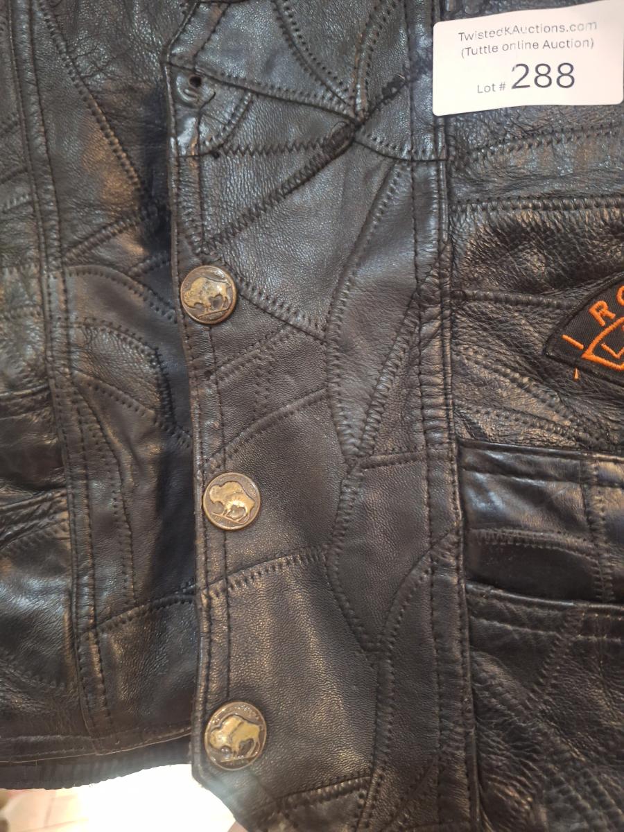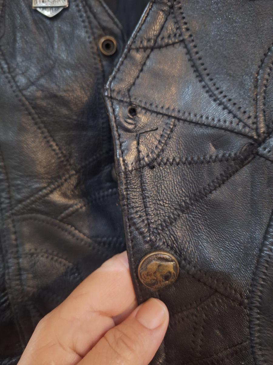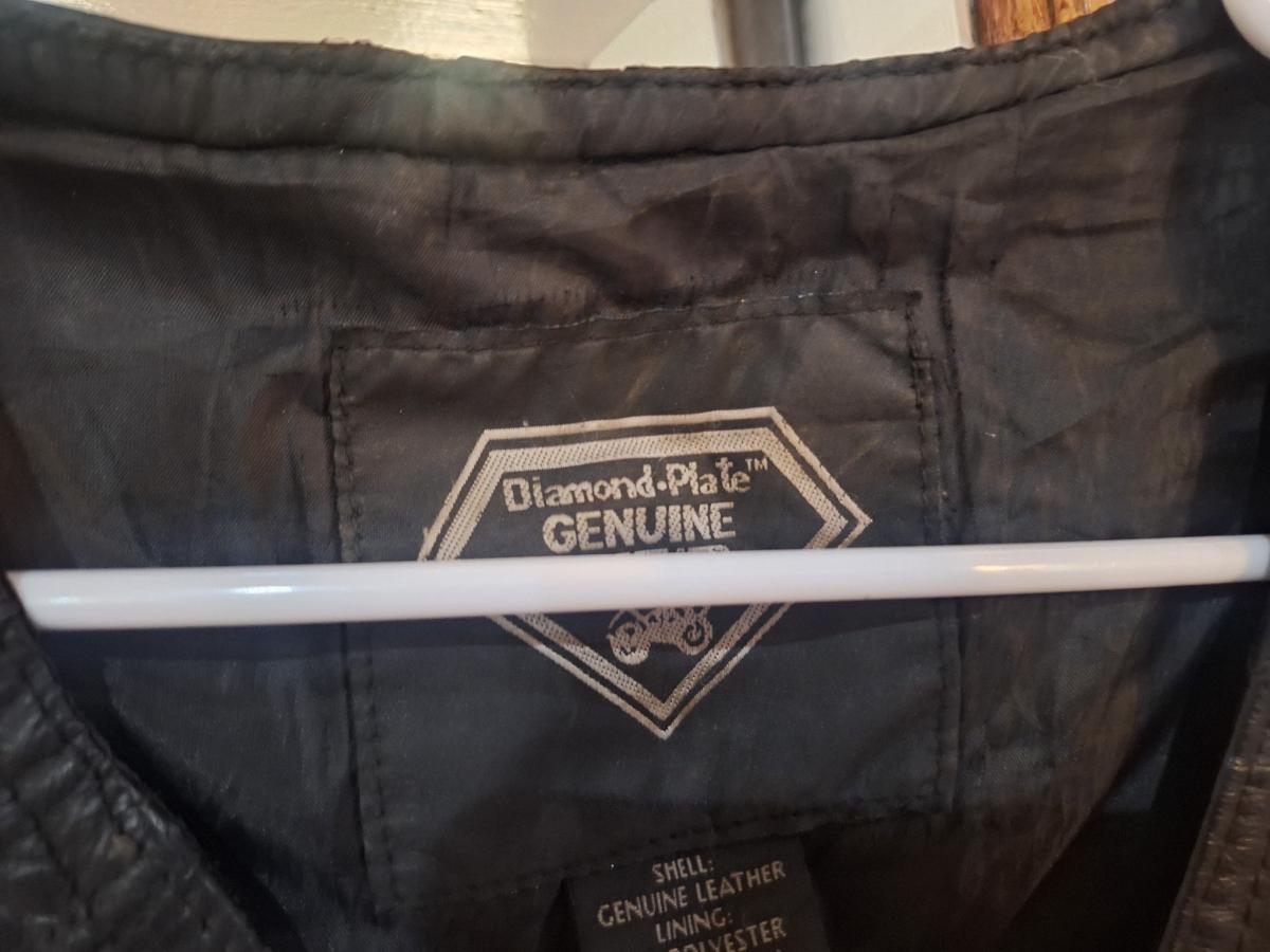 this is a personalized jacket. It also has some damage, notice that the top buffalo snap is missing the cover, the lace on the sides has damage. There may be other damage, please review the photos yourself for condition. This is leather.