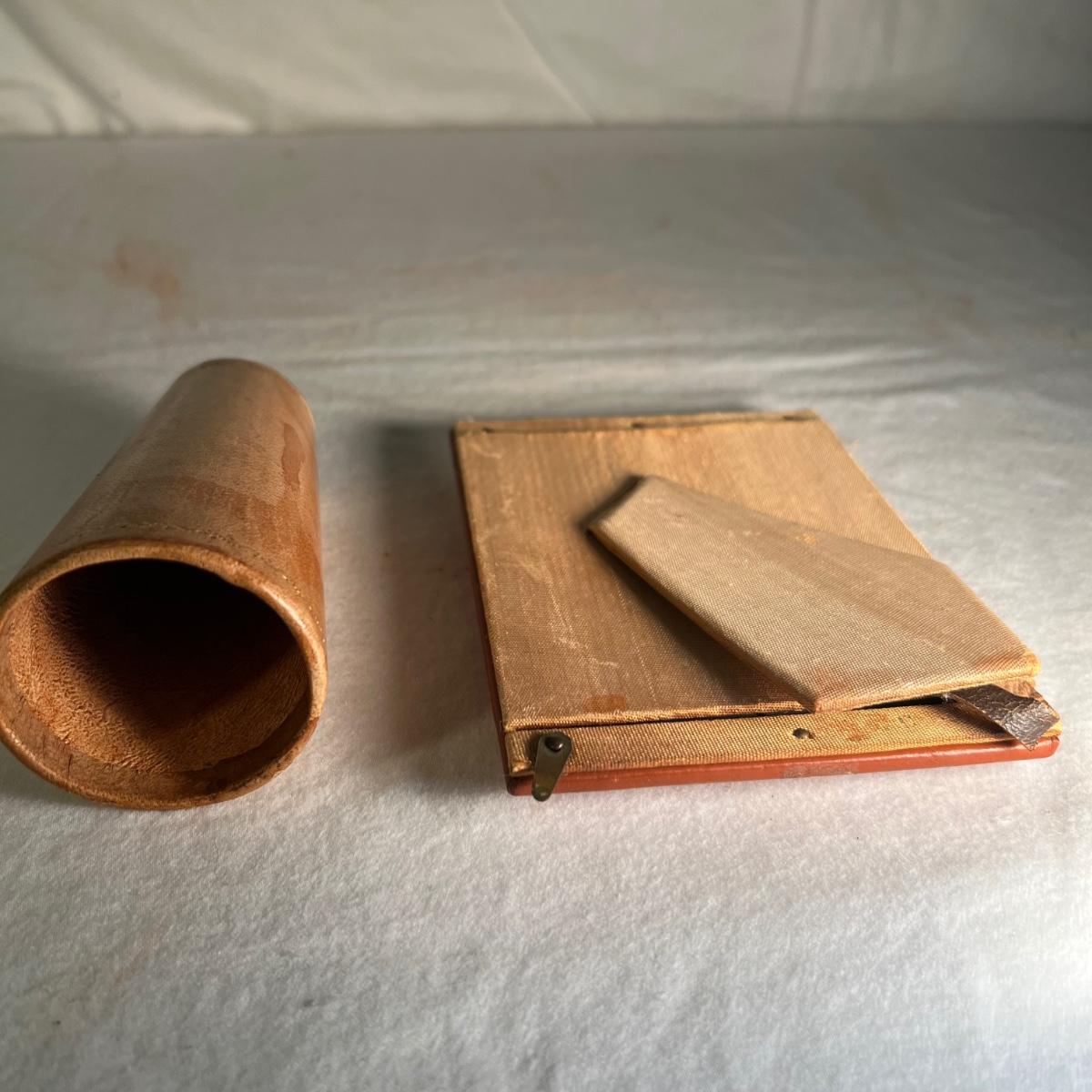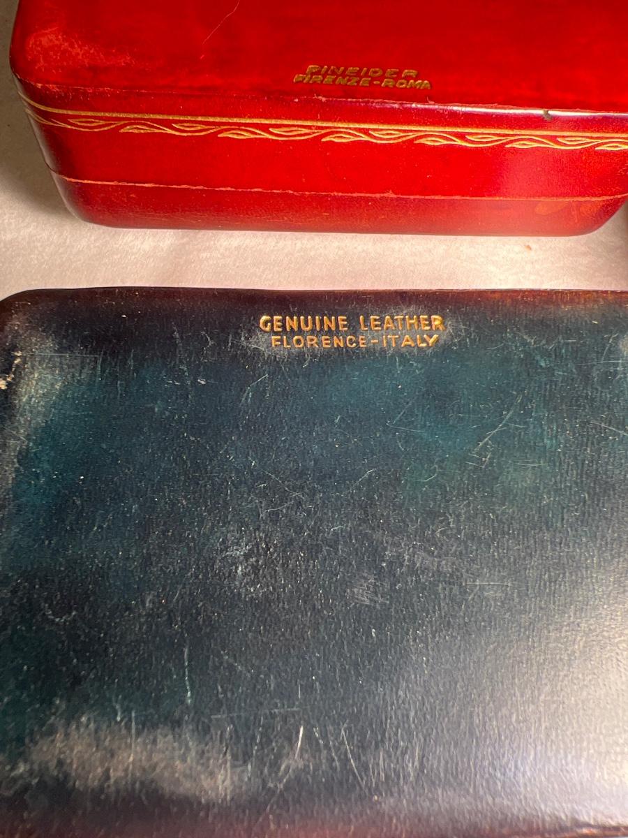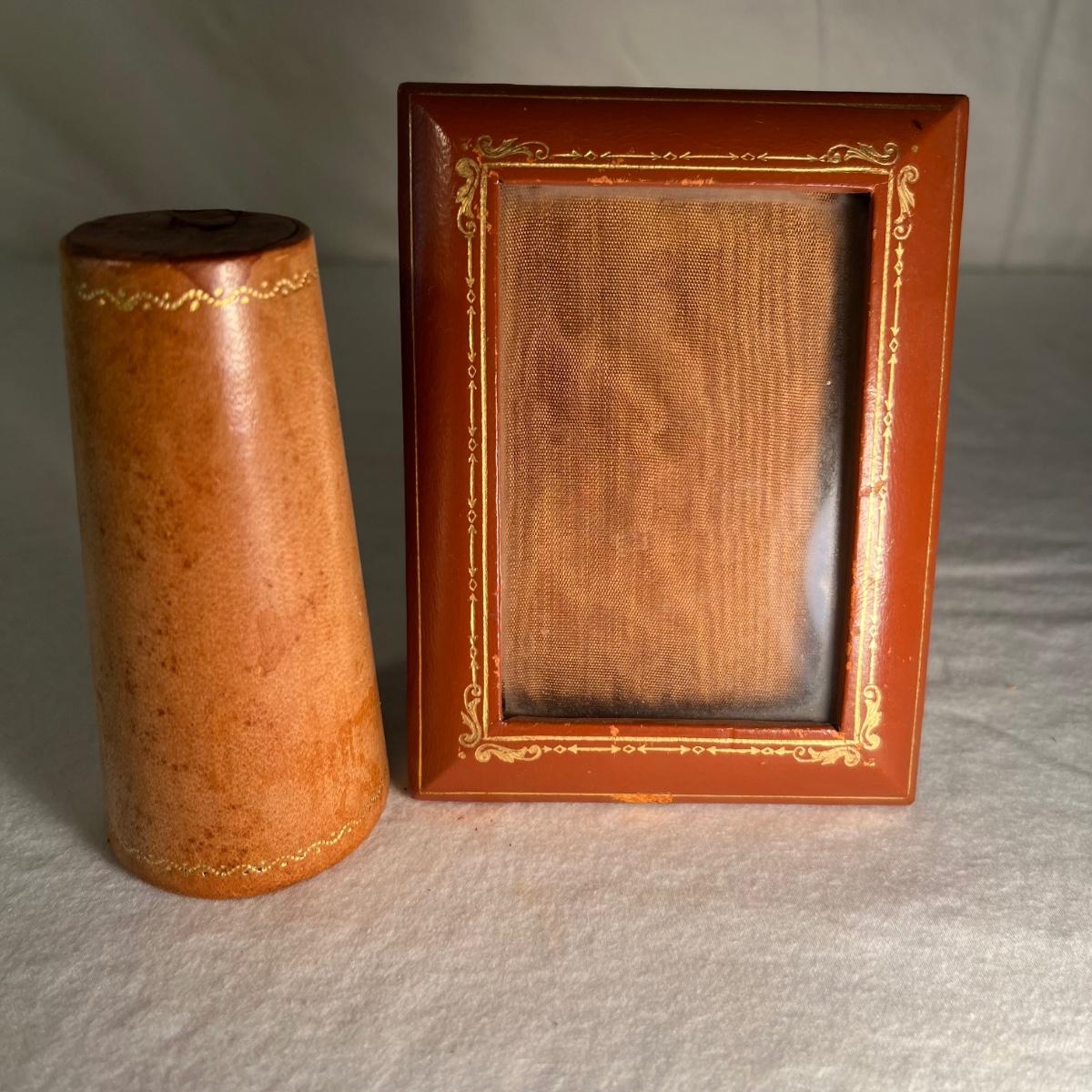 Items in this lot appear to be vintage and include two book covers, a soft and hard small photo frame (harder shell frame has glass, the other plastic photo covers) three small trinket boxes and more. The magnifier has a plastic brown surround and it swivels into a leather holder. Only one item is stamped Genuine Leather; no other labels were found to verify material. Some items show minor wear from age and the magnifier case has remnants of a sticker, see images.