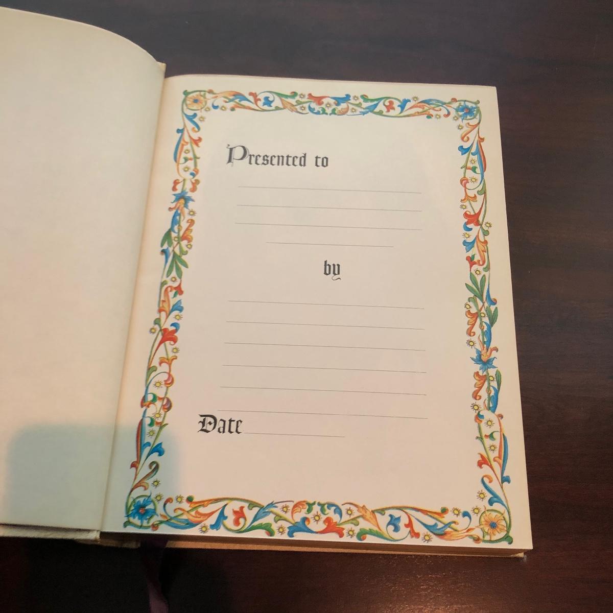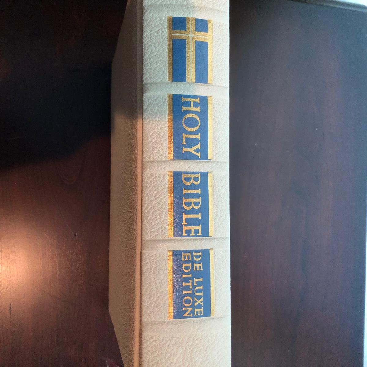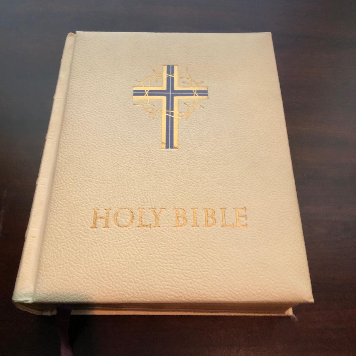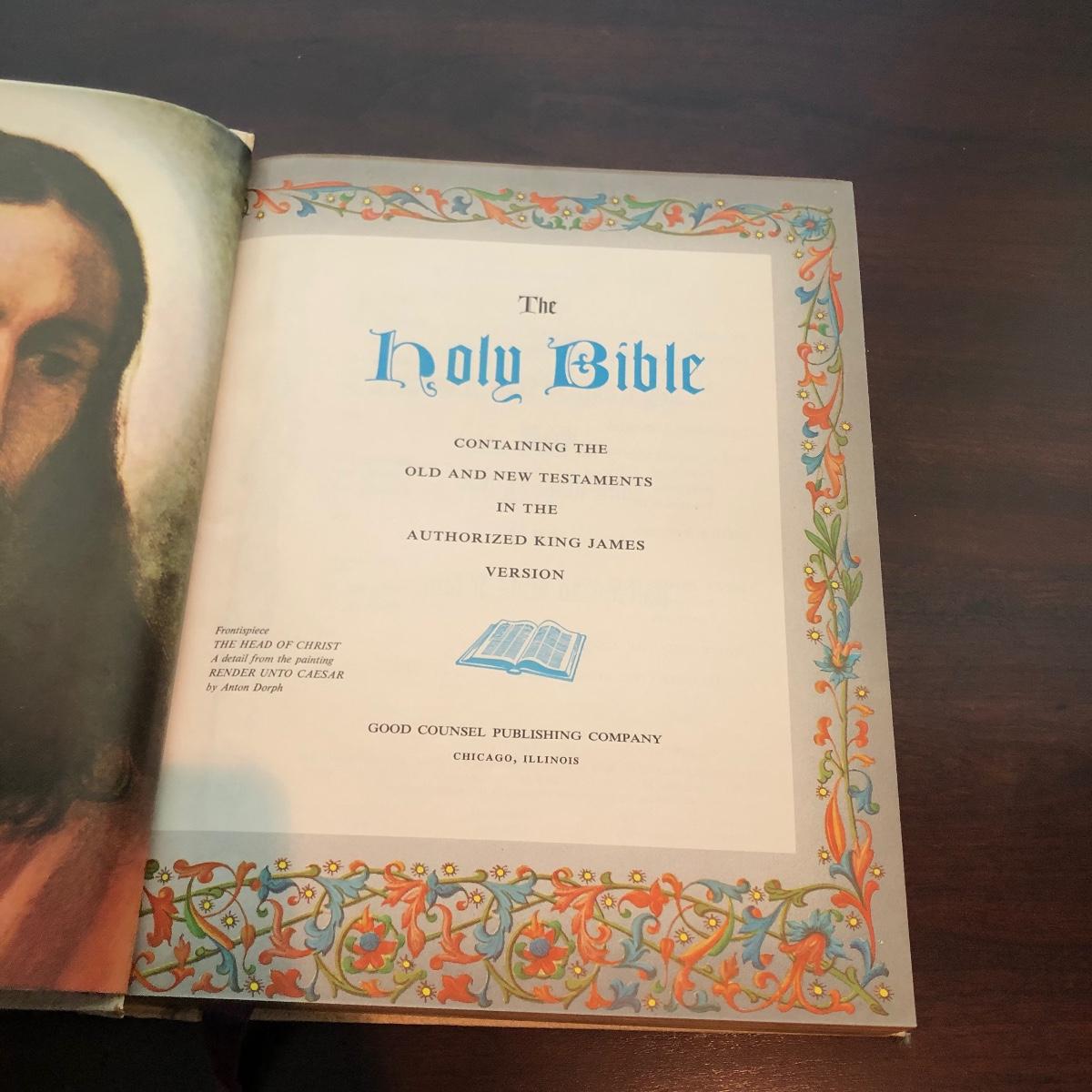 Lot includes a leather bound Bible published by the Good Counsel Publishing Company. Book measures 9” x 11” x 3”.