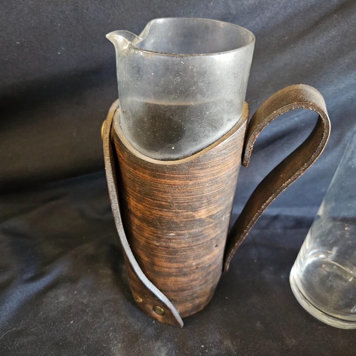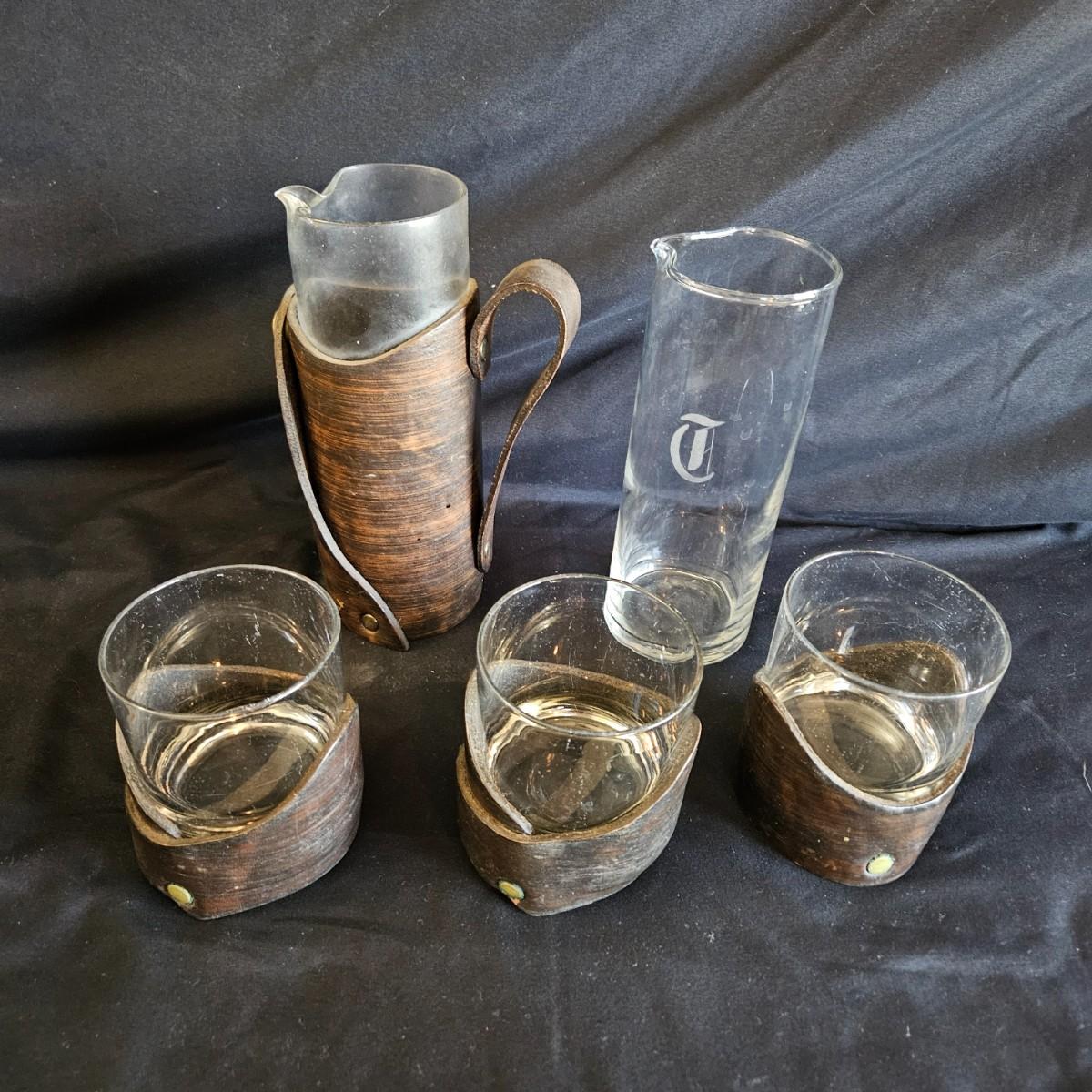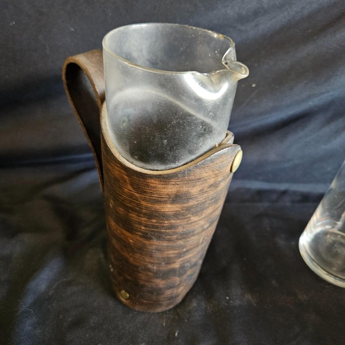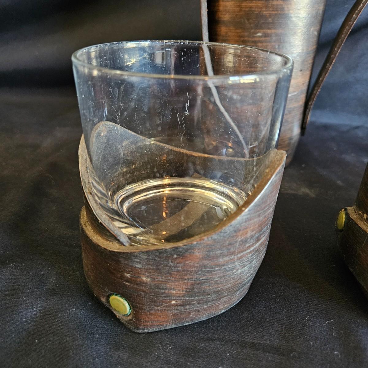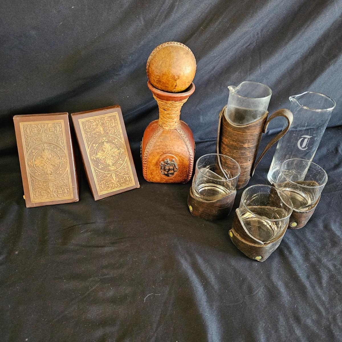 A grouping of leather bound items that includes embossed bookends and a leather wrapped decanter that measures approximately 4.5" x 4.5" x 12"H. It appears that the glass is broken on the top of the decanter. Also includes a pitcher and glasses that are leather wrapped with brass buttons. Shipping available