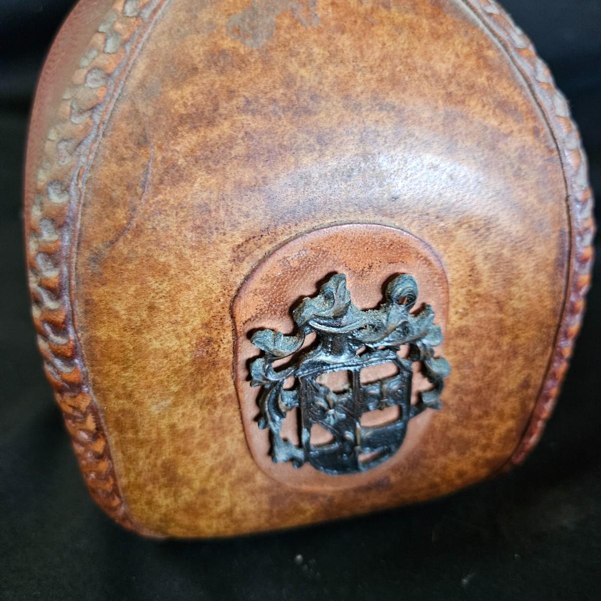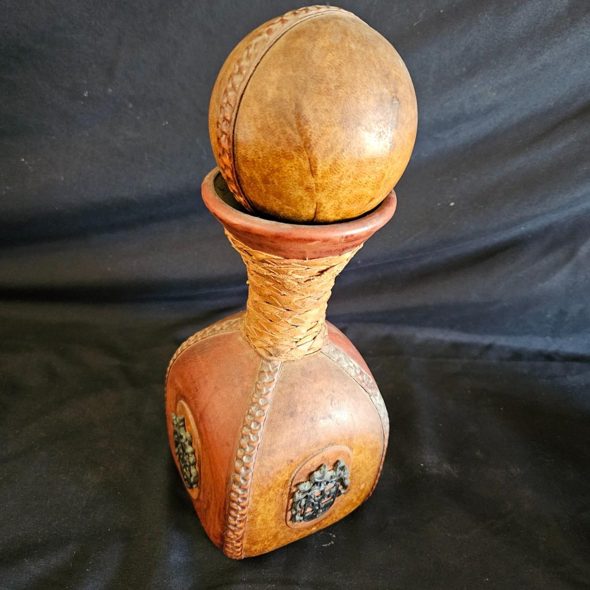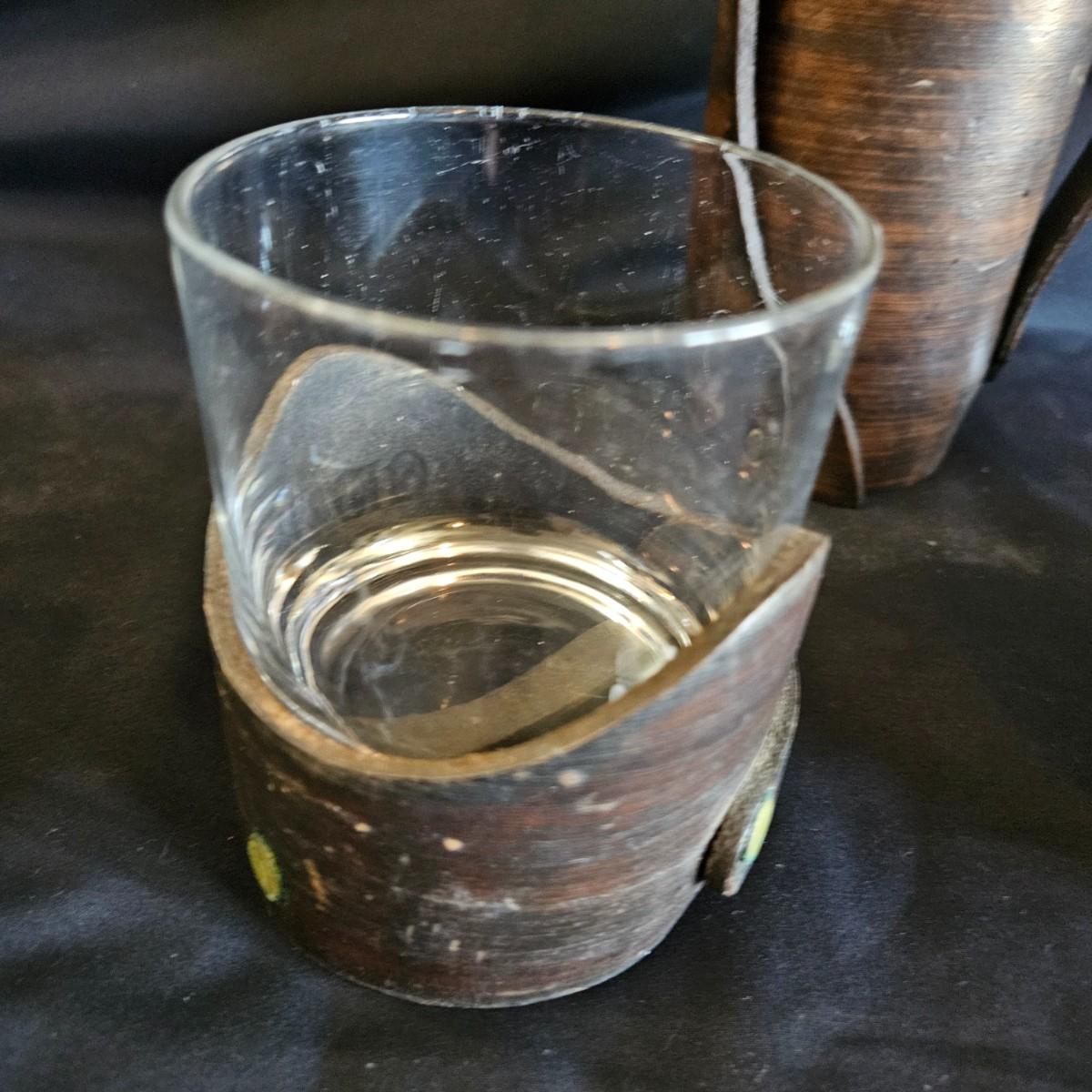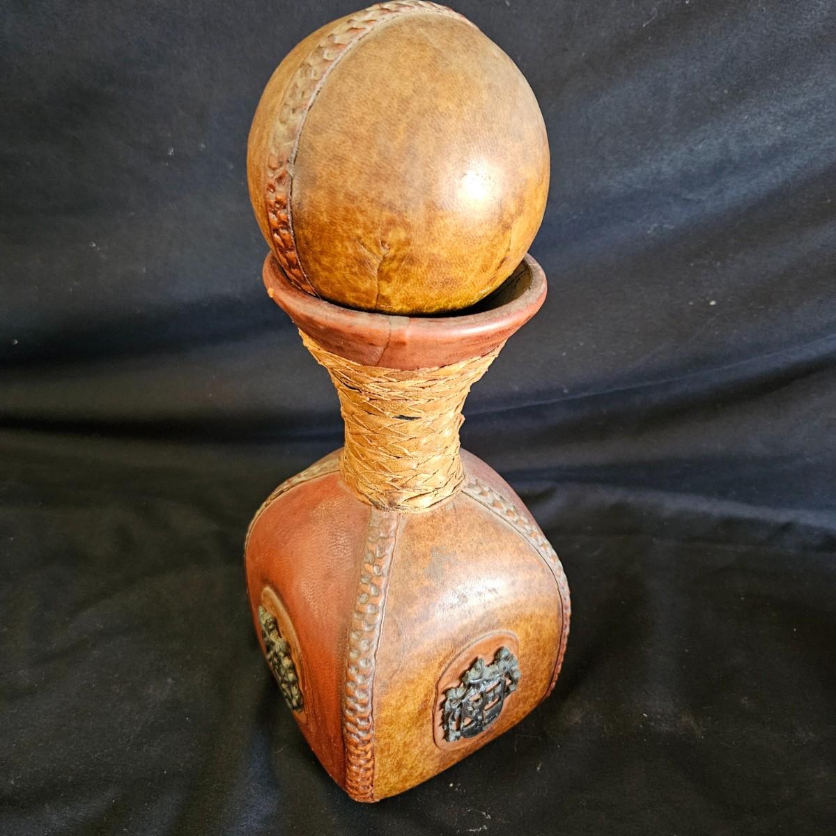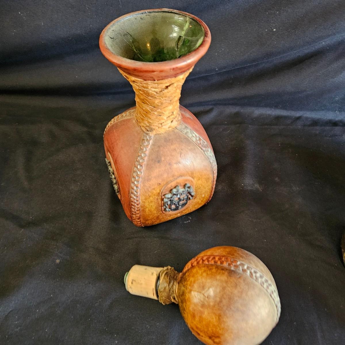 A grouping of leather bound items that includes embossed bookends and a leather wrapped decanter that measures approximately 4.5" x 4.5" x 12"H. It appears that the glass is broken on the top of the decanter. Also includes a pitcher and glasses that are leather wrapped with brass buttons. Shipping available