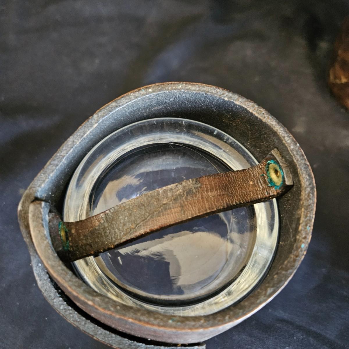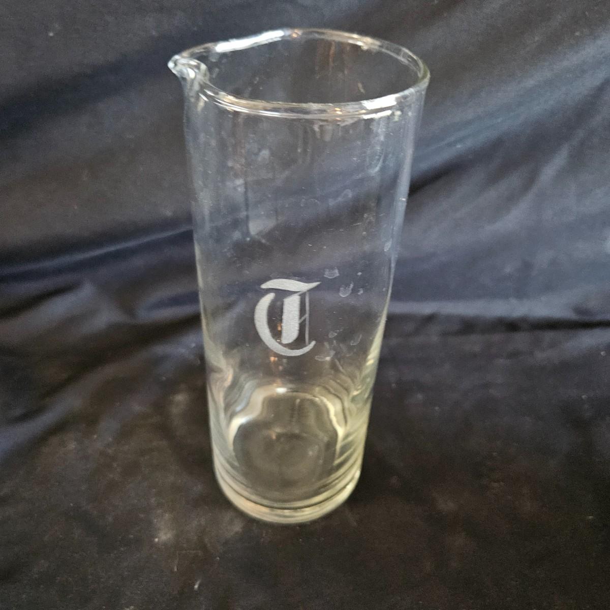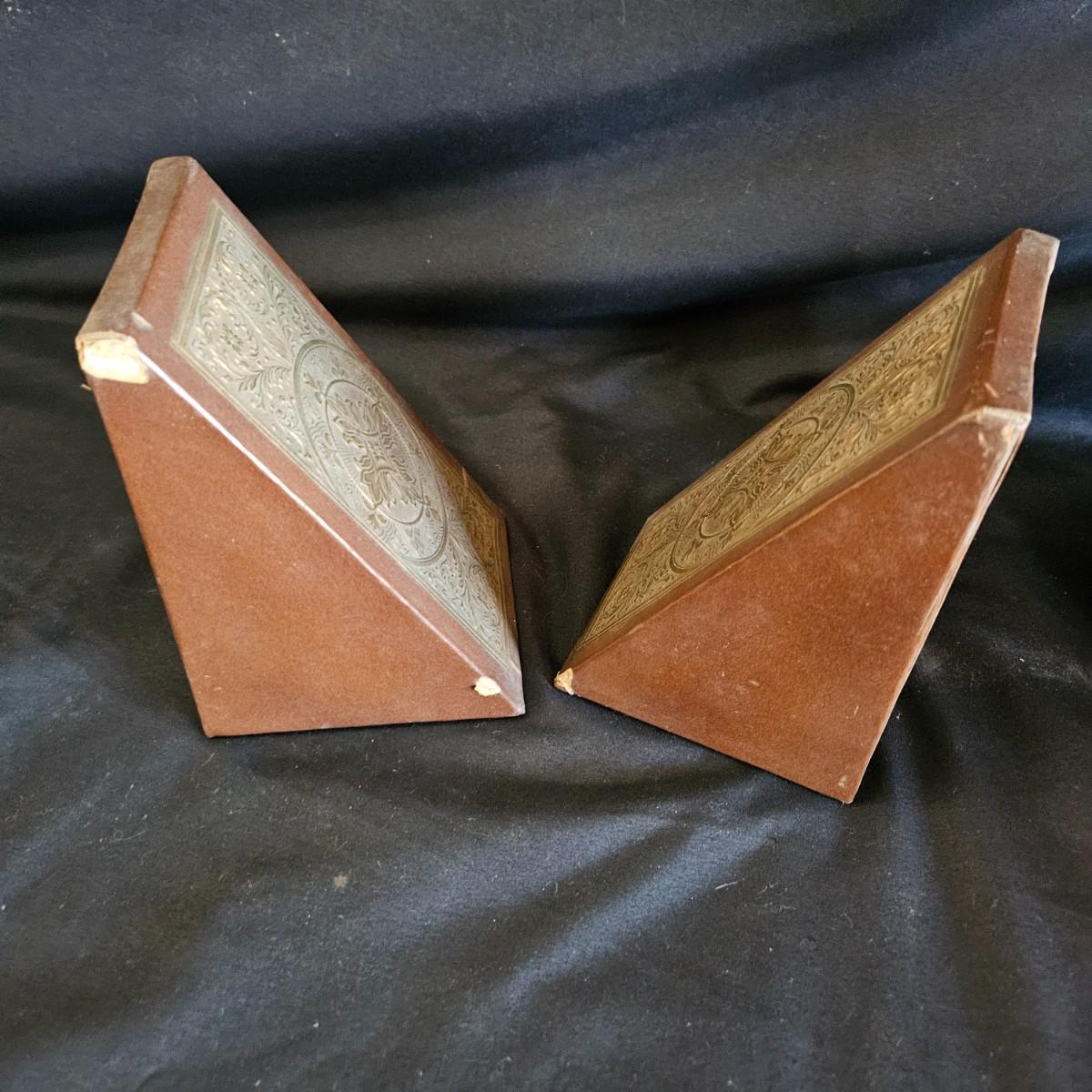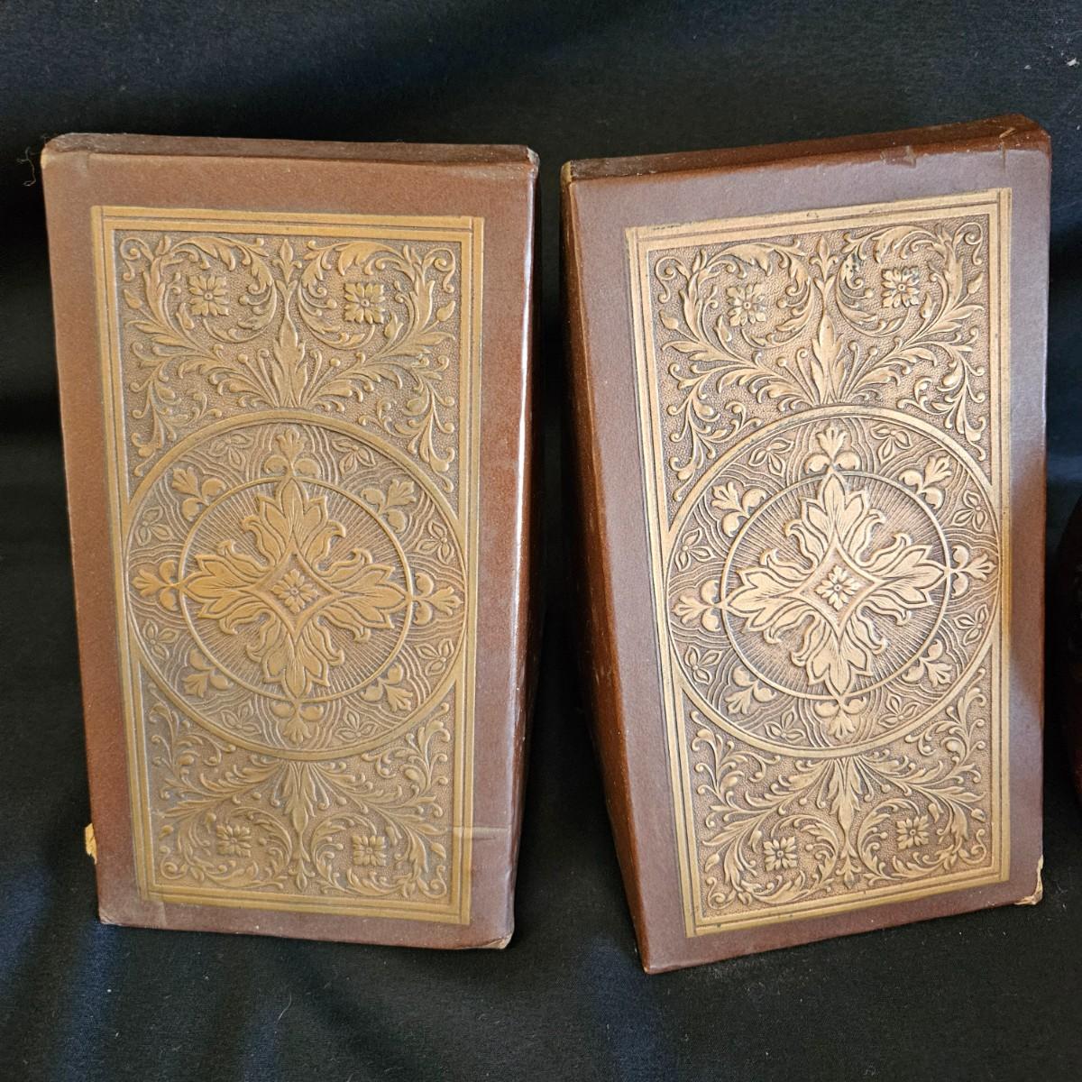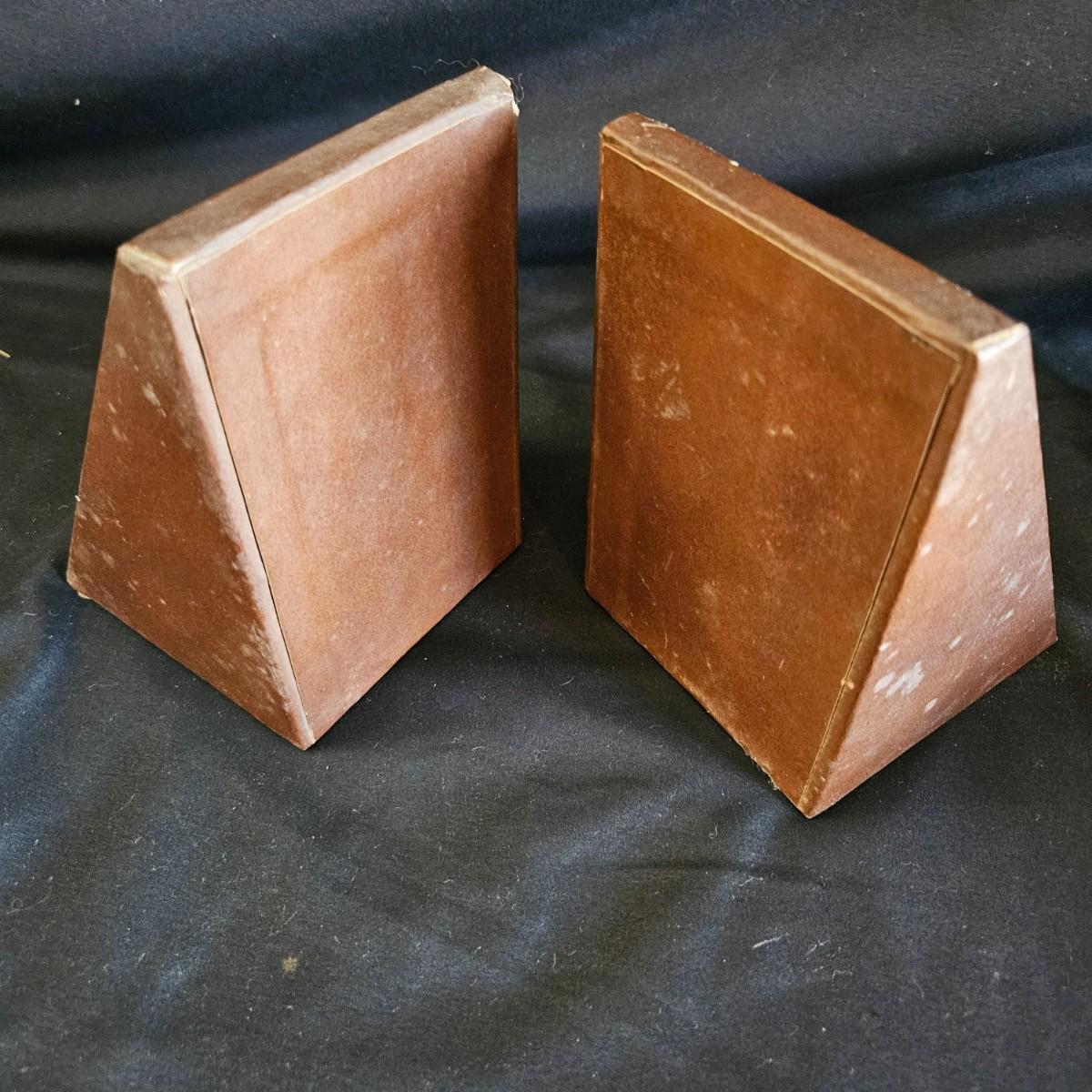 A grouping of leather bound items that includes embossed bookends and a leather wrapped decanter that measures approximately 4.5" x 4.5" x 12"H. It appears that the glass is broken on the top of the decanter. Also includes a pitcher and glasses that are leather wrapped with brass buttons. Shipping available