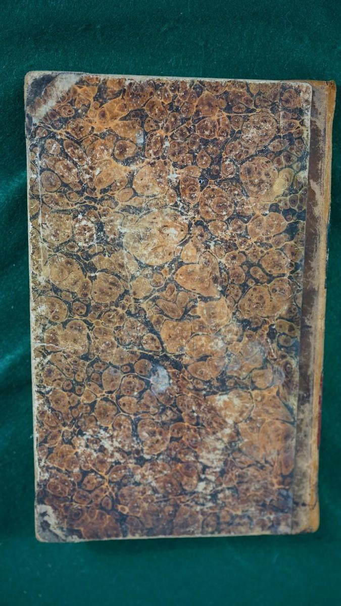 Condition. The binding is good. The pages are of handmade paper. There is brown stains on the pages most along the edges. for the age it is good. The cover is intact but worn around the edges.