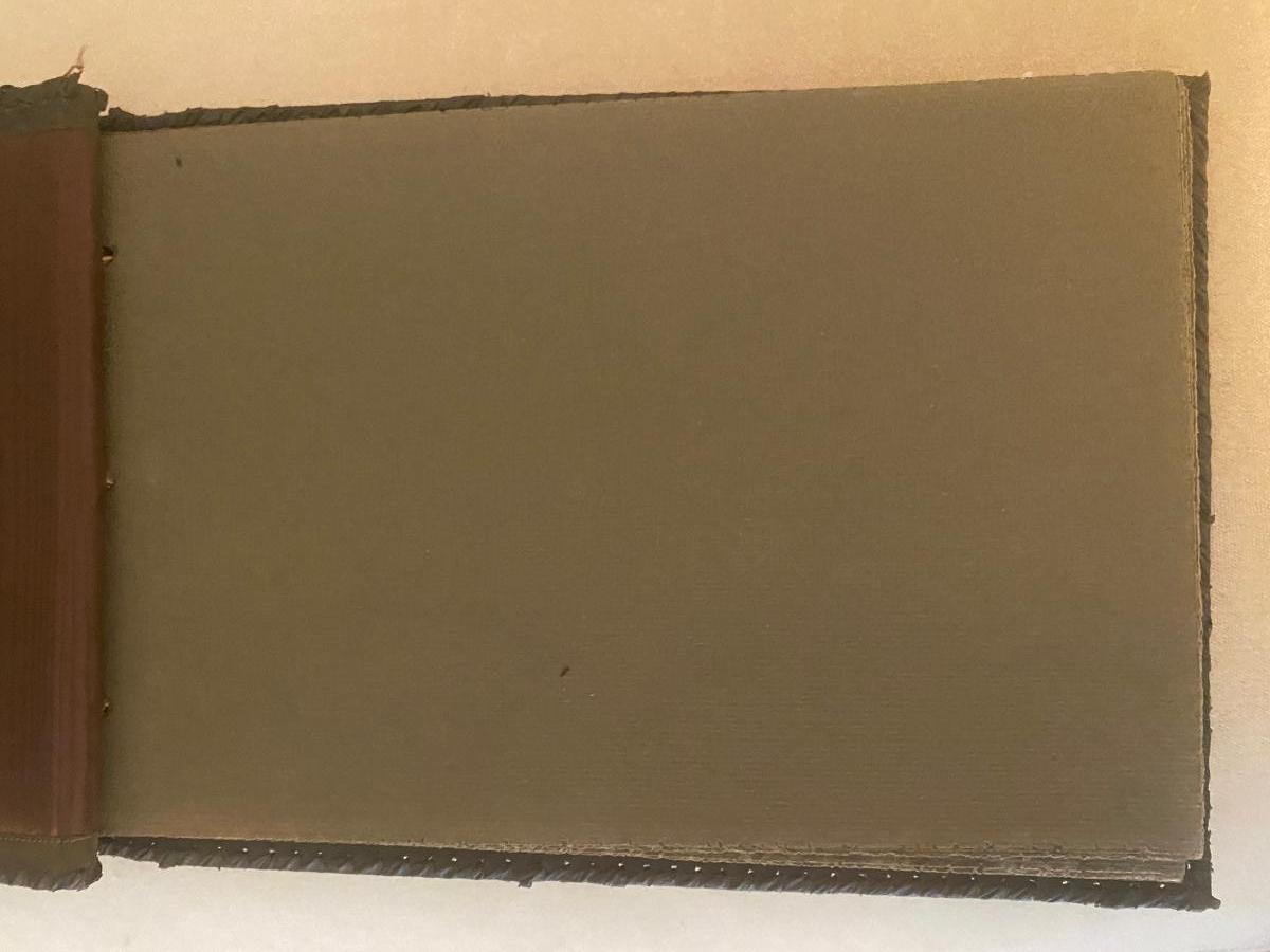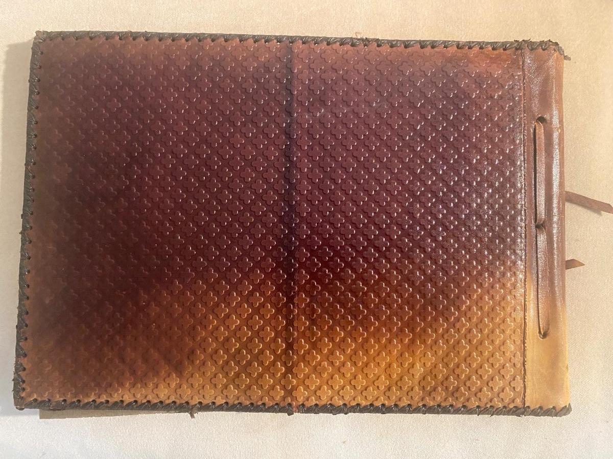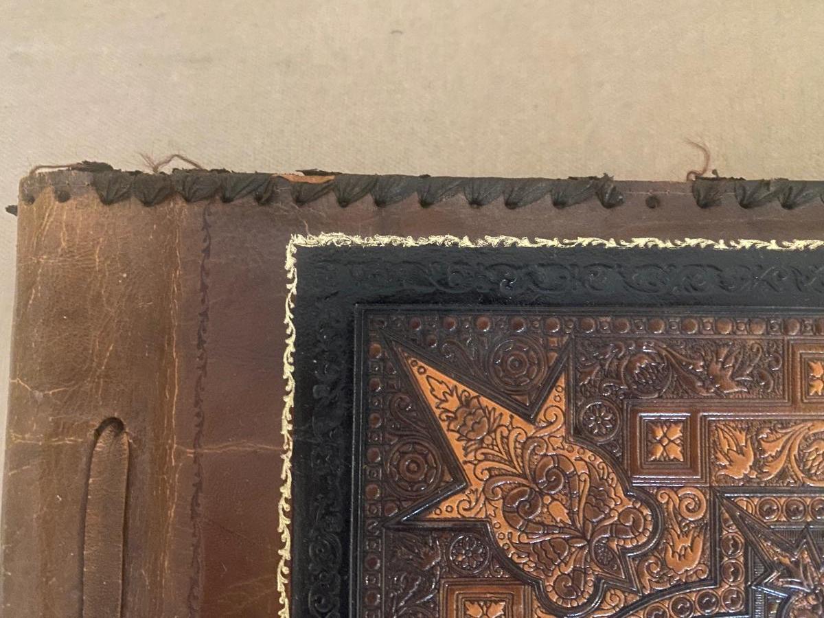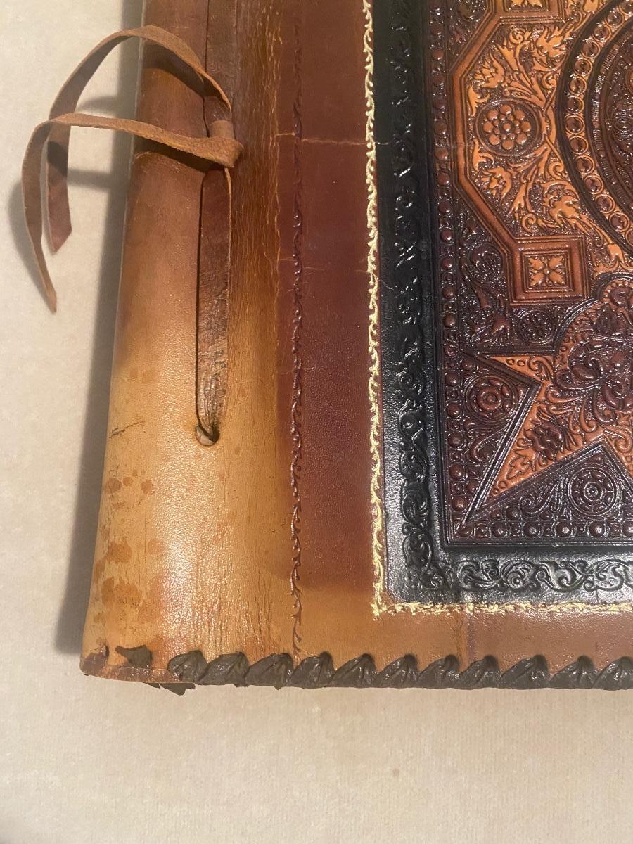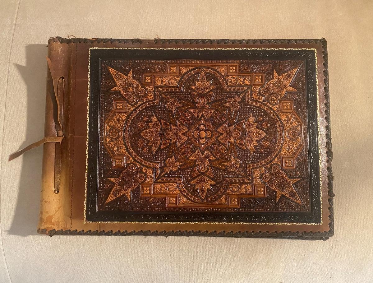 Leather Bound embossed photo album. Has some discoloration and missing some leather trim.