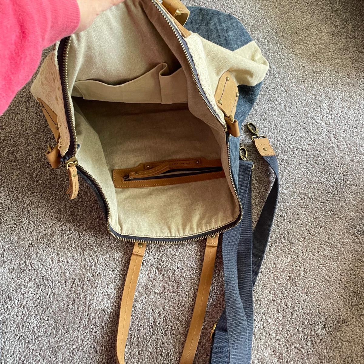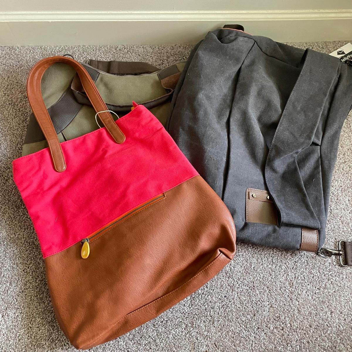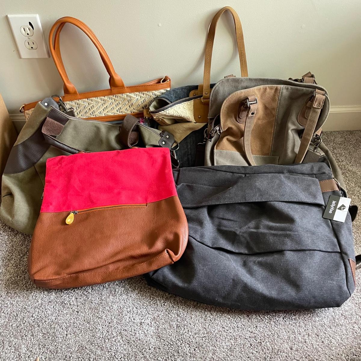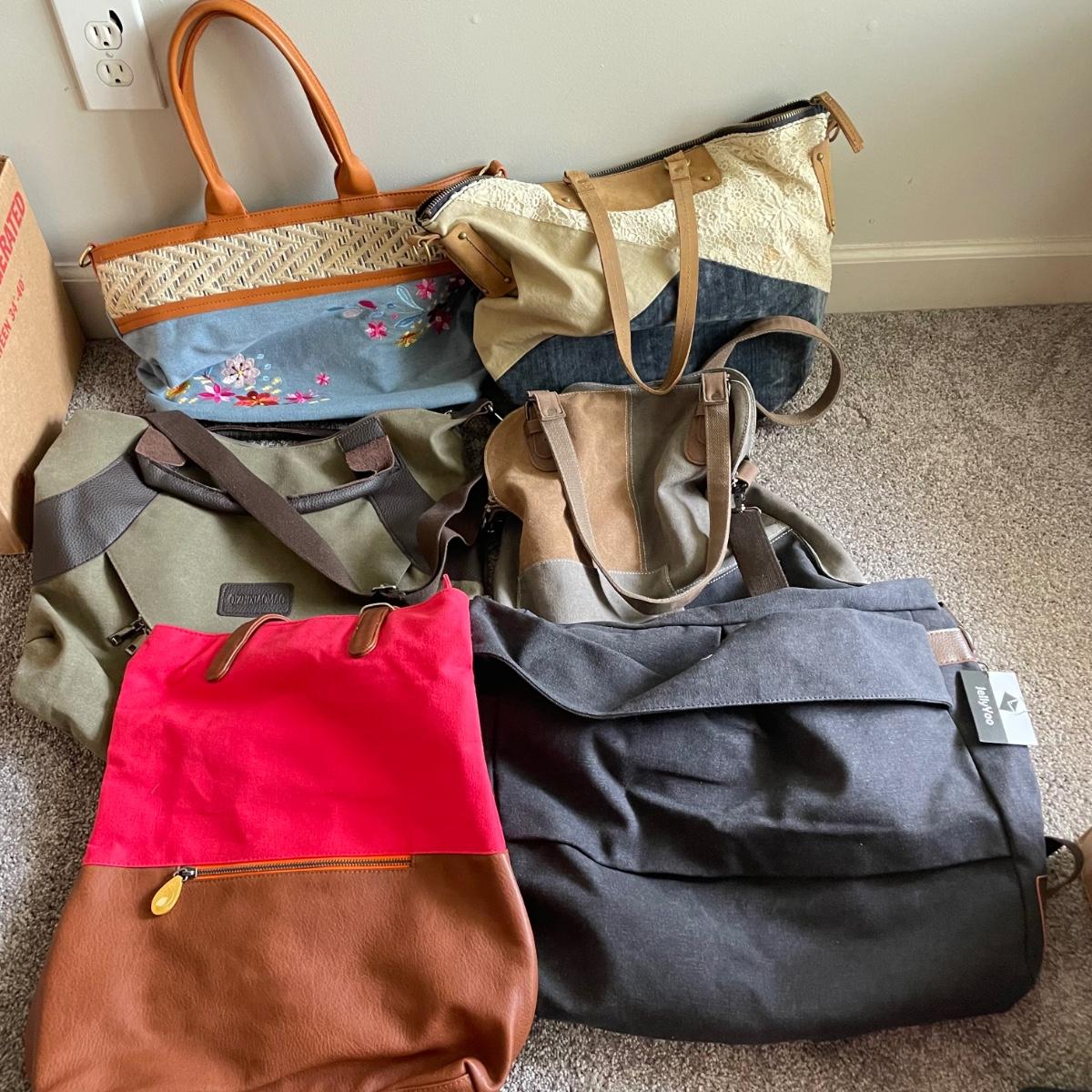 Six weekender style bags with a few like-new larger bags show hints that they haven’t been used yet- like tags or plastic covering the zipper. All appear to have been made with canvas and leather or suede. Tags include Jelly Yoo and Canopy Verde which both appear to be a convertible style bag with back straps you can use or not. Other brands include Qizhxiaomao and Schuler & Sons (this one has a stain on its crocheted lace front, see photos) The Jelly Yoo bag measures approximately 17” x 6” x 14”H without its crossbody/shoulder strap. See images. Shipping available.