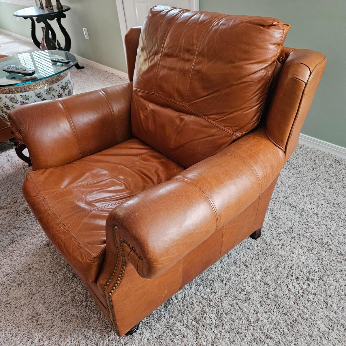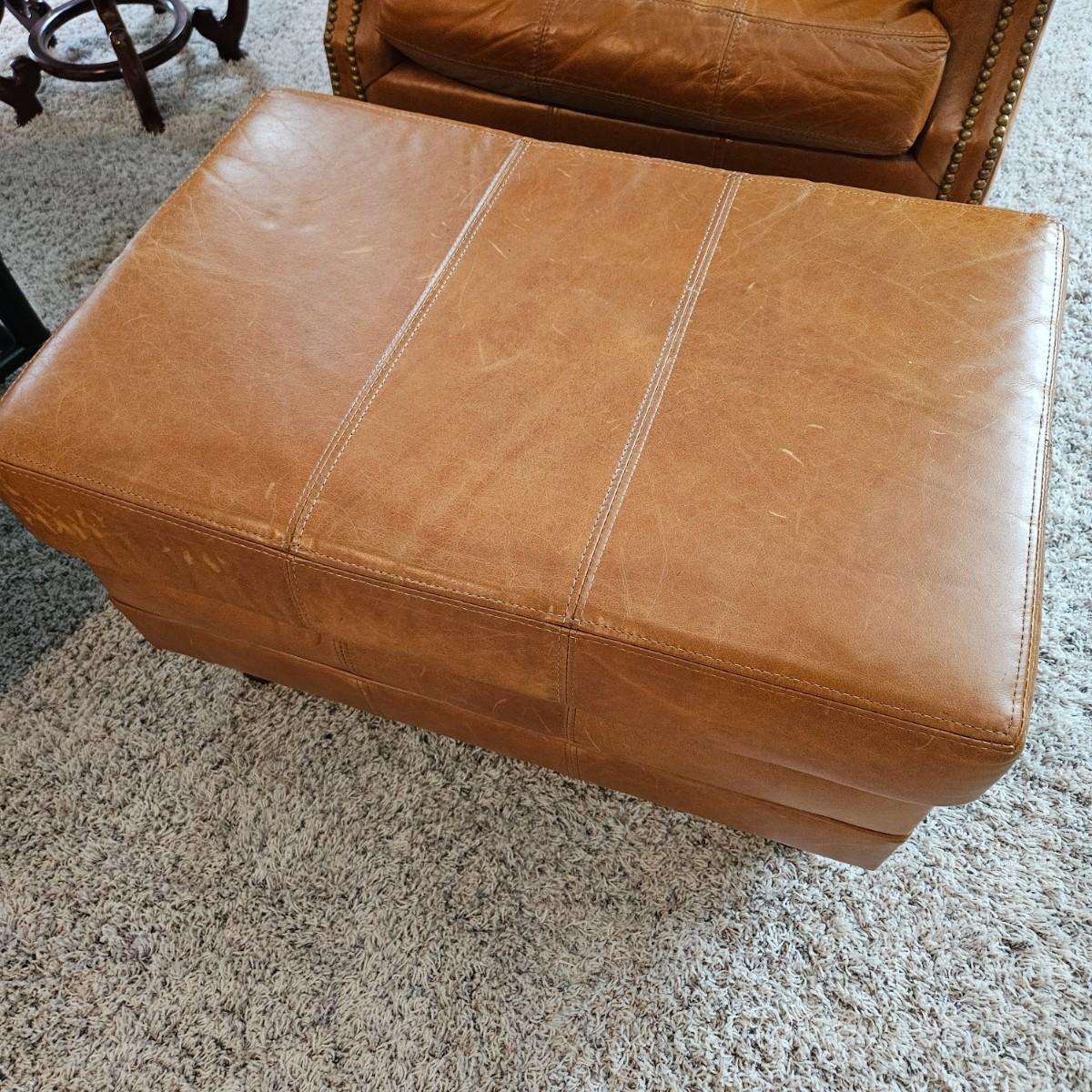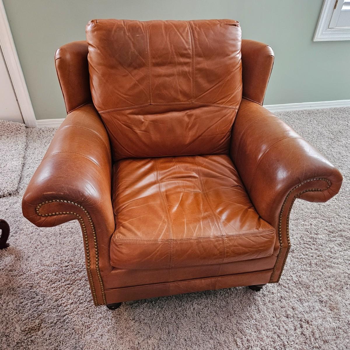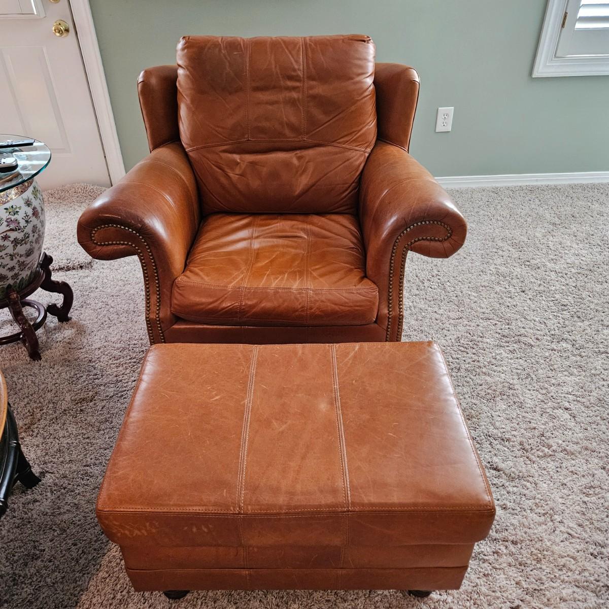 A leather chair with a matching ottoman that has a medium brown tone and brass upholstery buttons. The cover photo is very close to the actual color. It measures approximately 43" x 40" x 38"H with a seat height of 18". This item matches a couch also in this auction. Local pickup only. Winning bidder must bring assistance to help move and load this item due to its weight and/or size.
