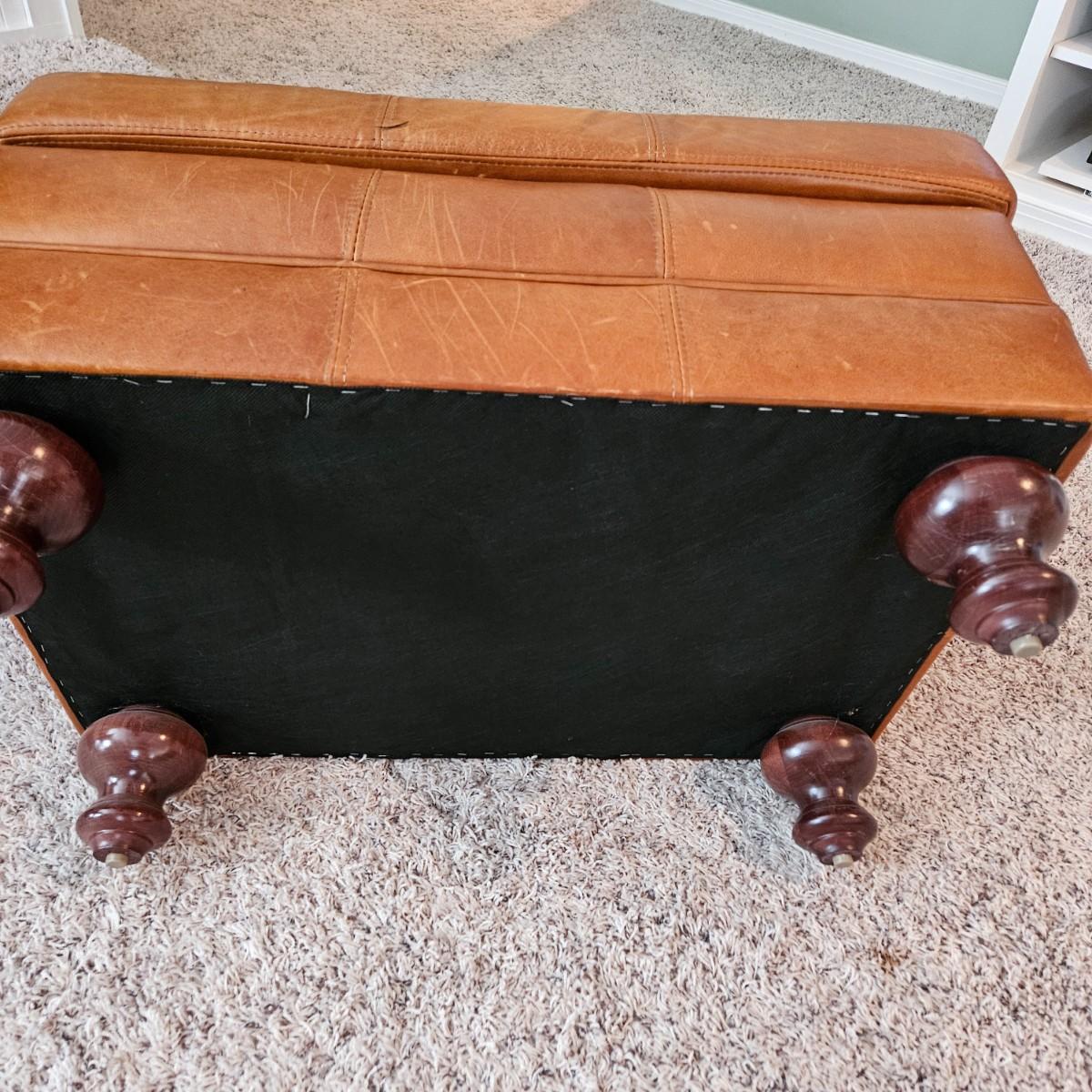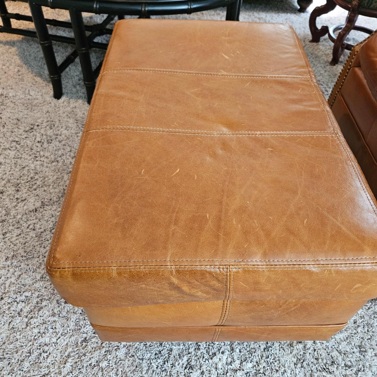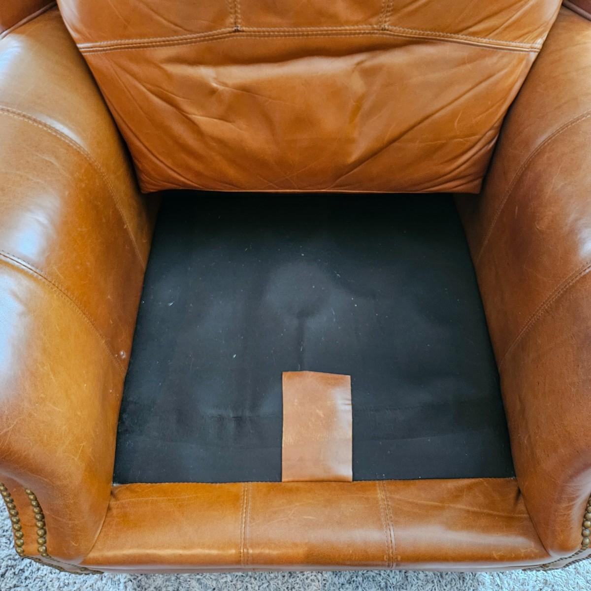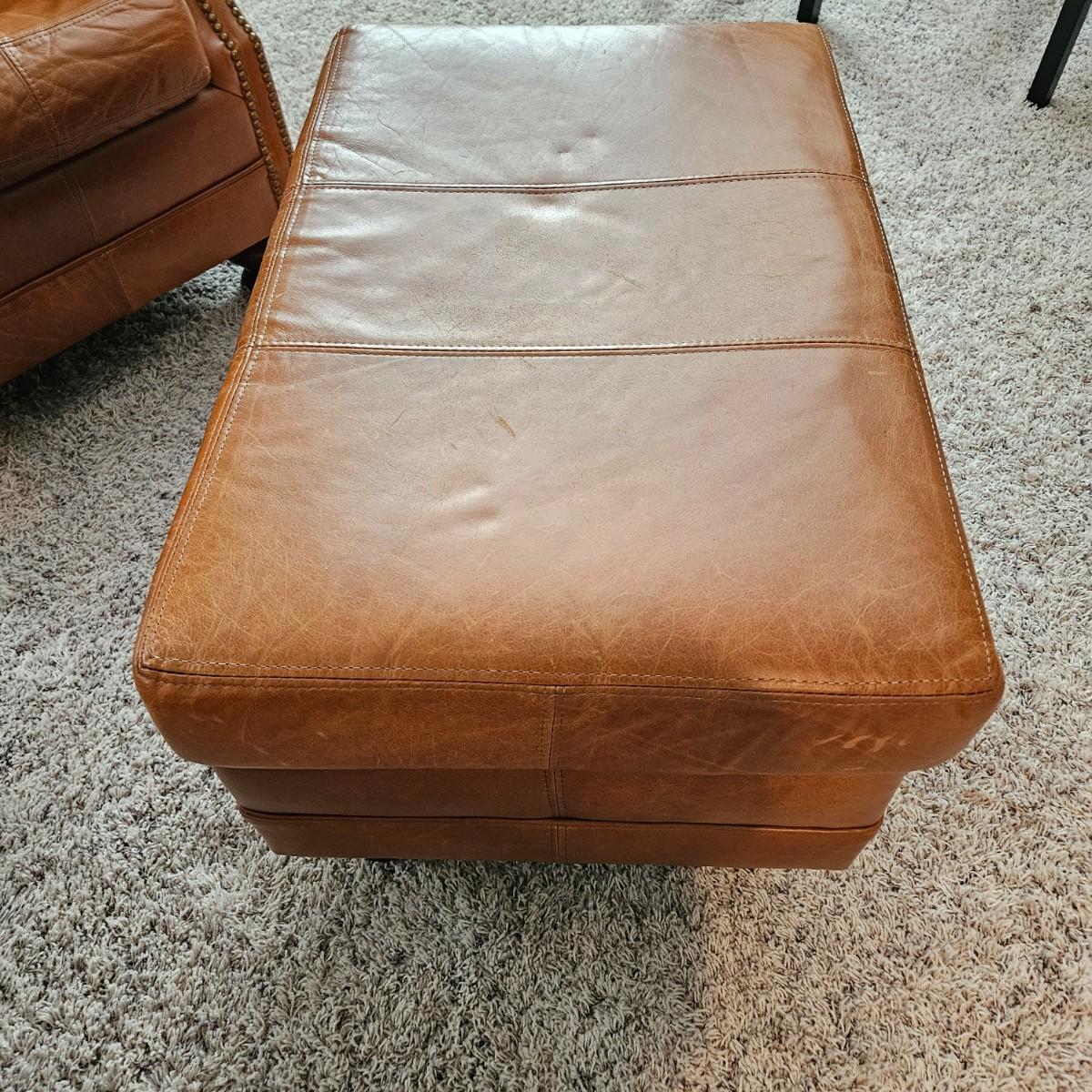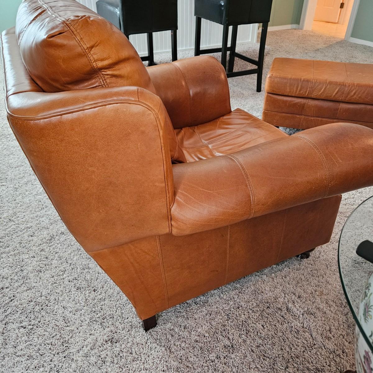A leather chair with a matching ottoman that has a medium brown tone and brass upholstery buttons. The cover photo is very close to the actual color. It measures approximately 43" x 40" x 38"H with a seat height of 18". This item matches a couch also in this auction. Local pickup only. Winning bidder must bring assistance to help move and load this item due to its weight and/or size.