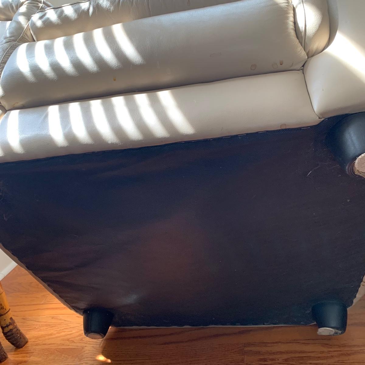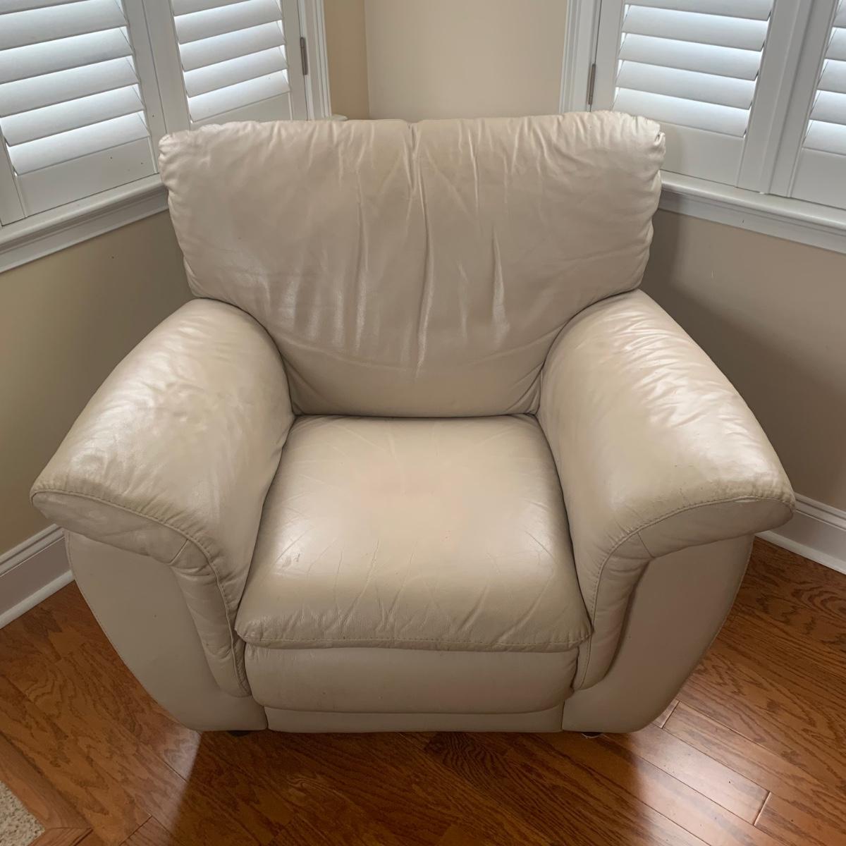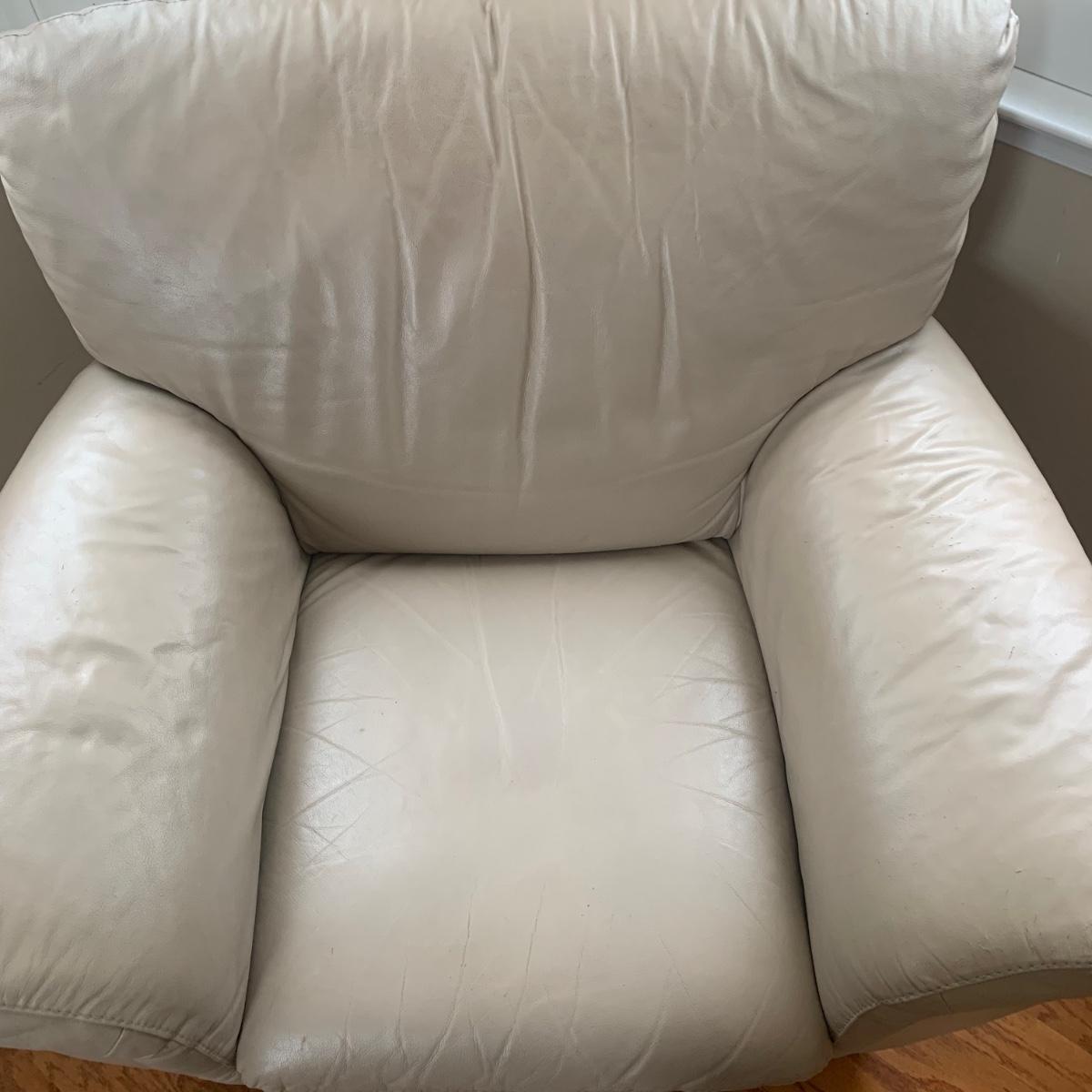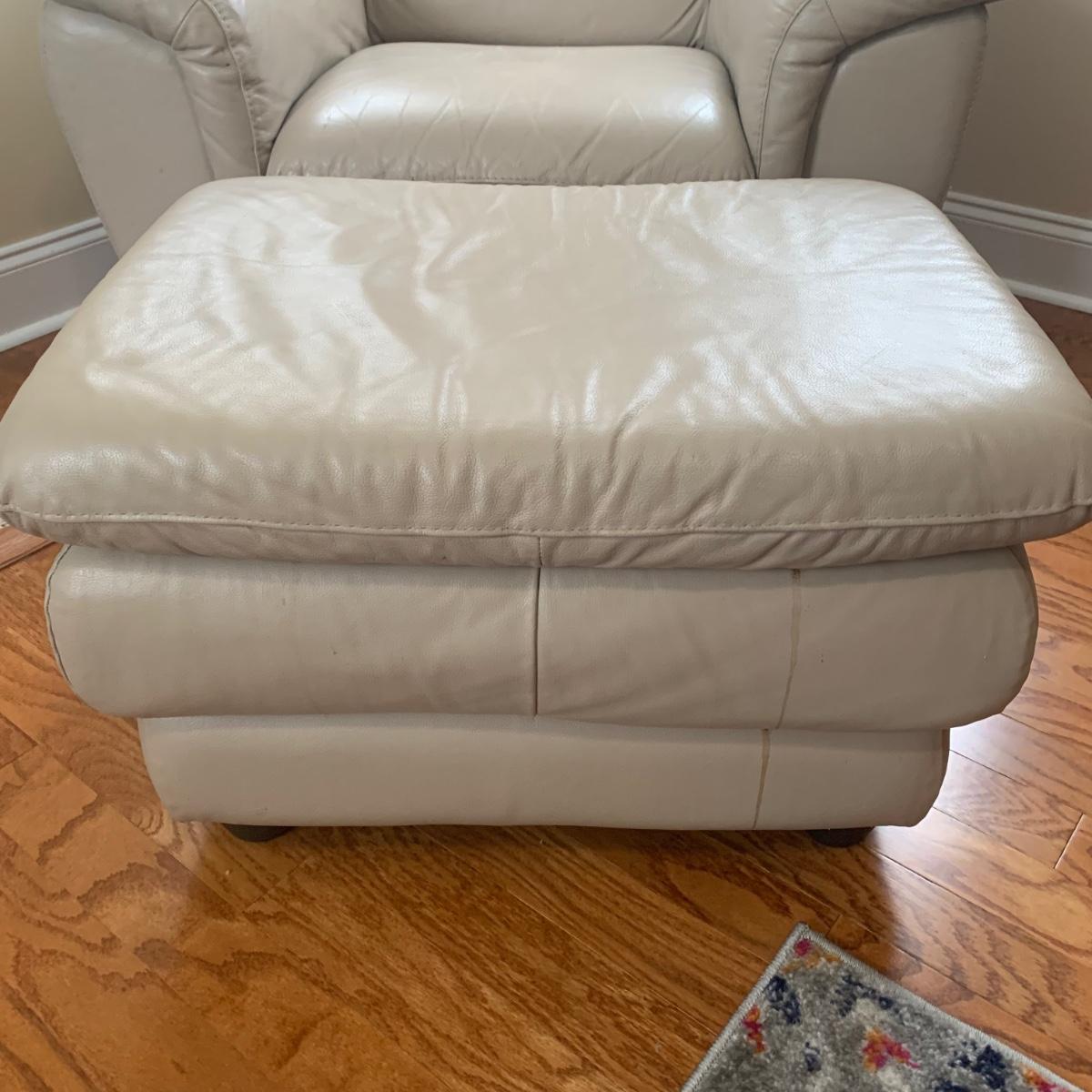 Chair that appears to be faux leather with matching ottoman. Exterior does have small blemishes and chair has small tear. However this piece is sturdy. Chair measures 41” x 34” x 35.5”H with a seat height of 17.5”H. Ottoman measures 27.5” x 19” x 18”H. This chair and ottoman are part of a set. There is a matching loveseat and sofa also found in this auction. Although no tag is found on this chair and ottoman, they appear to completely match the other pieces with tags showing they are from Chateau d’Ax.