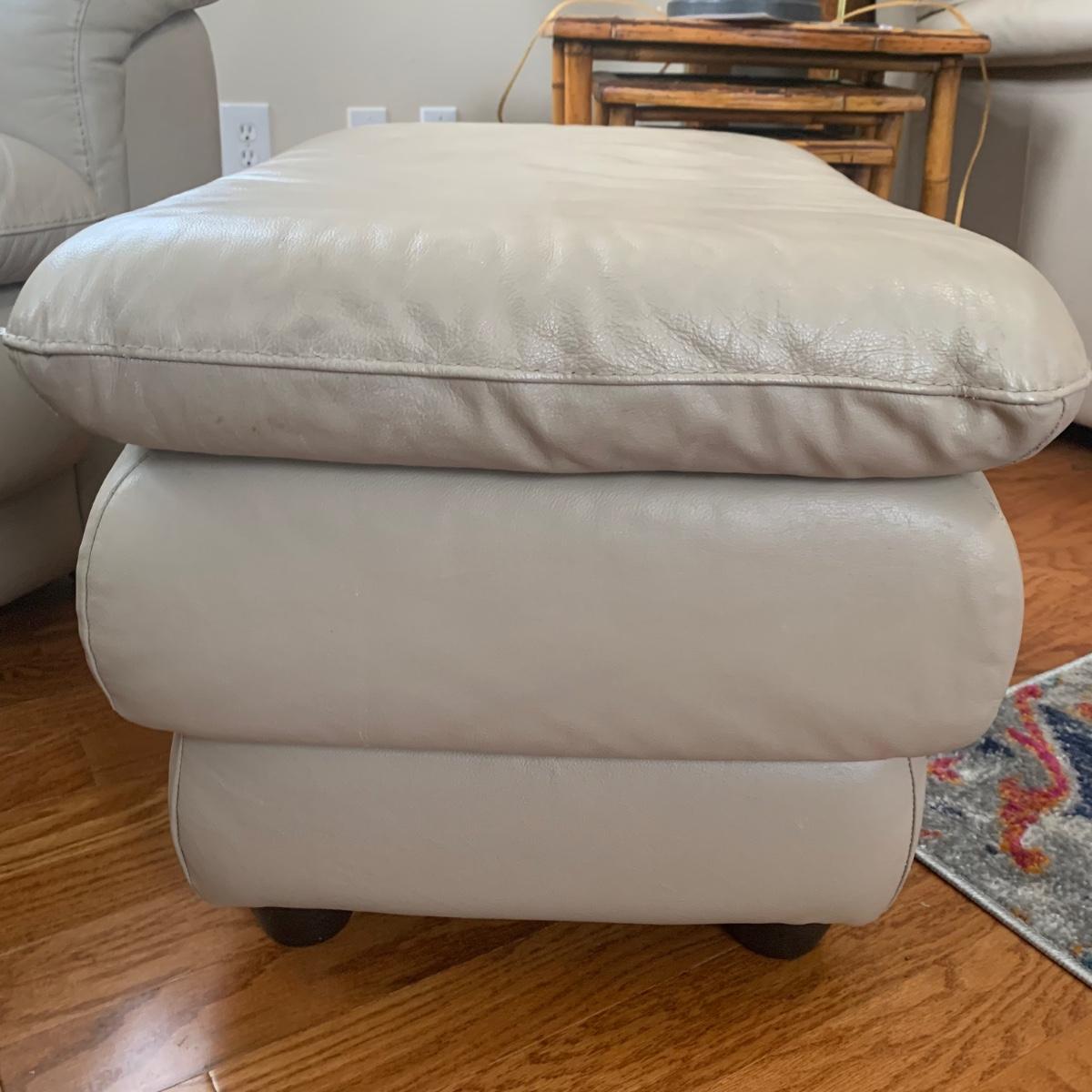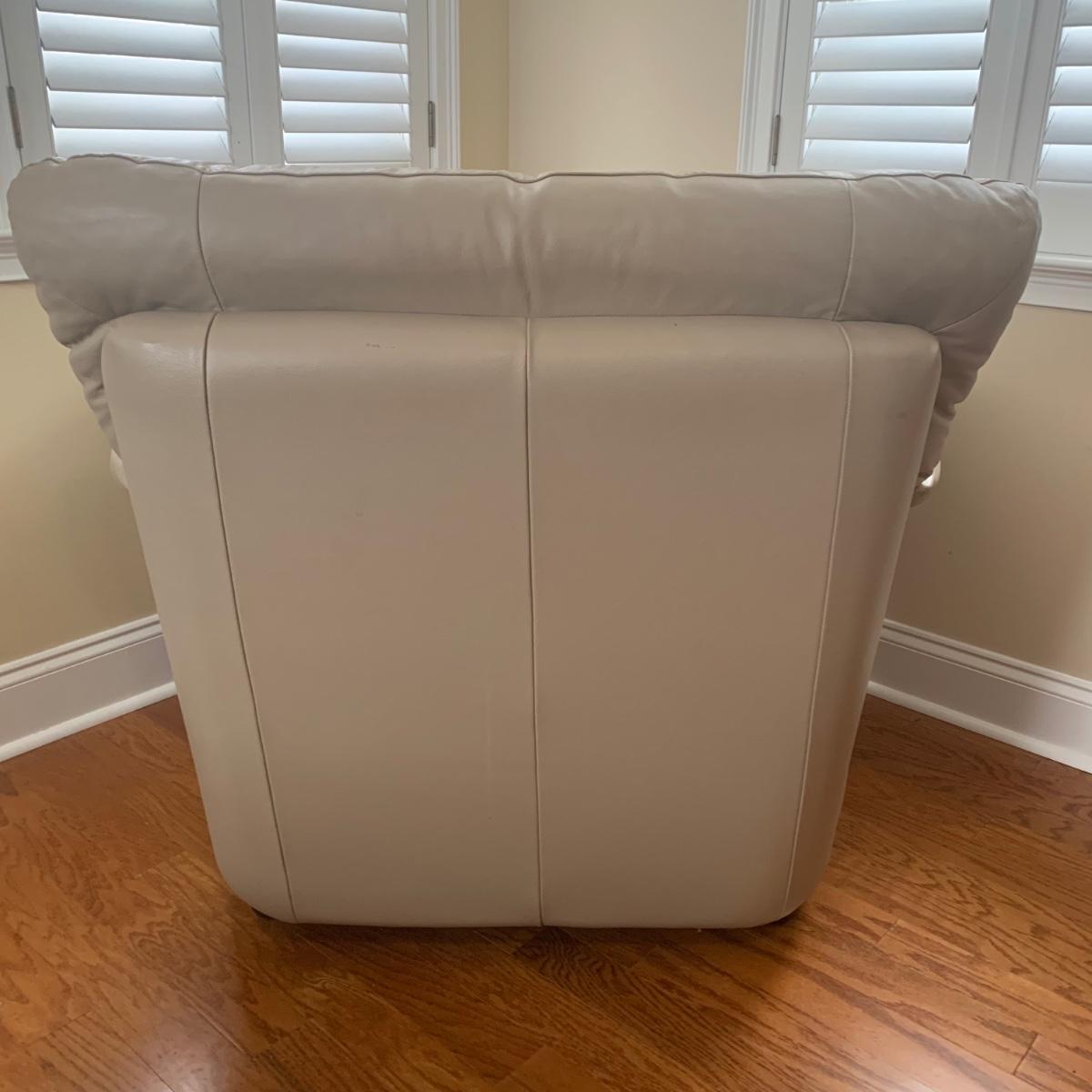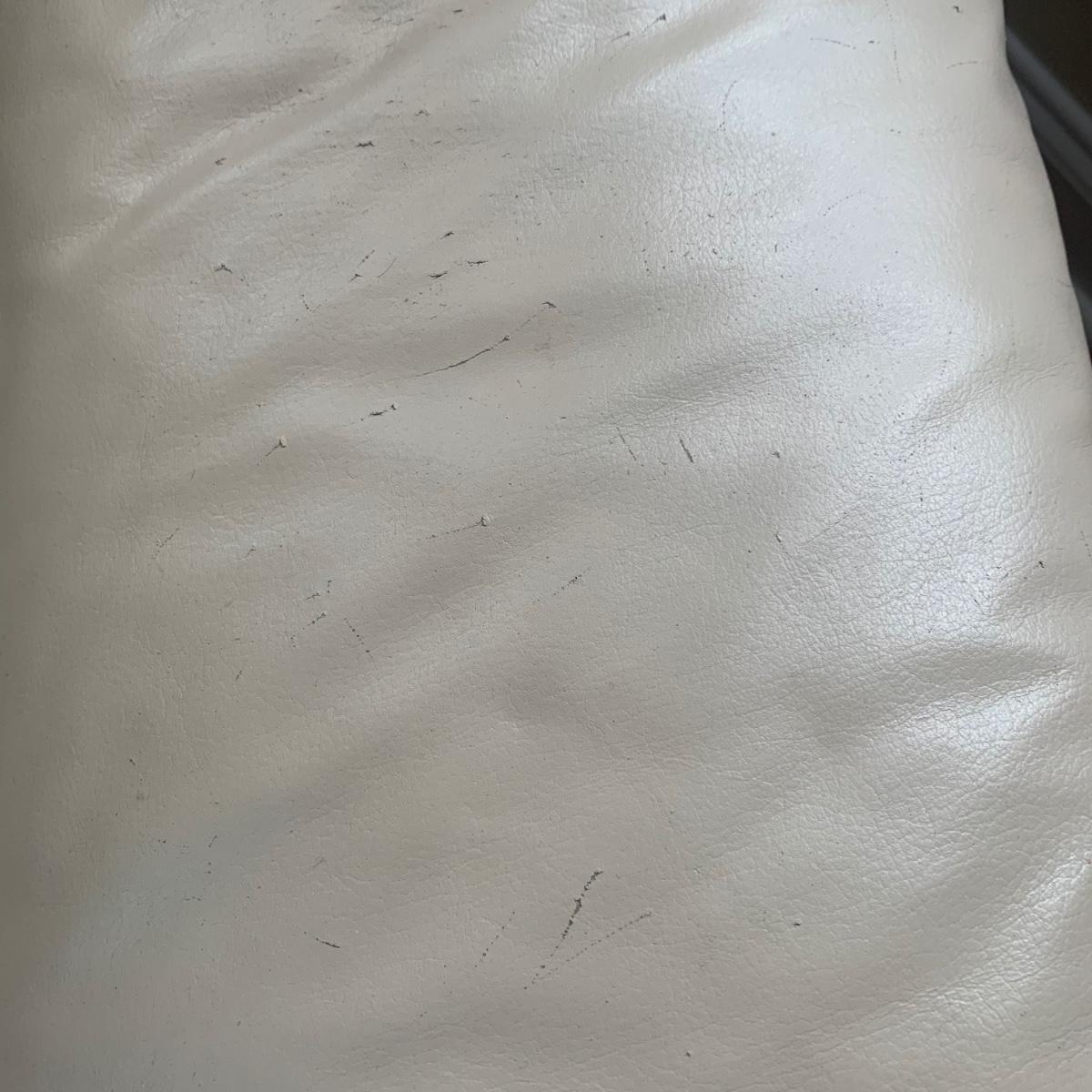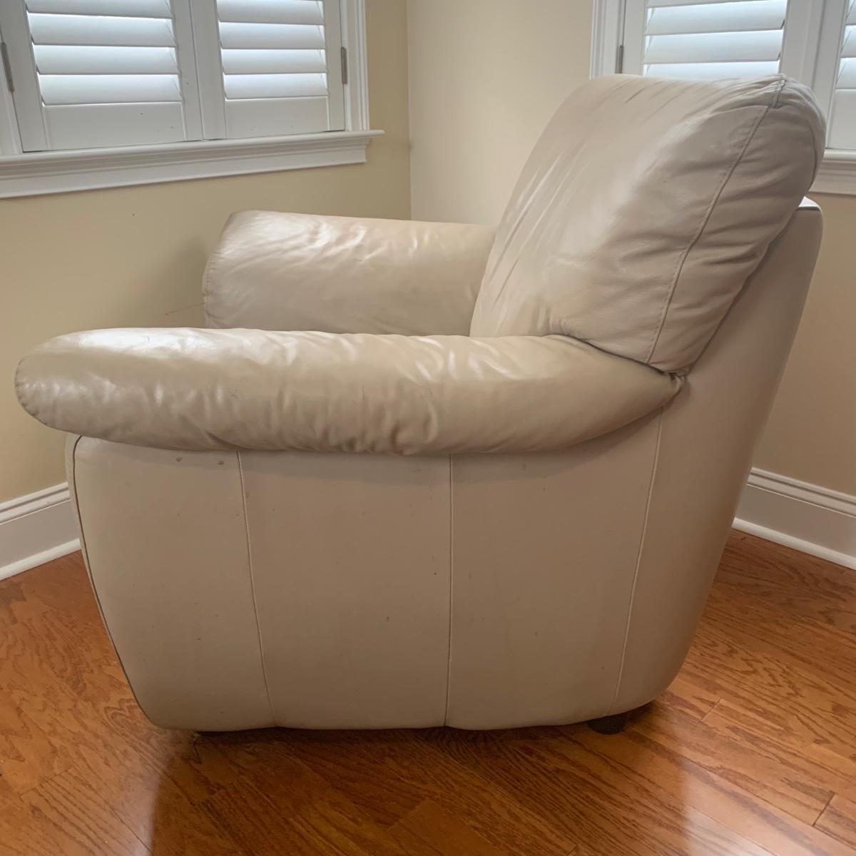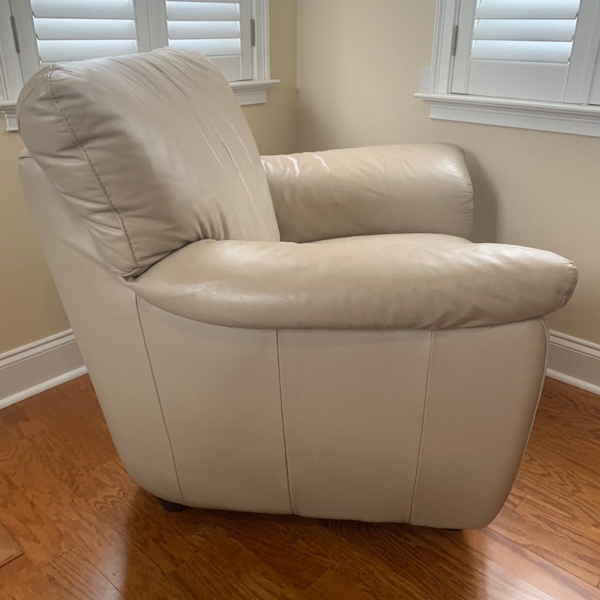 Chair that appears to be faux leather with matching ottoman. Exterior does have small blemishes and chair has small tear. However this piece is sturdy. Chair measures 41” x 34” x 35.5”H with a seat height of 17.5”H. Ottoman measures 27.5” x 19” x 18”H. This chair and ottoman are part of a set. There is a matching loveseat and sofa also found in this auction. Although no tag is found on this chair and ottoman, they appear to completely match the other pieces with tags showing they are from Chateau d’Ax.
