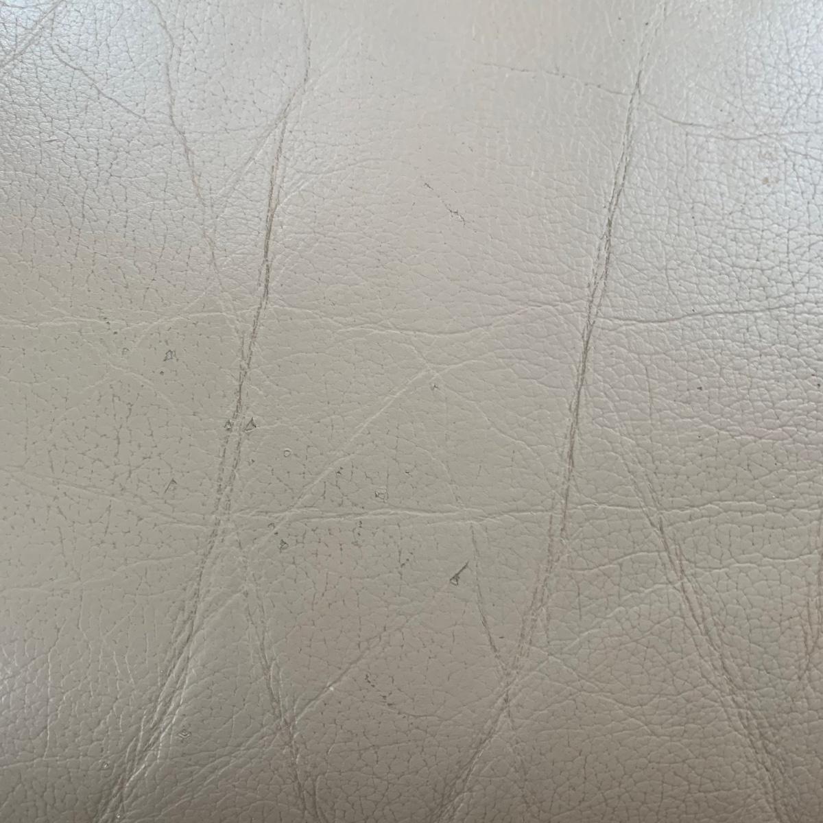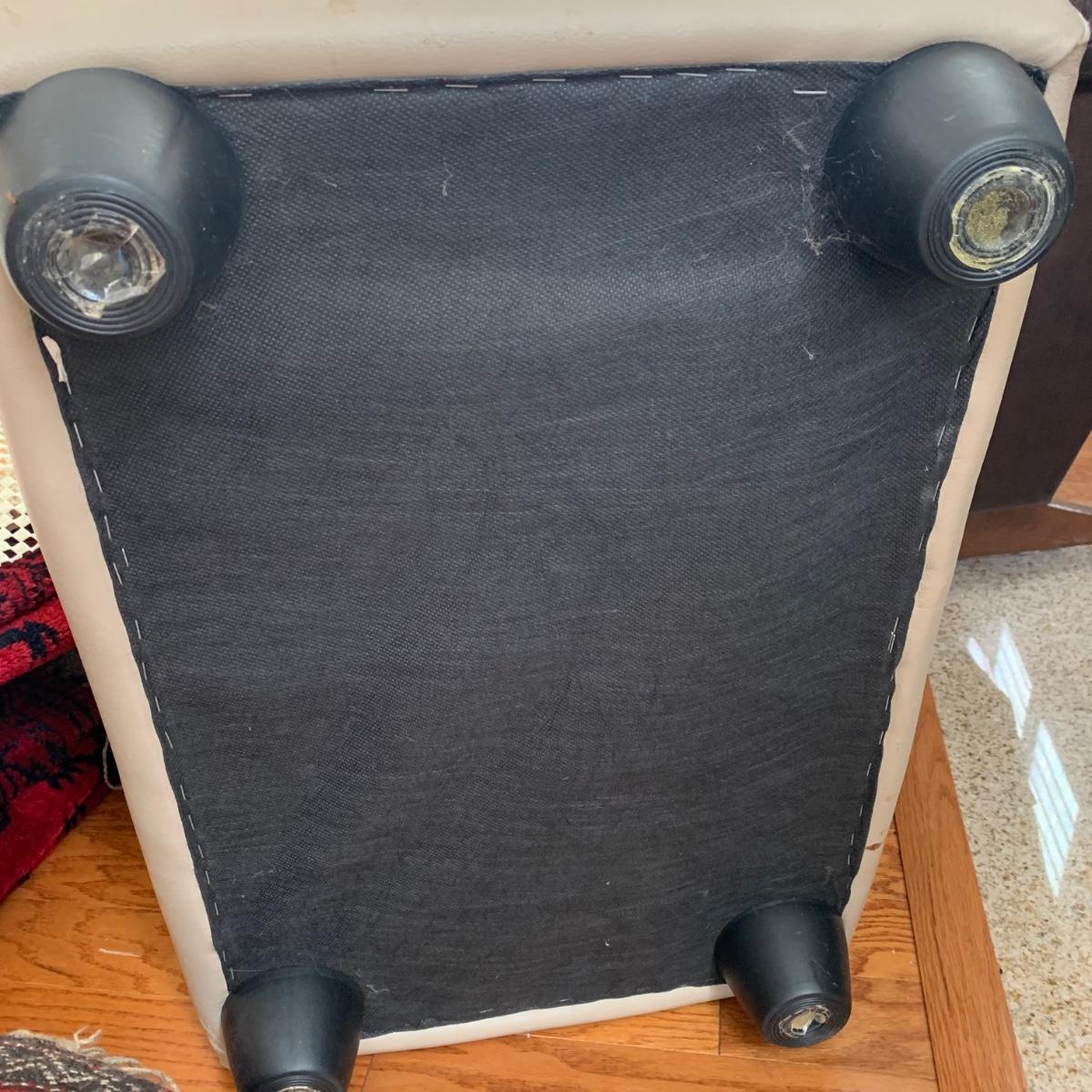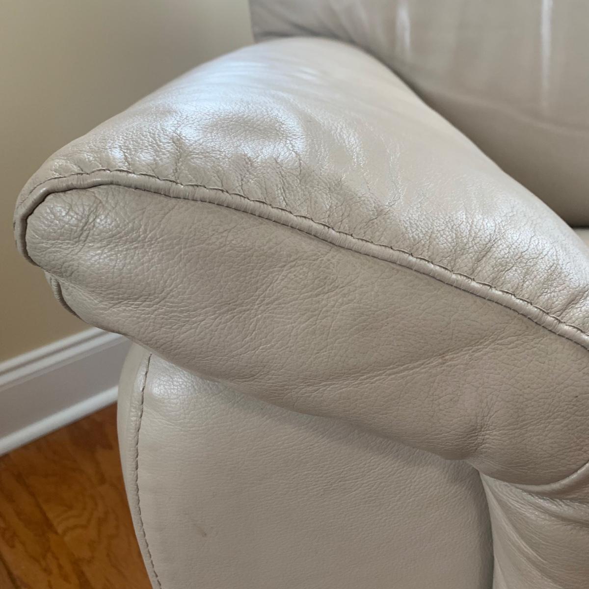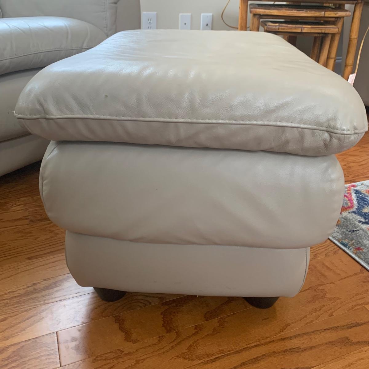 Chair that appears to be faux leather with matching ottoman. Exterior does have small blemishes and chair has small tear. However this piece is sturdy. Chair measures 41” x 34” x 35.5”H with a seat height of 17.5”H. Ottoman measures 27.5” x 19” x 18”H. This chair and ottoman are part of a set. There is a matching loveseat and sofa also found in this auction. Although no tag is found on this chair and ottoman, they appear to completely match the other pieces with tags showing they are from Chateau d’Ax.