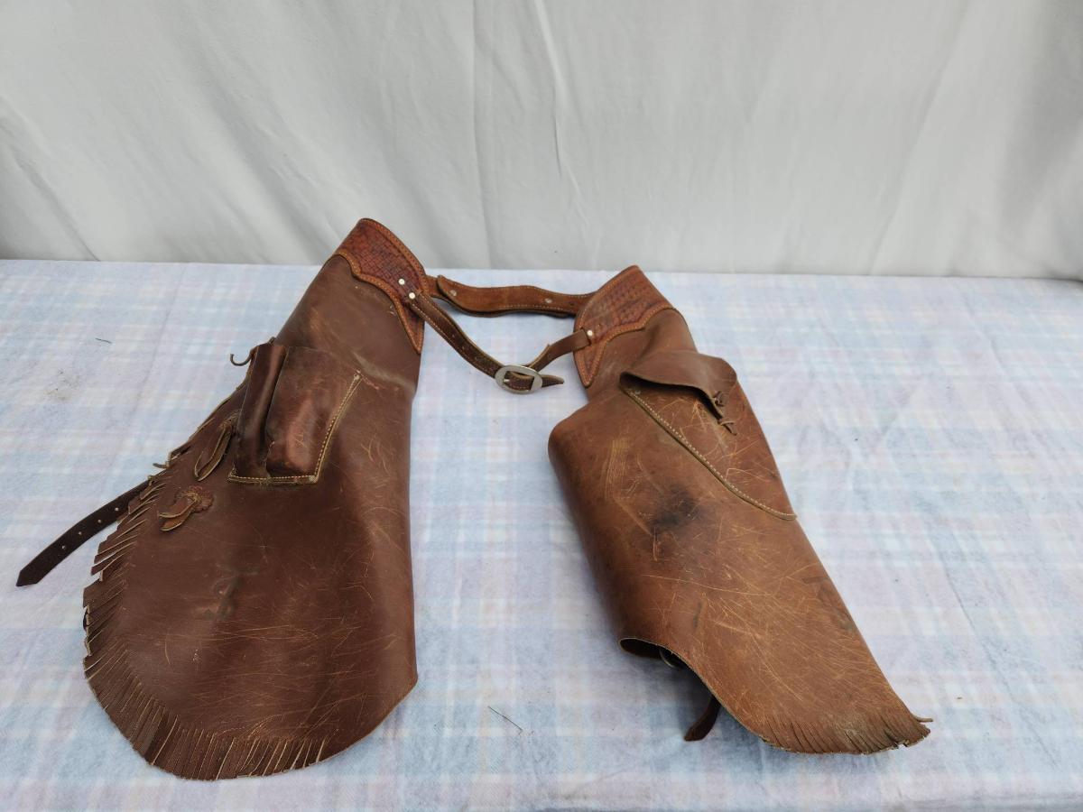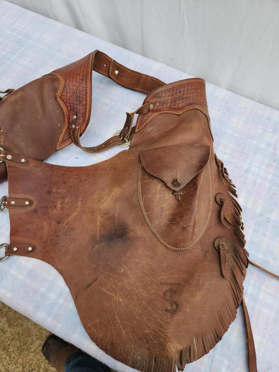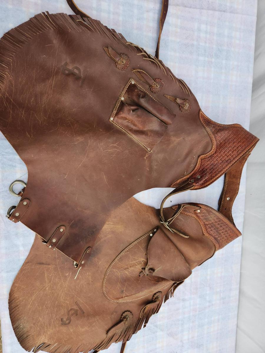 Rugged leather chaps featuring fringe accents and a utility pocket. Adjustable buckle straps ensure a customizable fit. The leather shows visible signs of use and wear, including scuff marks and discoloration, indicating prior practical use. The chaps are equipped with sturdy hardware, including rivets and stitching, ensuring durability. Ideal for Western wear or riding activities.