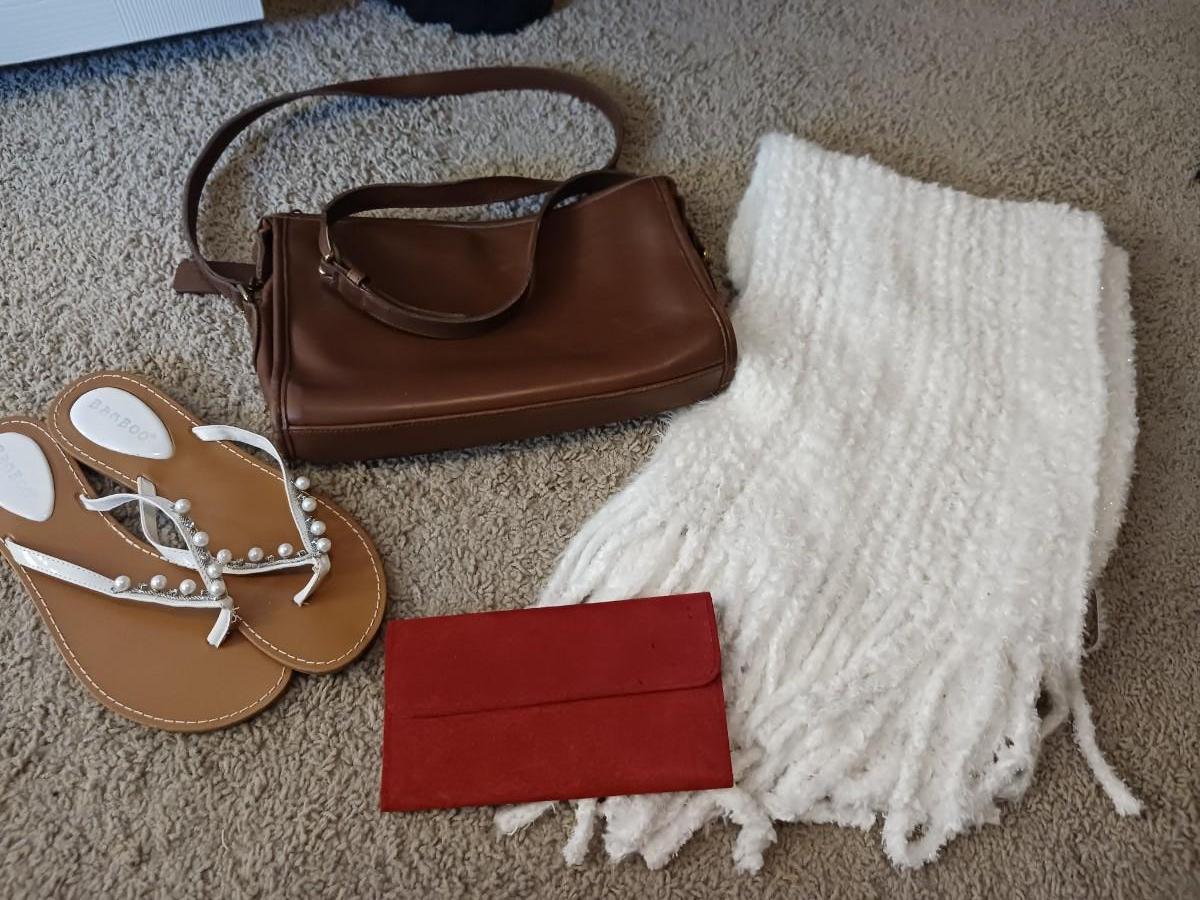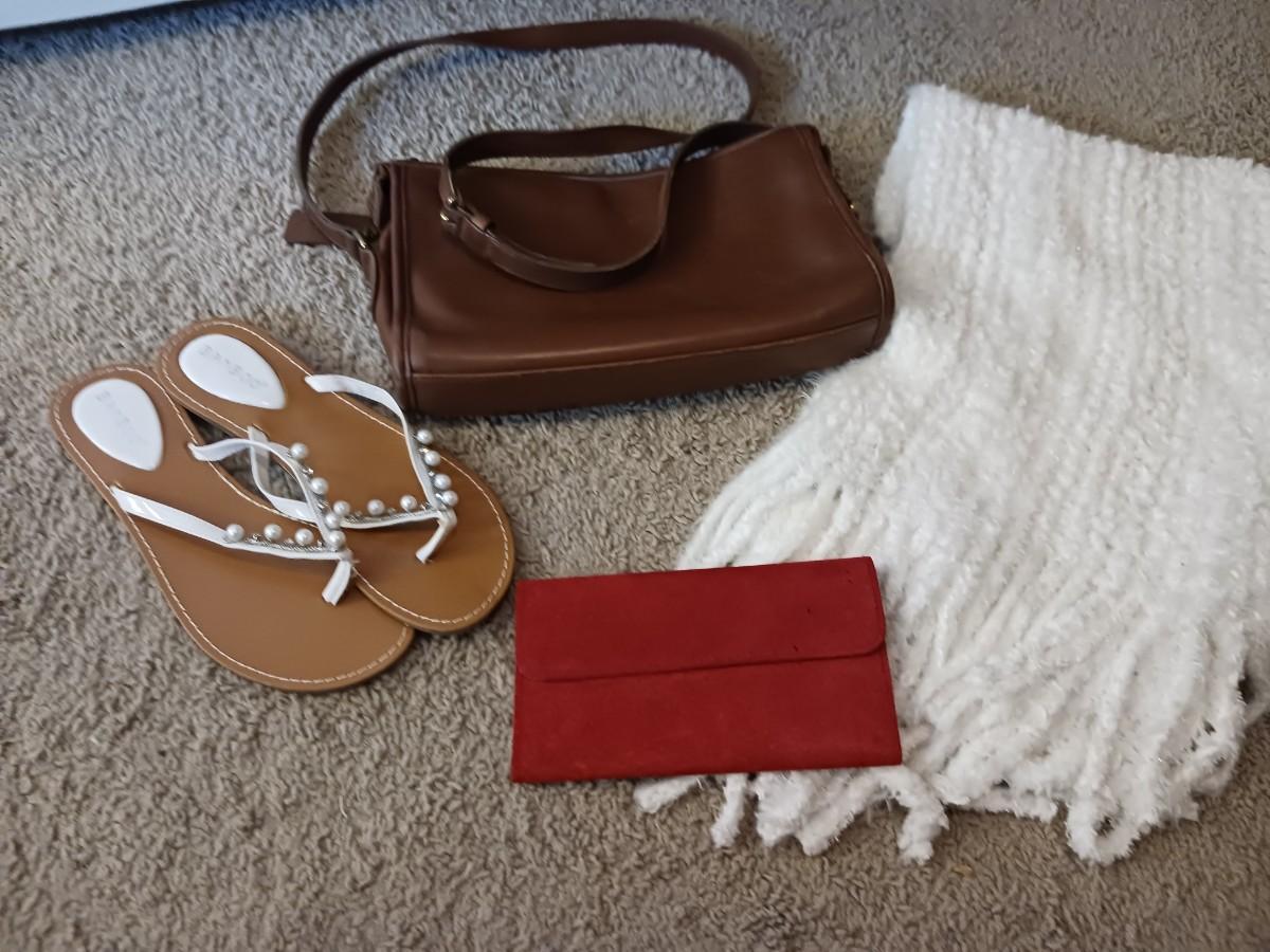 LEATHER COACH PURSE, SANDALS, WALLET AND SCARF
