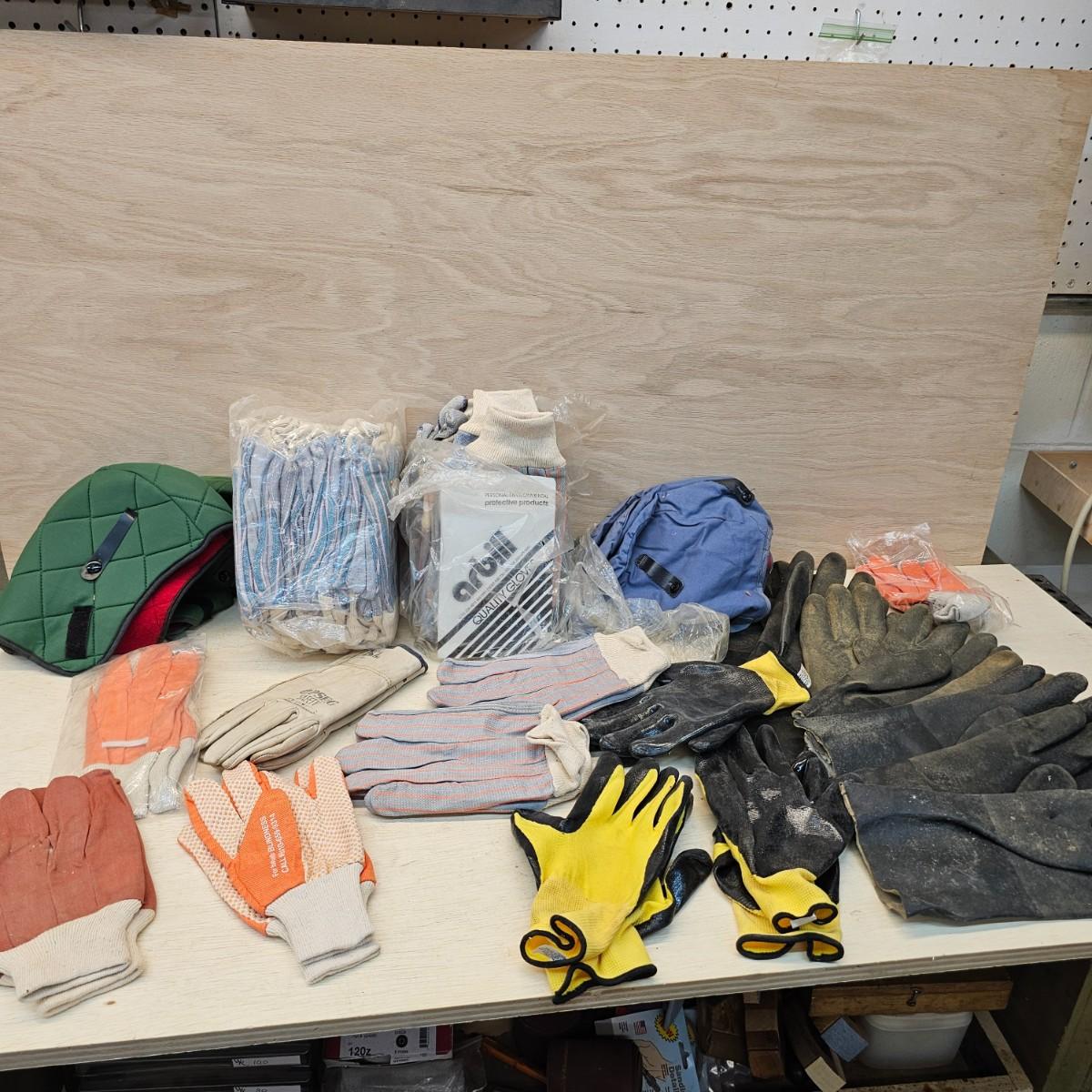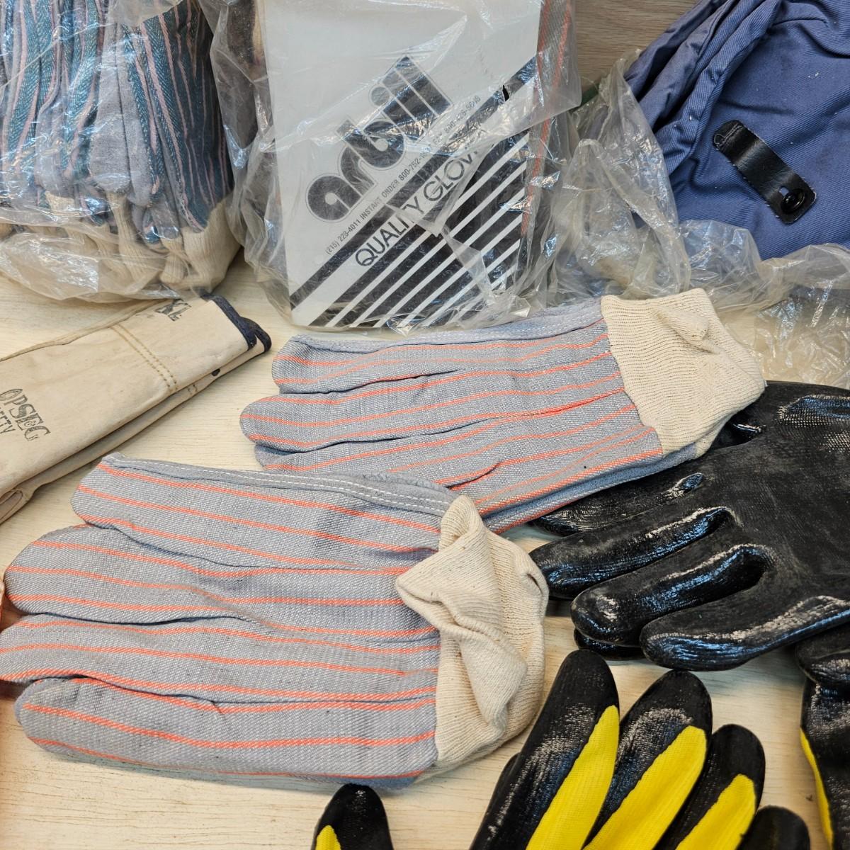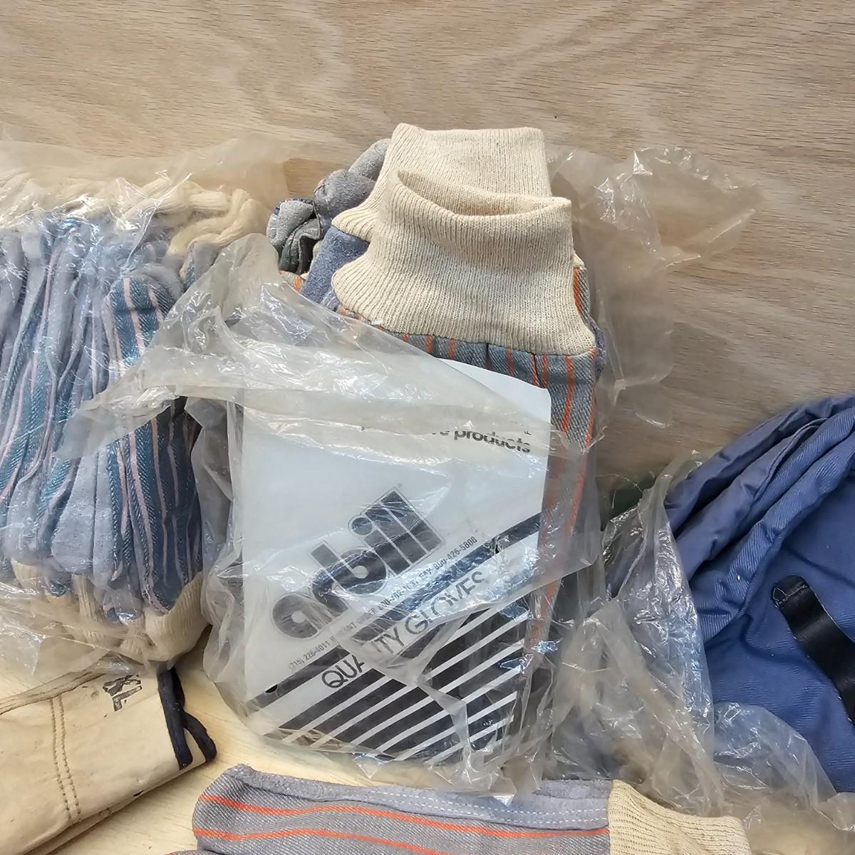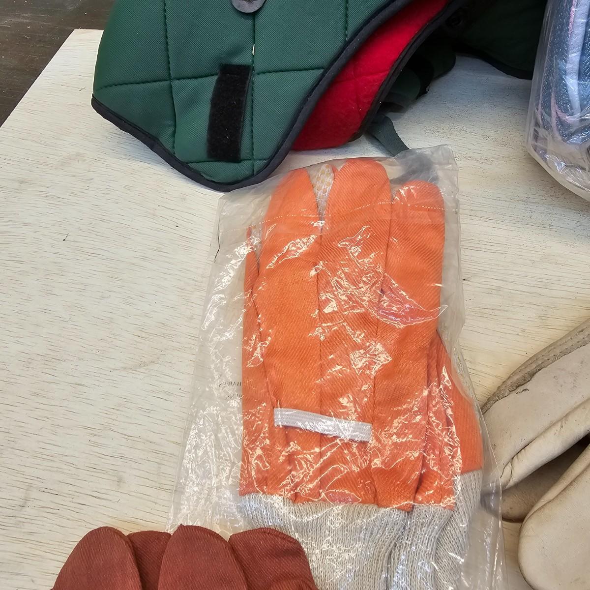Several different types of work gloves. Cotton, leather, leather palm and cotton, polyester nitrile coated, more. Over 35 pair, some still new in package. Sizes L to XL. Also six fire retardant caps with chin straps. See photos for details. Shipping available.