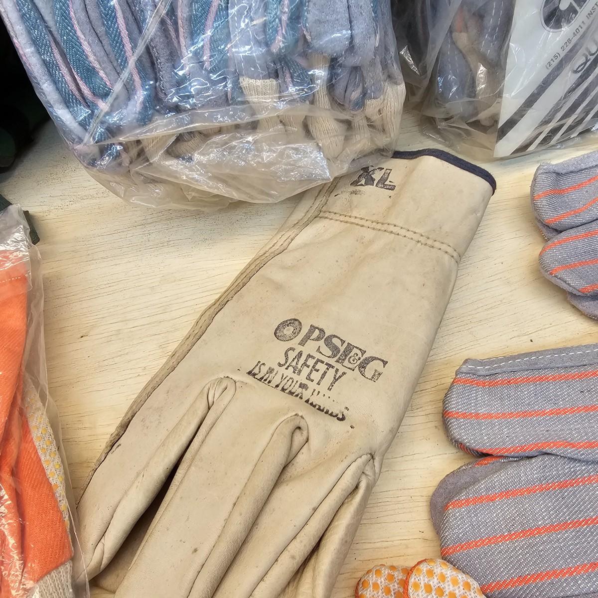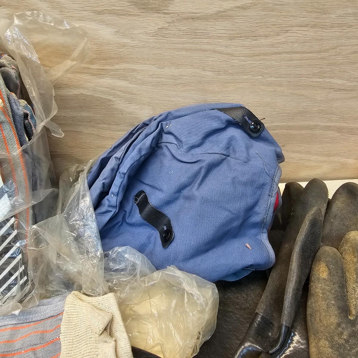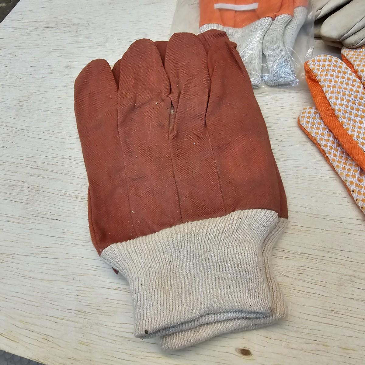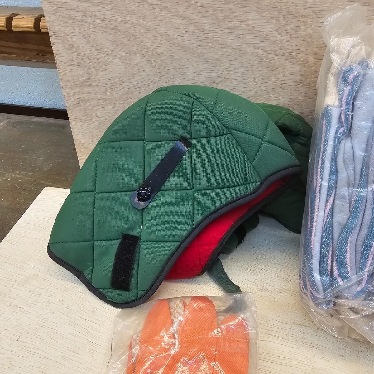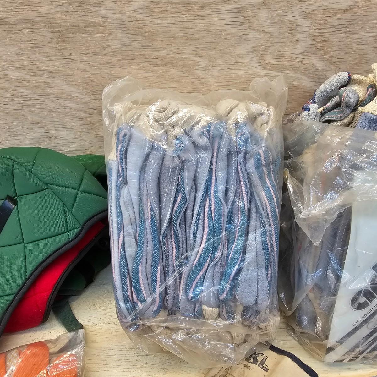 Several different types of work gloves. Cotton, leather, leather palm and cotton, polyester nitrile coated, more. Over 35 pair, some still new in package. Sizes L to XL. Also six fire retardant caps with chin straps. See photos for details. Shipping available.
