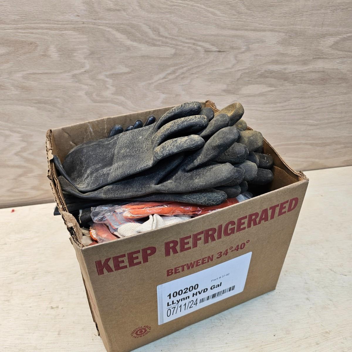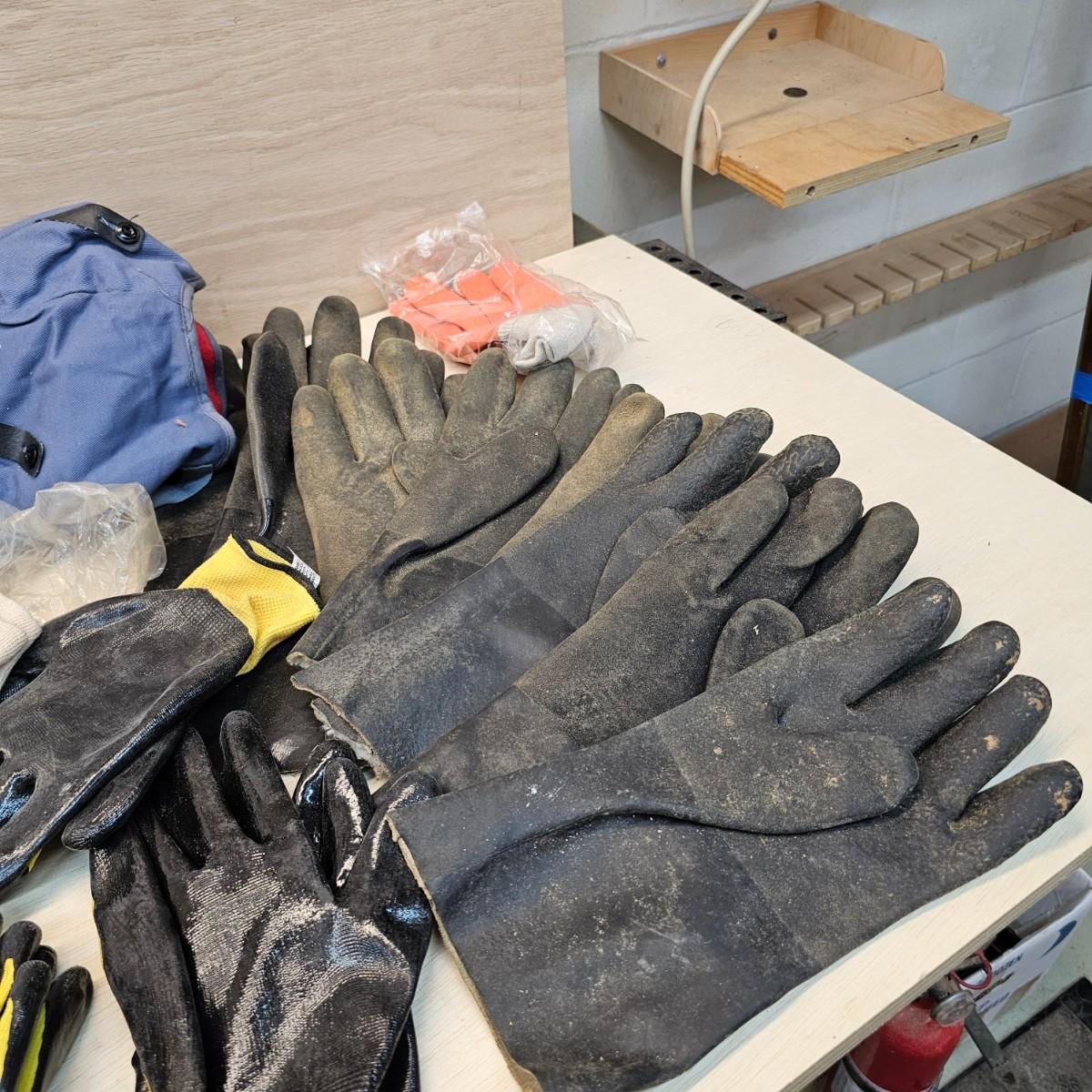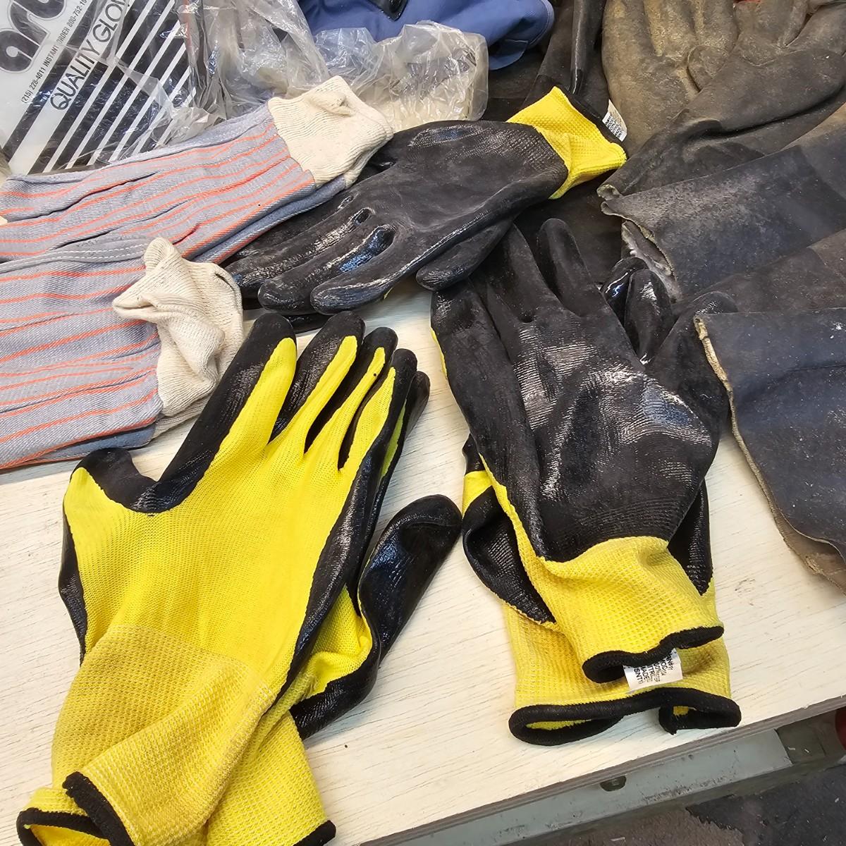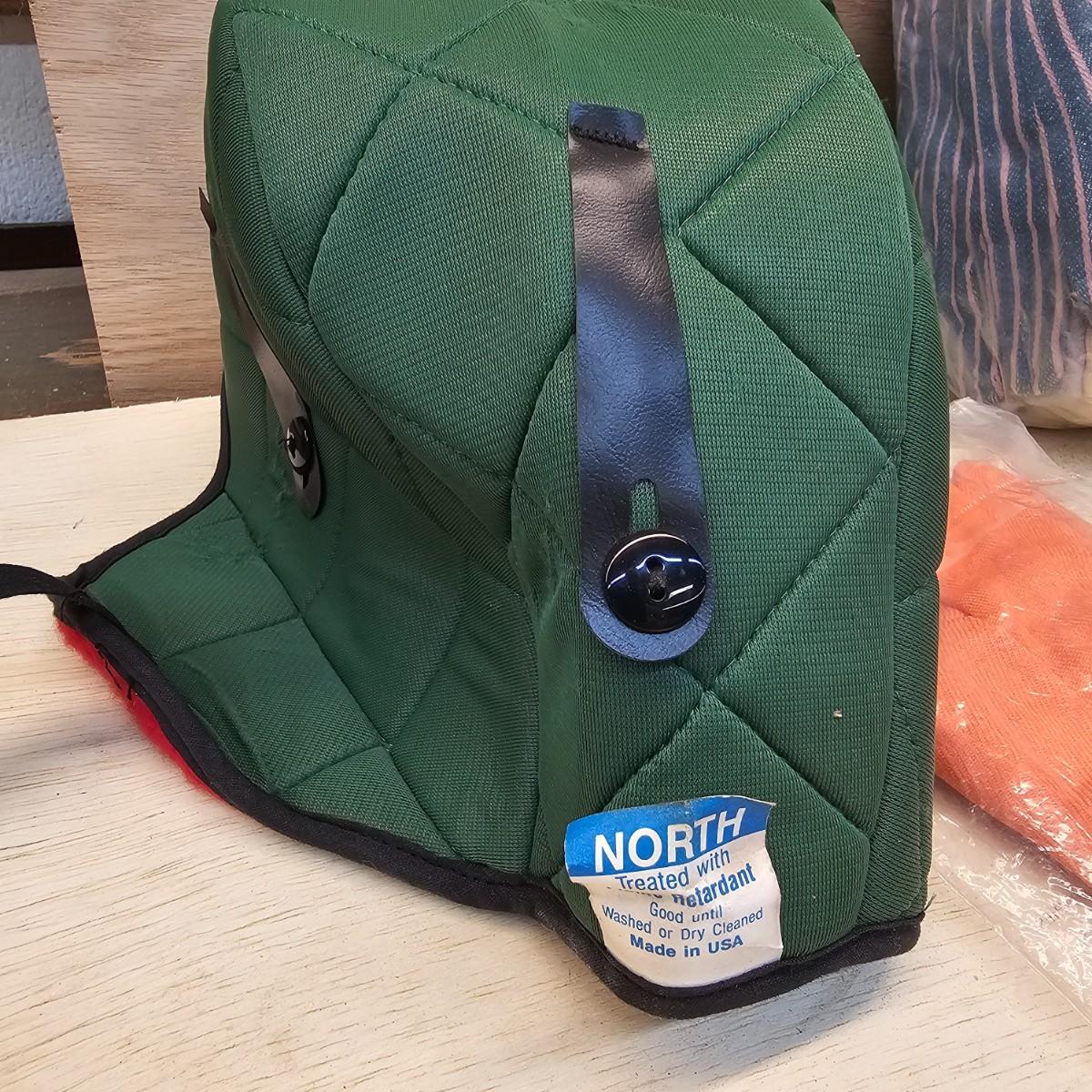 Several different types of work gloves. Cotton, leather, leather palm and cotton, polyester nitrile coated, more. Over 35 pair, some still new in package. Sizes L to XL. Also six fire retardant caps with chin straps. See photos for details. Shipping available.