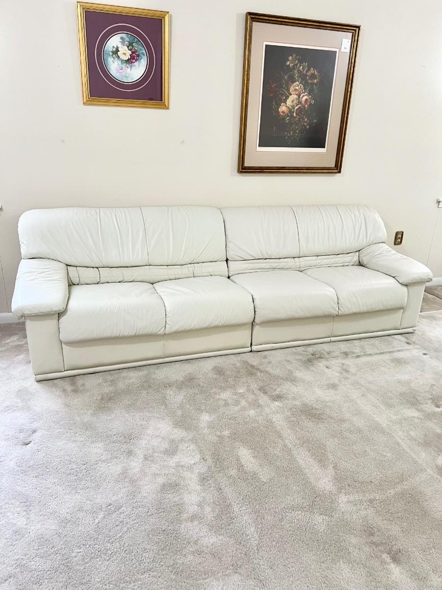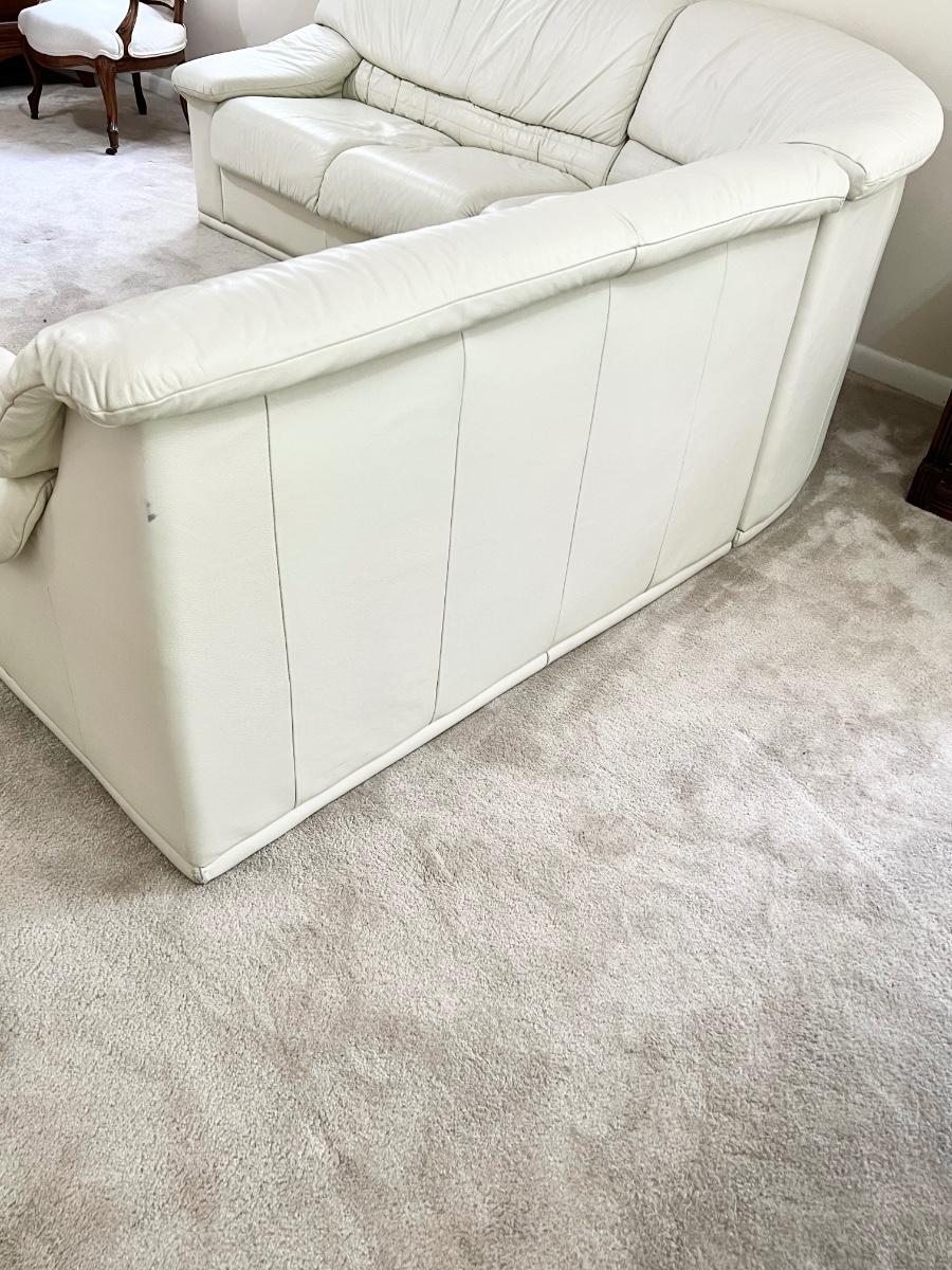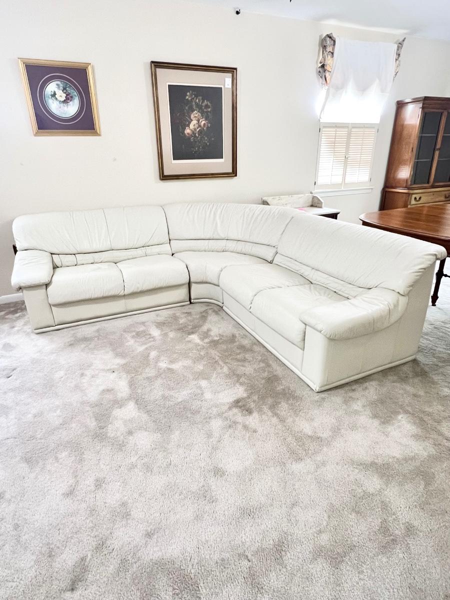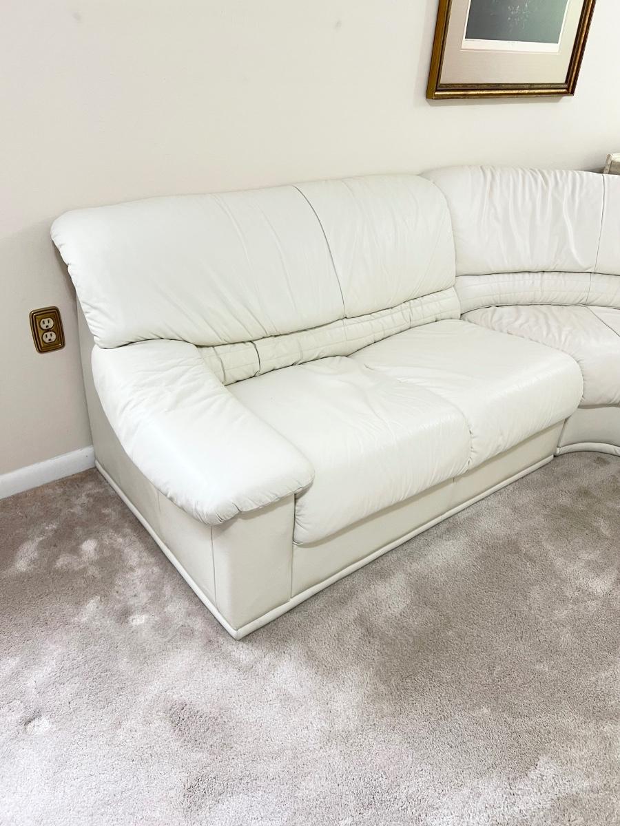 Super soft ~ Couch does have feet, just can't be seen with the carpet ~ Cushions are not removable ~ *Couch has a few minor surface scratches ~ Overall Excellent Condition ~ Couch with all pieces = 29” H x 91” W (from wall) x 34” D ~ Seat to floor = 16” H ~ Couch without middle section, as pictured = 104” W ~