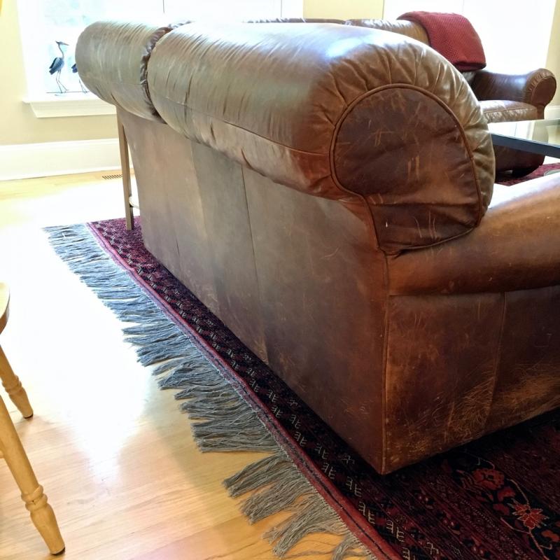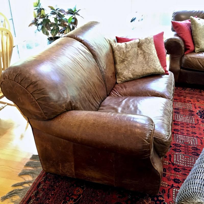 Beautiful seasoned leather couch, "Havana" by Domain Home Fashions. Very comfortable and ready for a new home. Original price $1700. There are 2 available. ***DIMENSIONS: 65"L X 40"D X 35"H | CONDITION: Good, leather has some minor scratches at the bottom end*** Local pick up only, Newtown CT