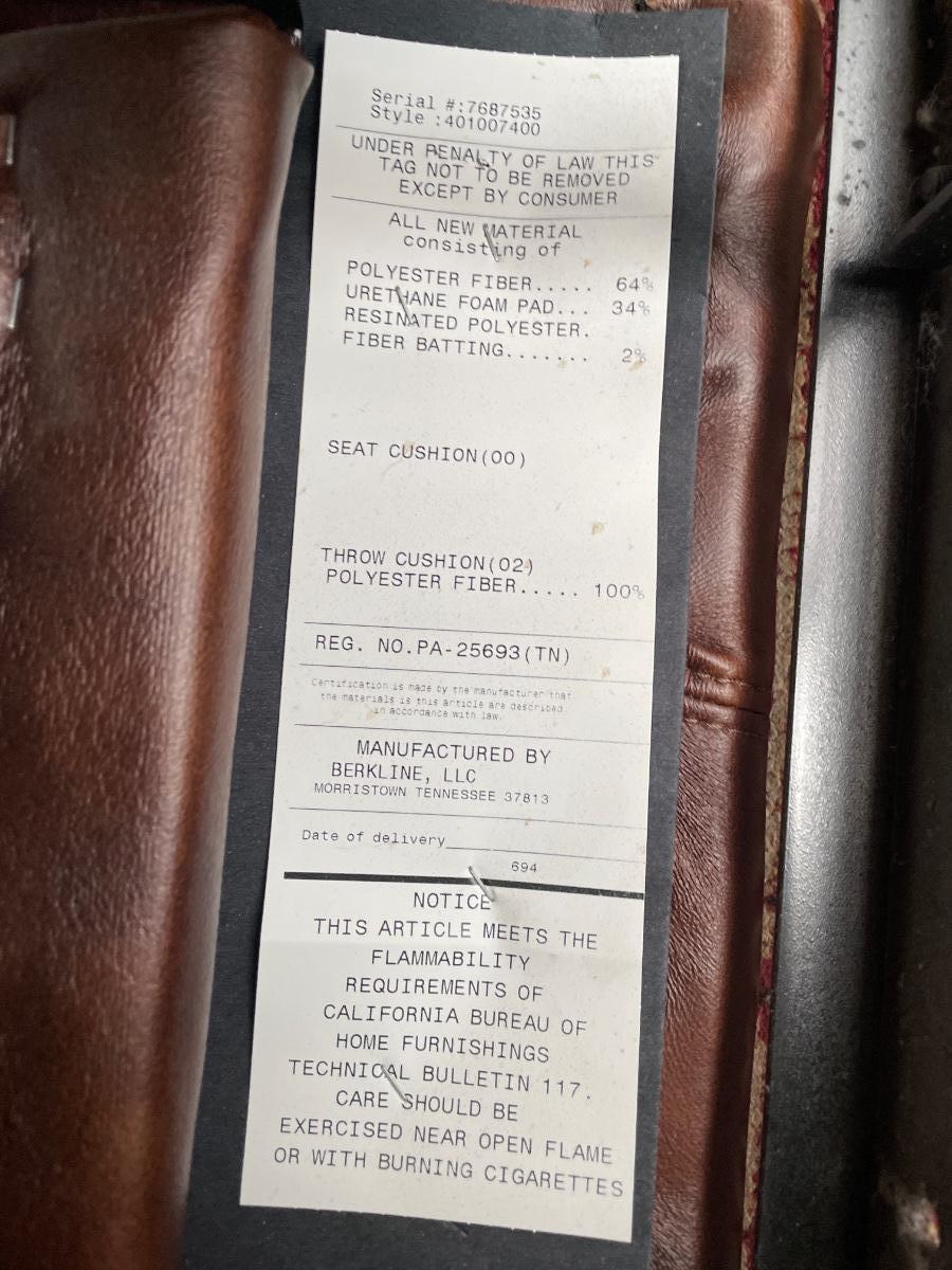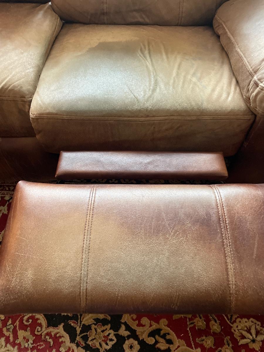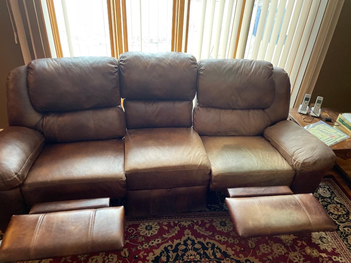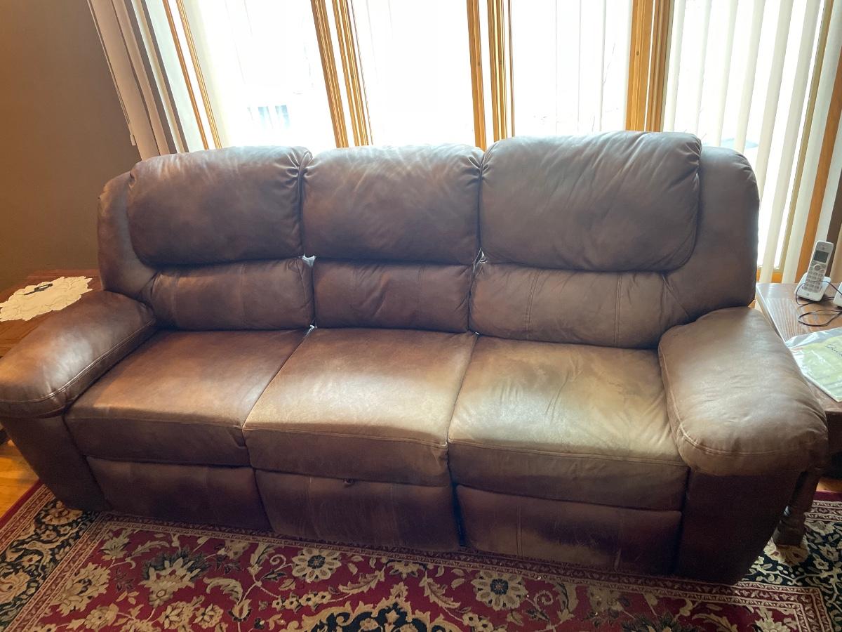Polyester Fiber couch with recliners by Berkline. There are recliners on the ends. Includes a storage drawer in the middle. Has some wear on it. Dimensions are 8’ long x 3’ wide x 3’ 4” tall.