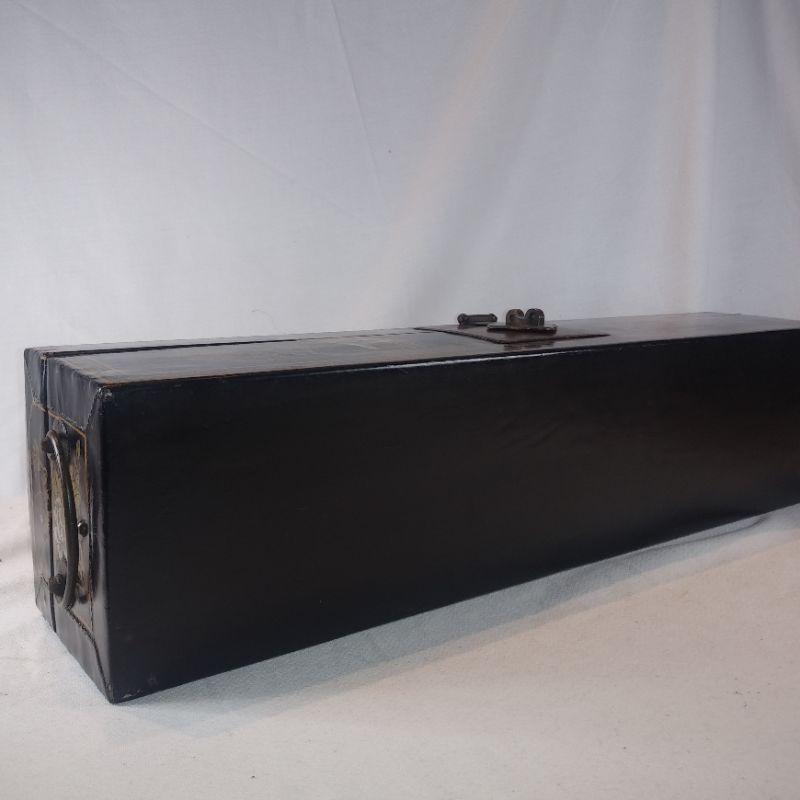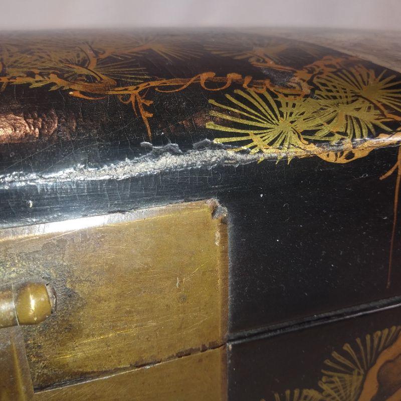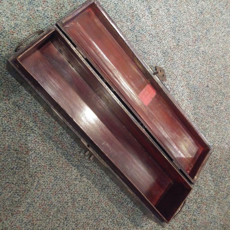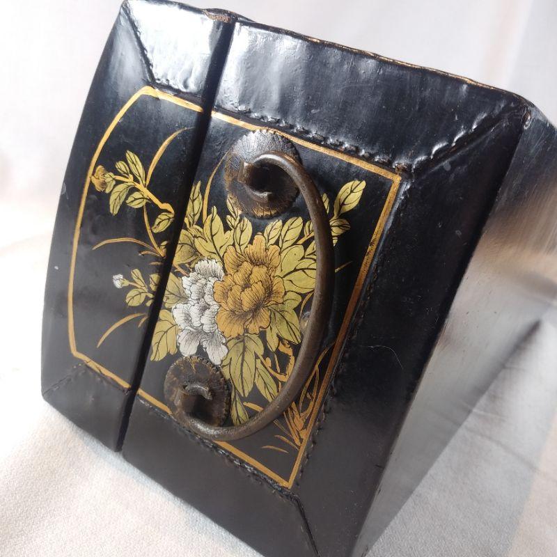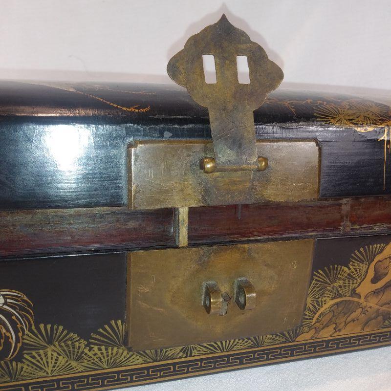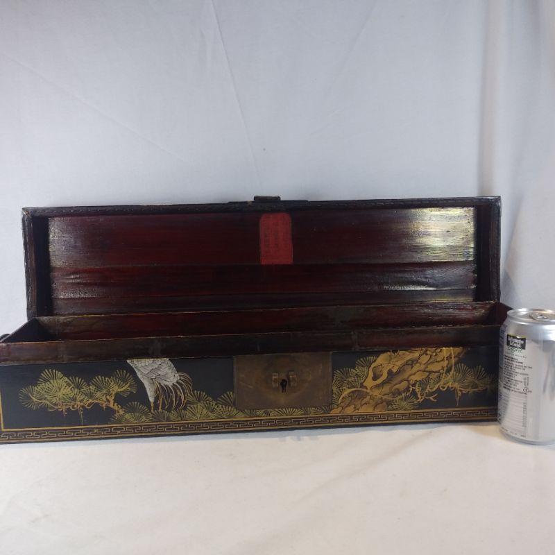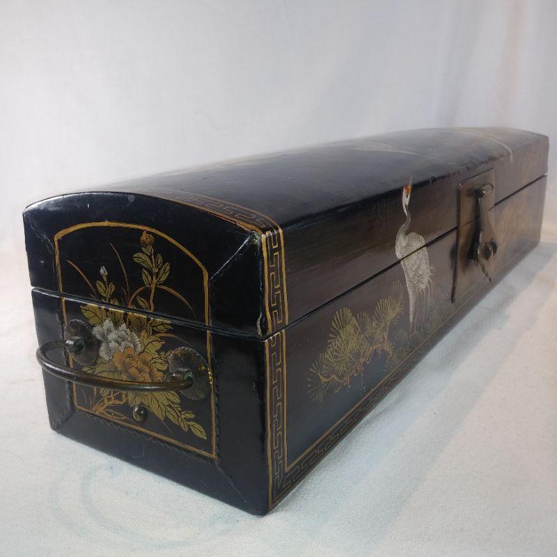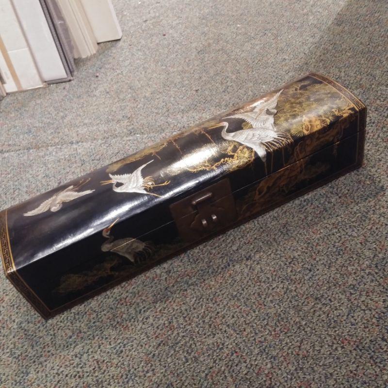 This is a wooden, covered-in-leather, arch-topped Asian Pillow Box. It has a beautifully hand-painted Heron scene on its exterior. Hardware is also quite wonderful. There is a scuff on the leather just above the front hardware but it doesn't take away from it's beauty. It measures 23 1/4-inches long X 6-inches deep X 5 1/2-inches tall. Prefer Local Pick-up - will ship but it will be expensive to do so. Starting Bid/Reserve is $20.